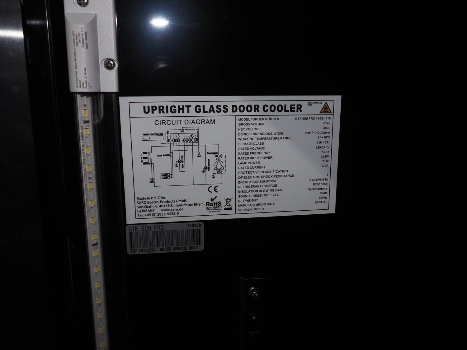 Saro Gastro-Products GmbH refrigerator, model: GTK 600 PRO, year of construction: 04.01.24, 220-240 V, 50 Hz, 2.3 A, 323 W, refrigerant: R290/0.085 kg, weight: 130 kg, capacity: 459 liter, 5 floors, floor dimensions: (5x) 630 mm x 500 mm, total dimensions: 750 mm x 690 mm x 2000 mm.