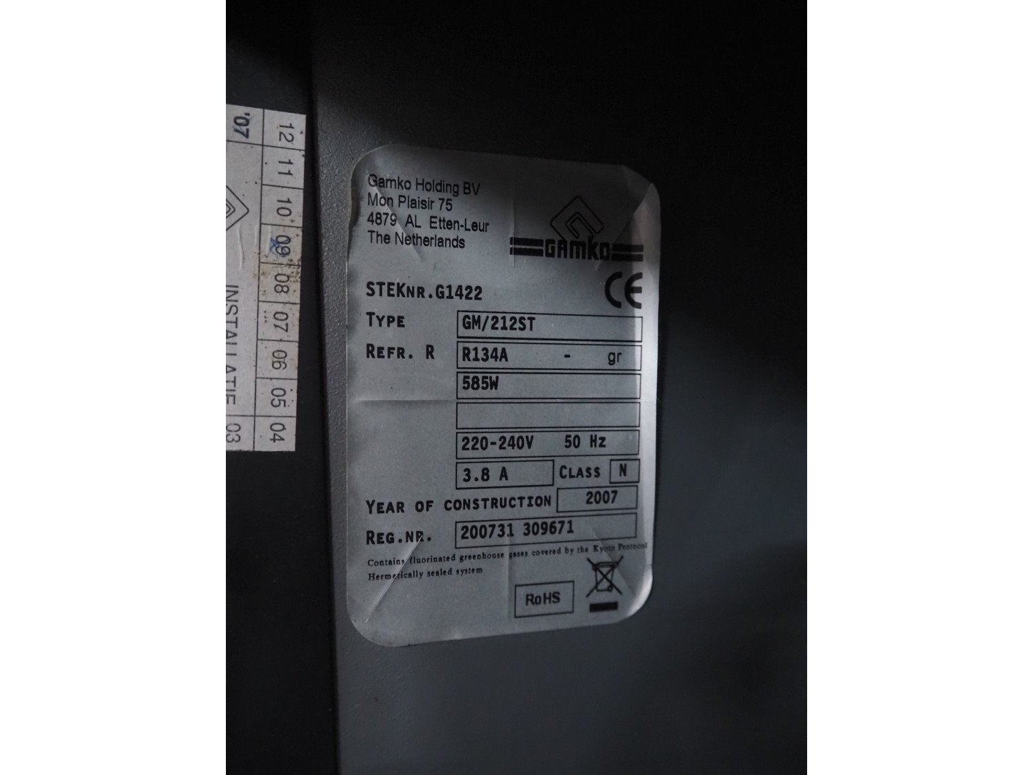 Gamko bottle cooler, type: GM/212ST, year of construction: 2007, 220-240 V, 50 Hz, 3.8 A, 585 W, refrigerant: R134A, dimensions: 1670 mm x 580 mm x 860 mm.