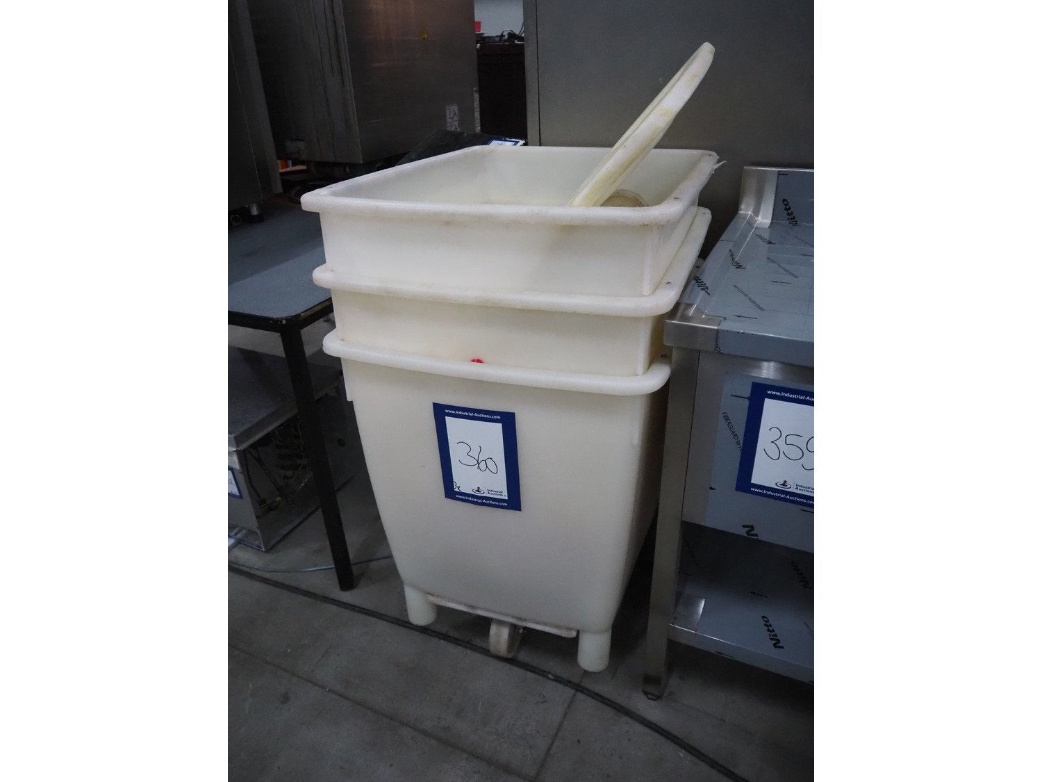 Rollie with 3 plastic tubs, dimensions: (3x) 760 mm x 580 mm x 690 mm.