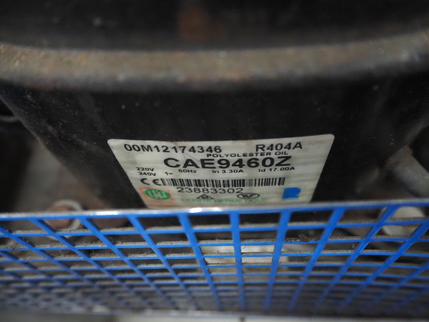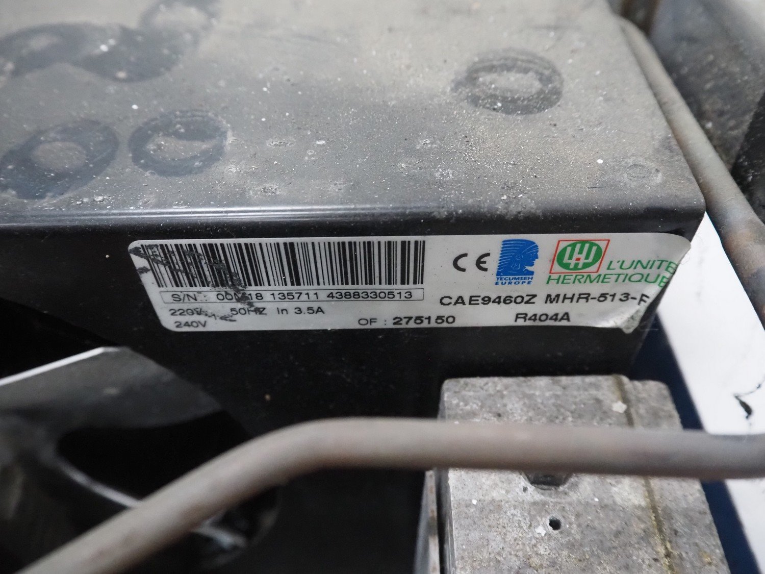 Lúnite Hermetique cooling compressor, model: CAE9460Z MHR-513-F, serial number: 00M18 135711 4388330513, 220-240 V, 50 Hz, 3.5 a, refrigerant: R404A, dimensions: 500 mm x 500 mm x 240 mm.