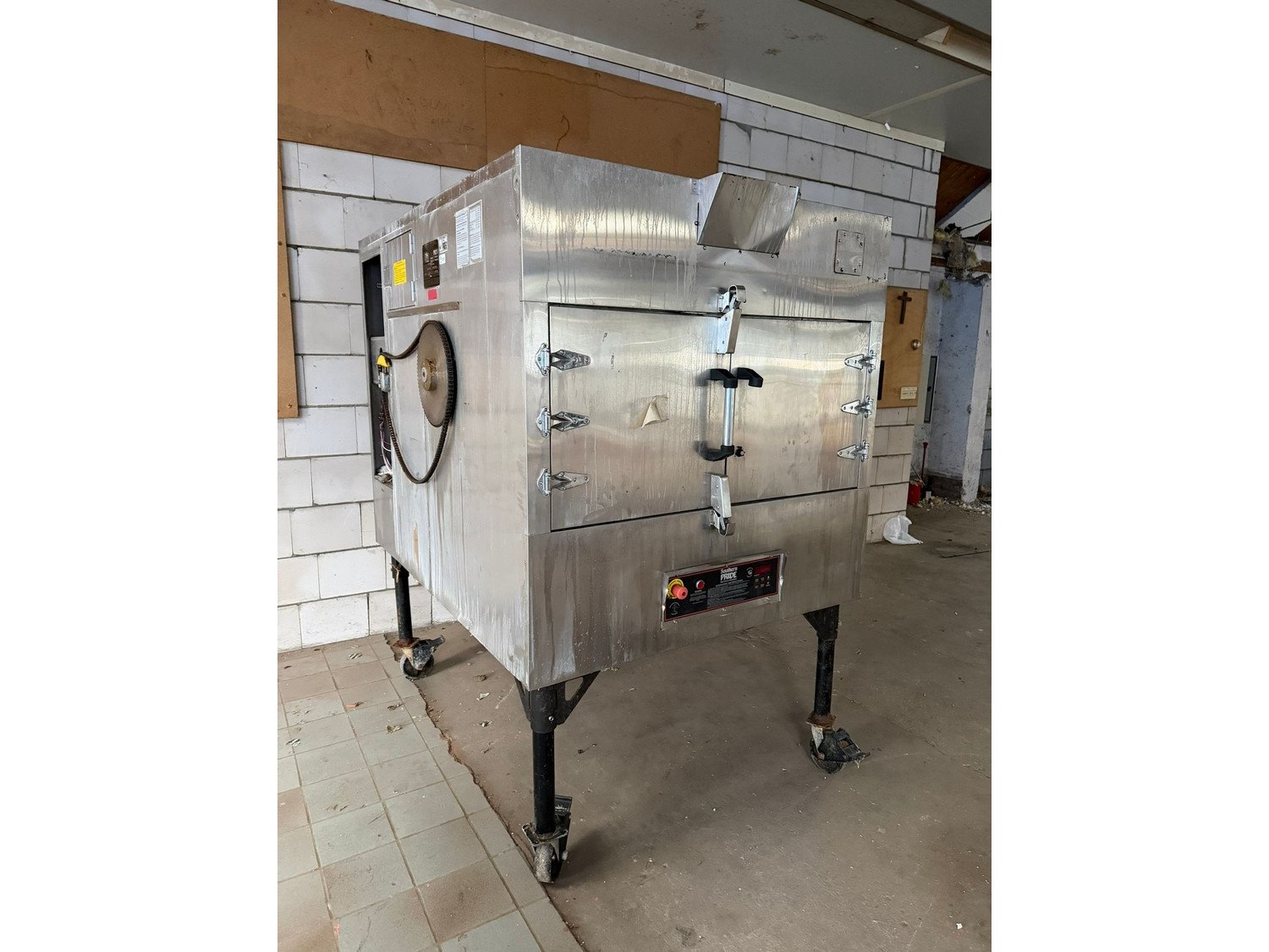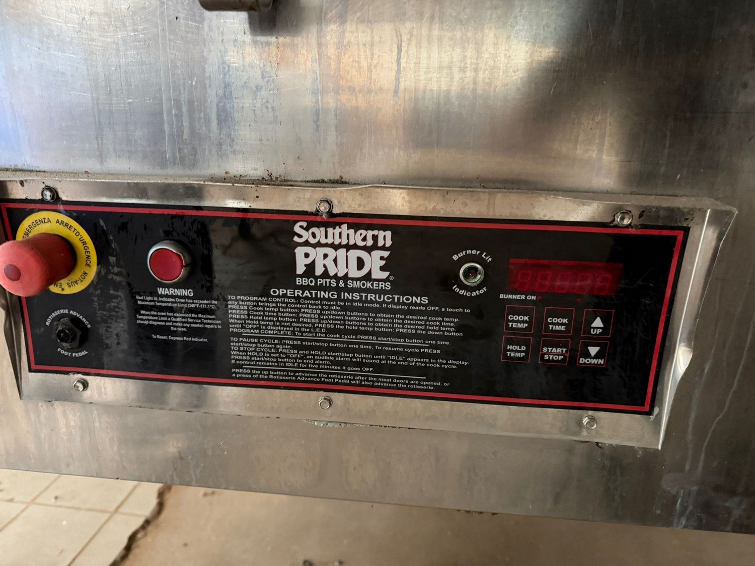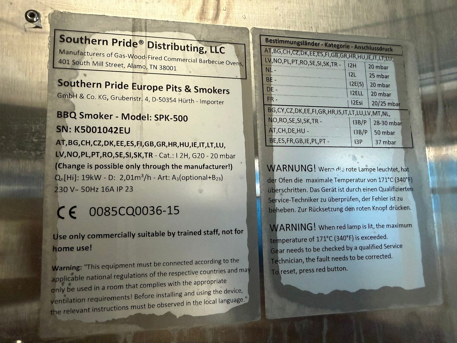 Southern Pride rotisserie smoker, model: SPK-500, serial number: K5001042FU, year of construction: 8/2013, 230 V, 1 Ph, 60 Hz, 5 A, gas heated, dimensions: 1500 mm x 1850 mm x 2000 mm. Incomplete.