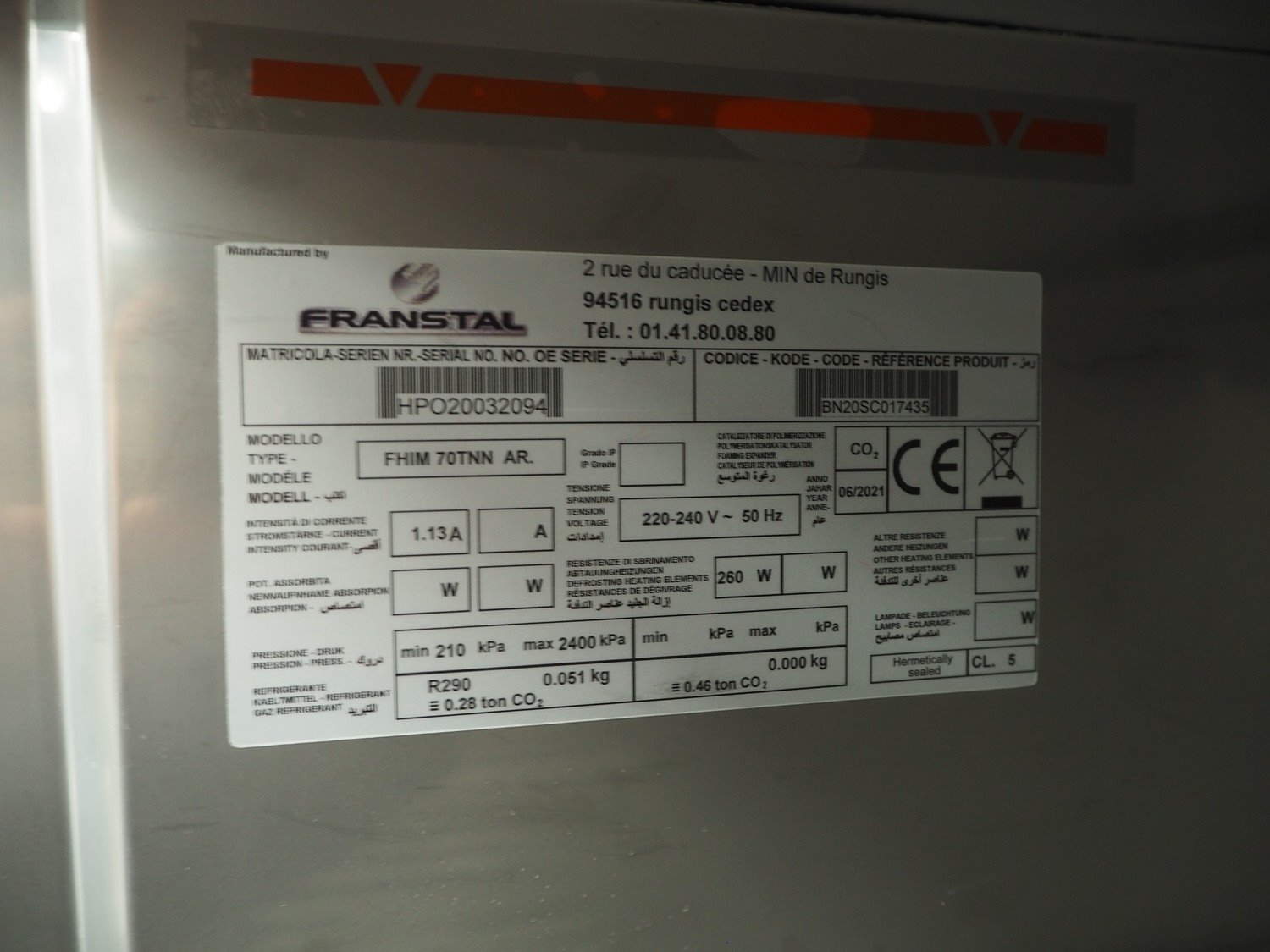 Franstal refrigerator, type: FHIM 70TNN AR., serial number: HPO20032094, year of construction: 2021, 220-240 V, 50 Hz, 1.13 A, 250 W, refrigerant: R290, 3 floors, dimensions each floor: 650 mm x 520 mm, total dimensions: 720 mm x 800 mm x 2000 mm.