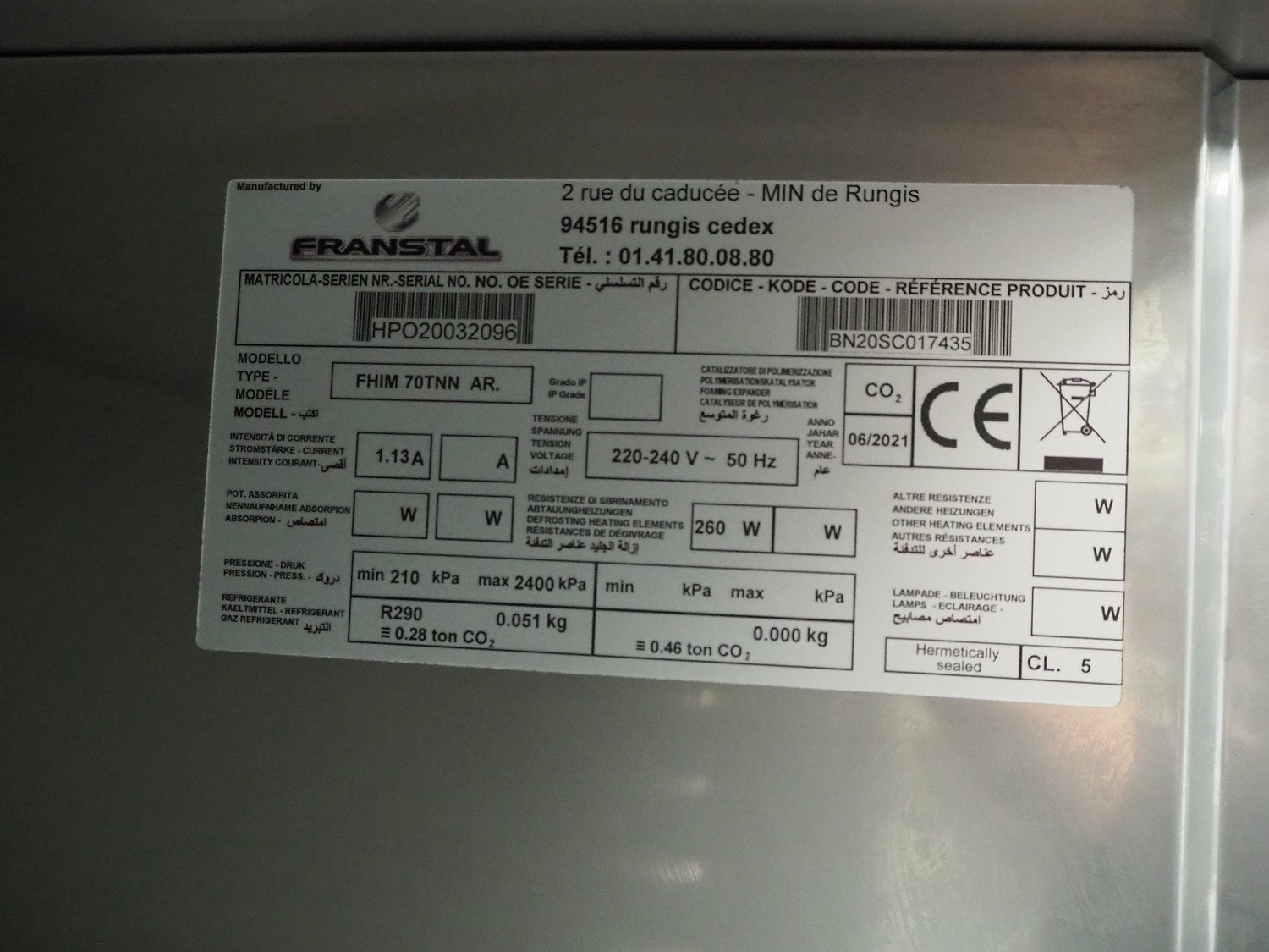 Franstal refrigerator, type: FHIM 70TNN AR., serial number: HPO20032096, year of construction: 2021, 220-240 V, 50 Hz, 1.13 A, 250 W, refrigerant: R290, 2 floors, dimensions each floor: 650 mm x 520 mm, total dimensions: 720 mm x 800 mm x 2000 mm.