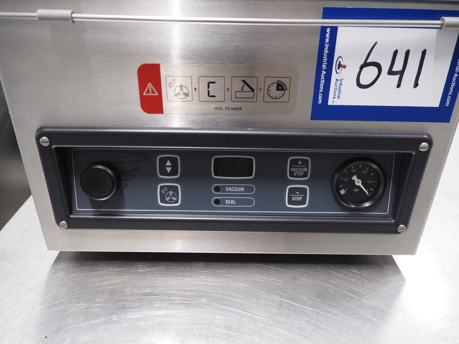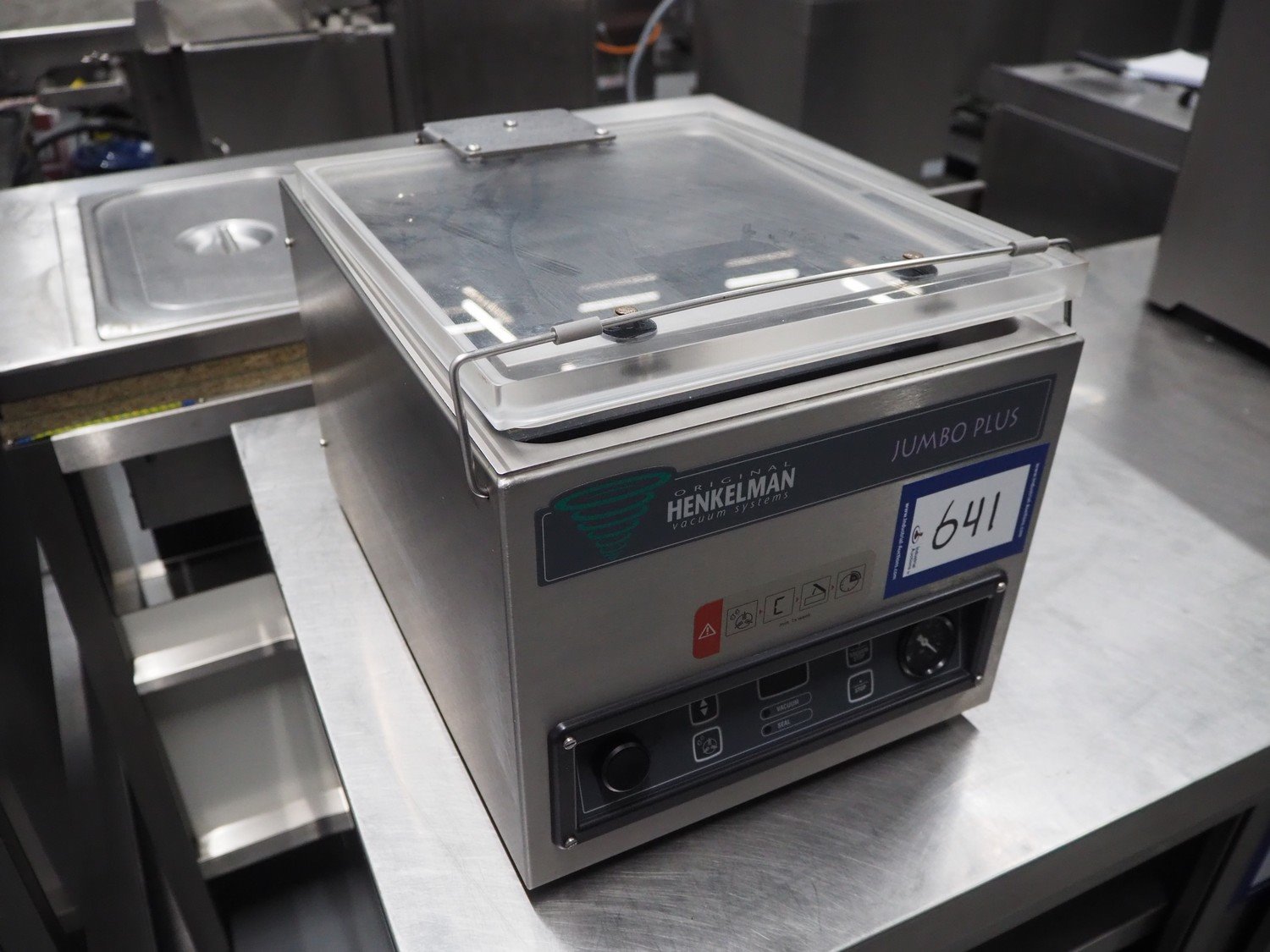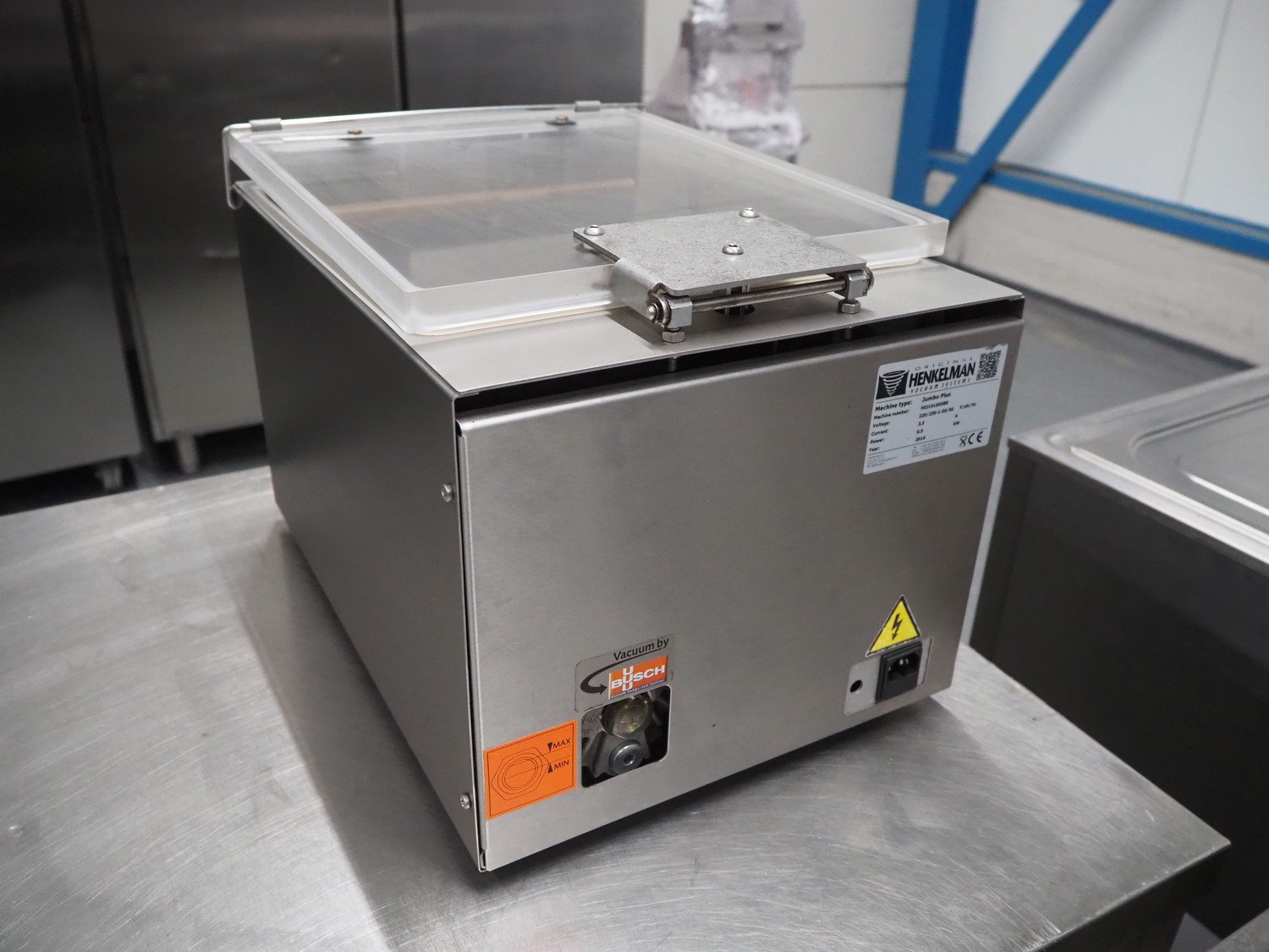 Henkelman vacuum machine, type: Jumbo Plus, machine number: H0J10160588, year of construction: 2016, 220/230 V, 1 Ph, 50/60 Hz, 3.5 A, 0.5 kW, seal length: 280 mm, chamber dimensions: 280 mm x 310 mm, total dimensions: 460 mm x 330 mm x 350 mm.