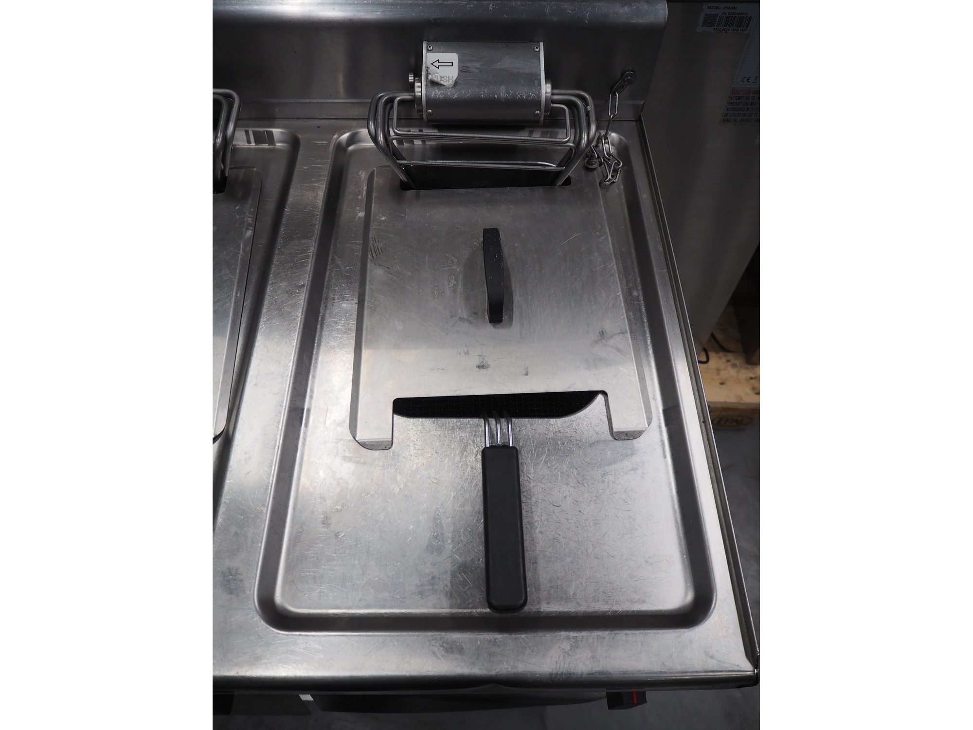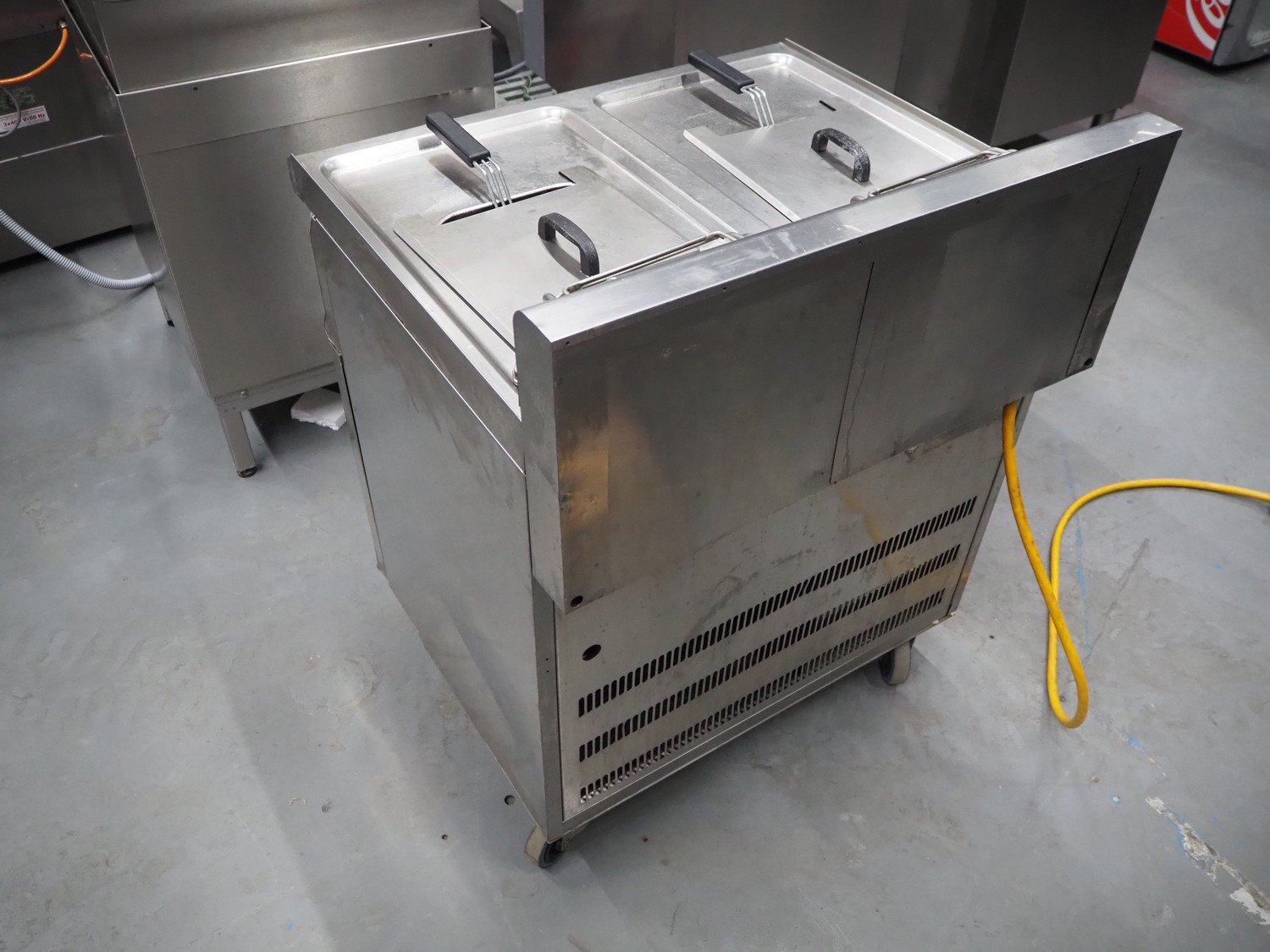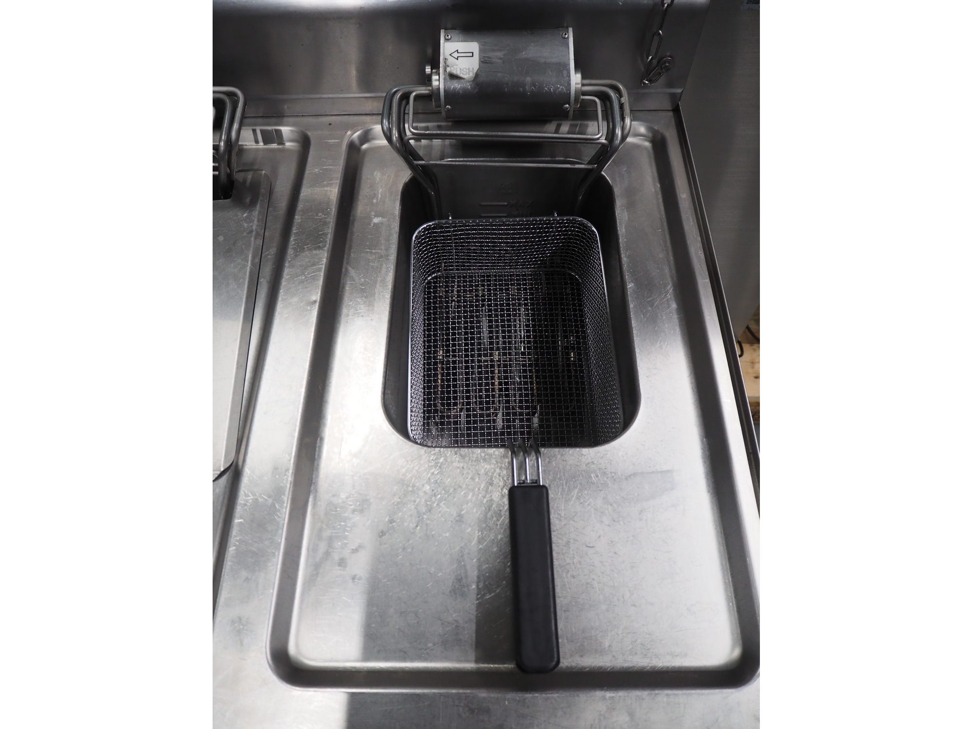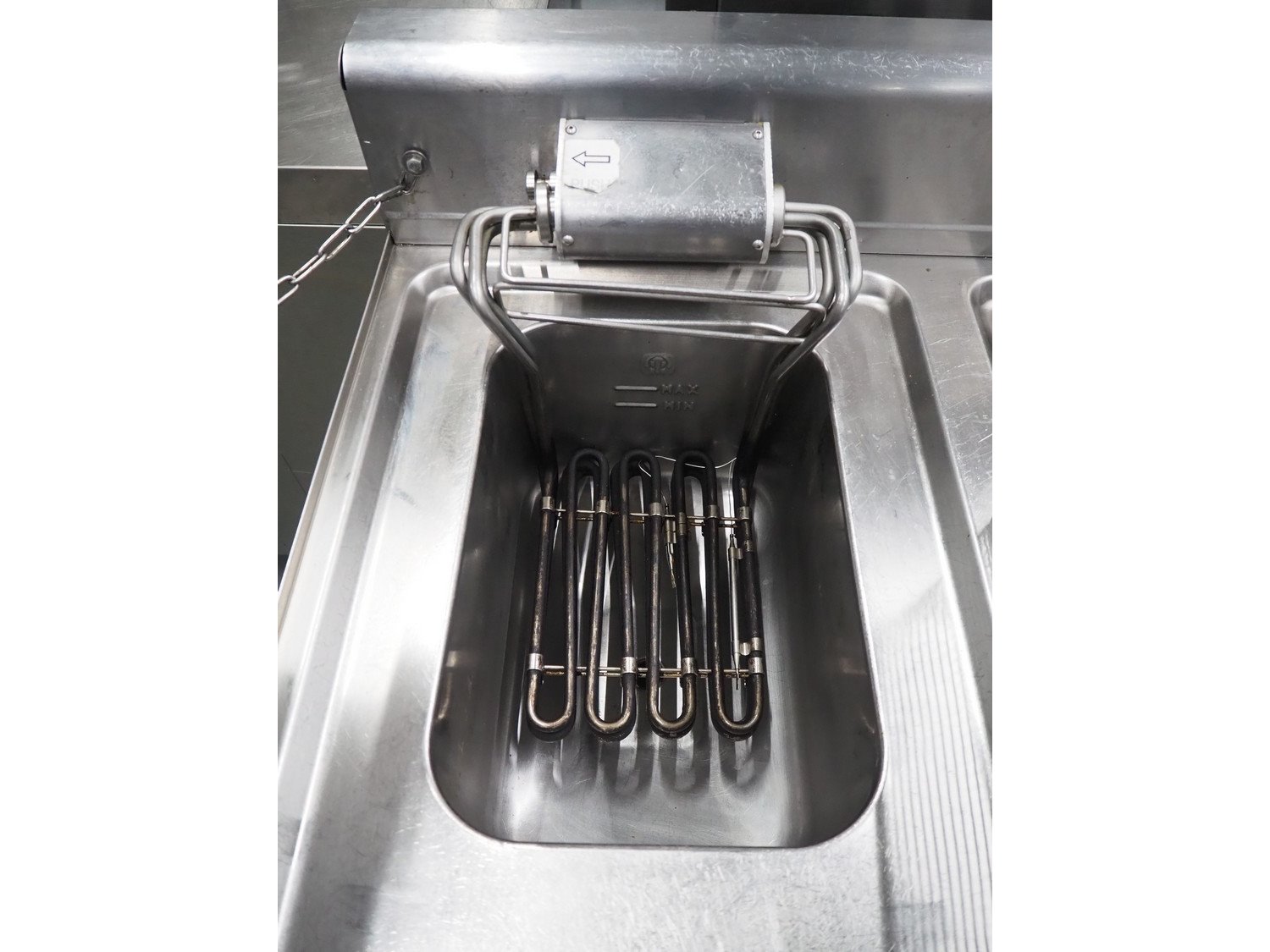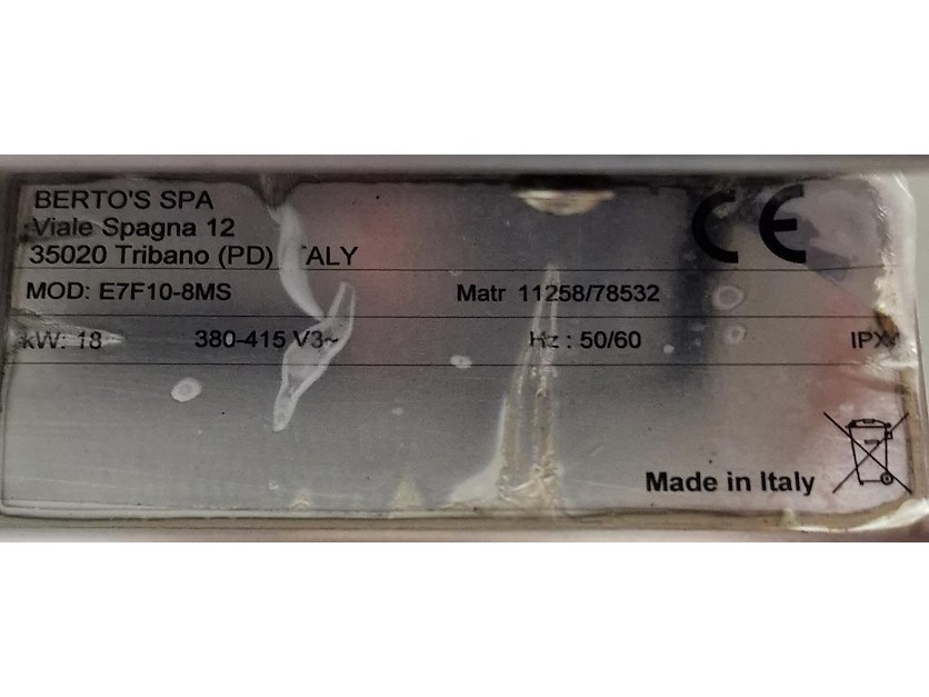 Berto's SPA double fryer, model: E7F10-8MS, number: 11258/78532, 380/415 V, 3 Ph, 50/60 Hz, 18 kW, inside dimensions: (2x) 230 mm x 340 mm x 150 mm, total dimensions: 800 mm x 700 mm x 1040 mm.