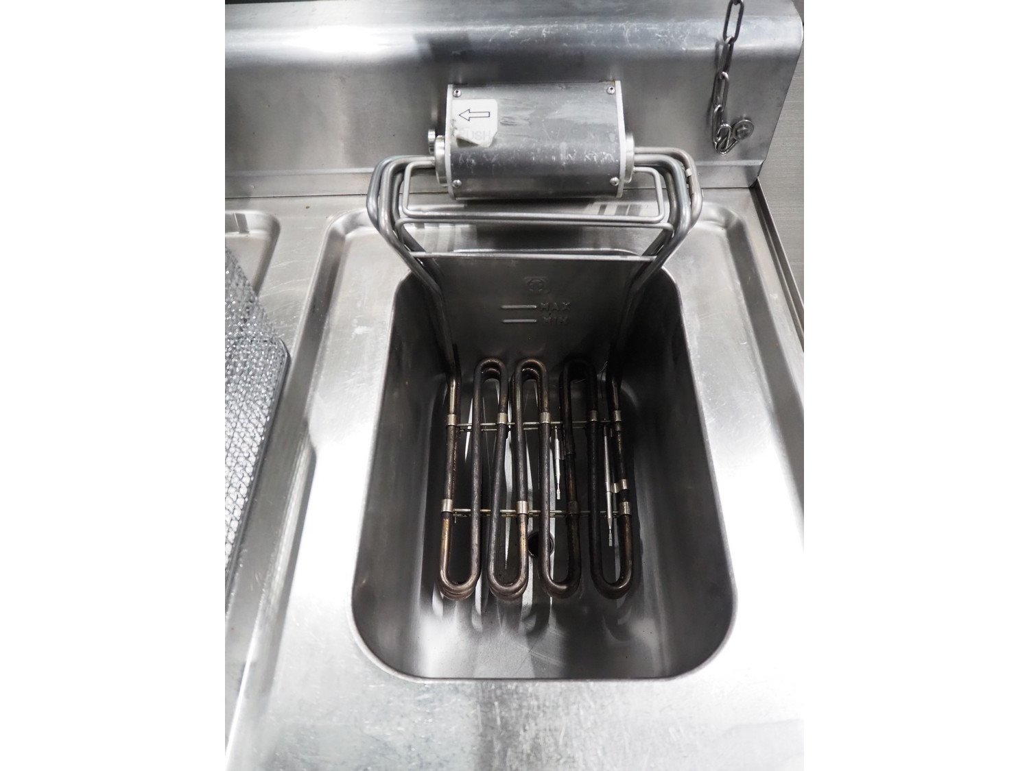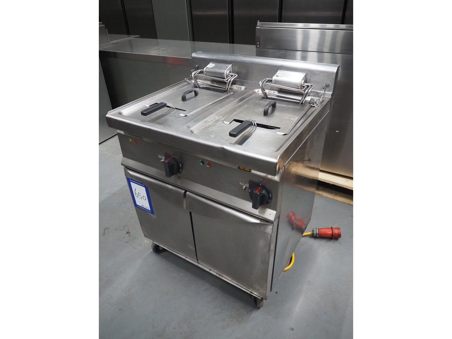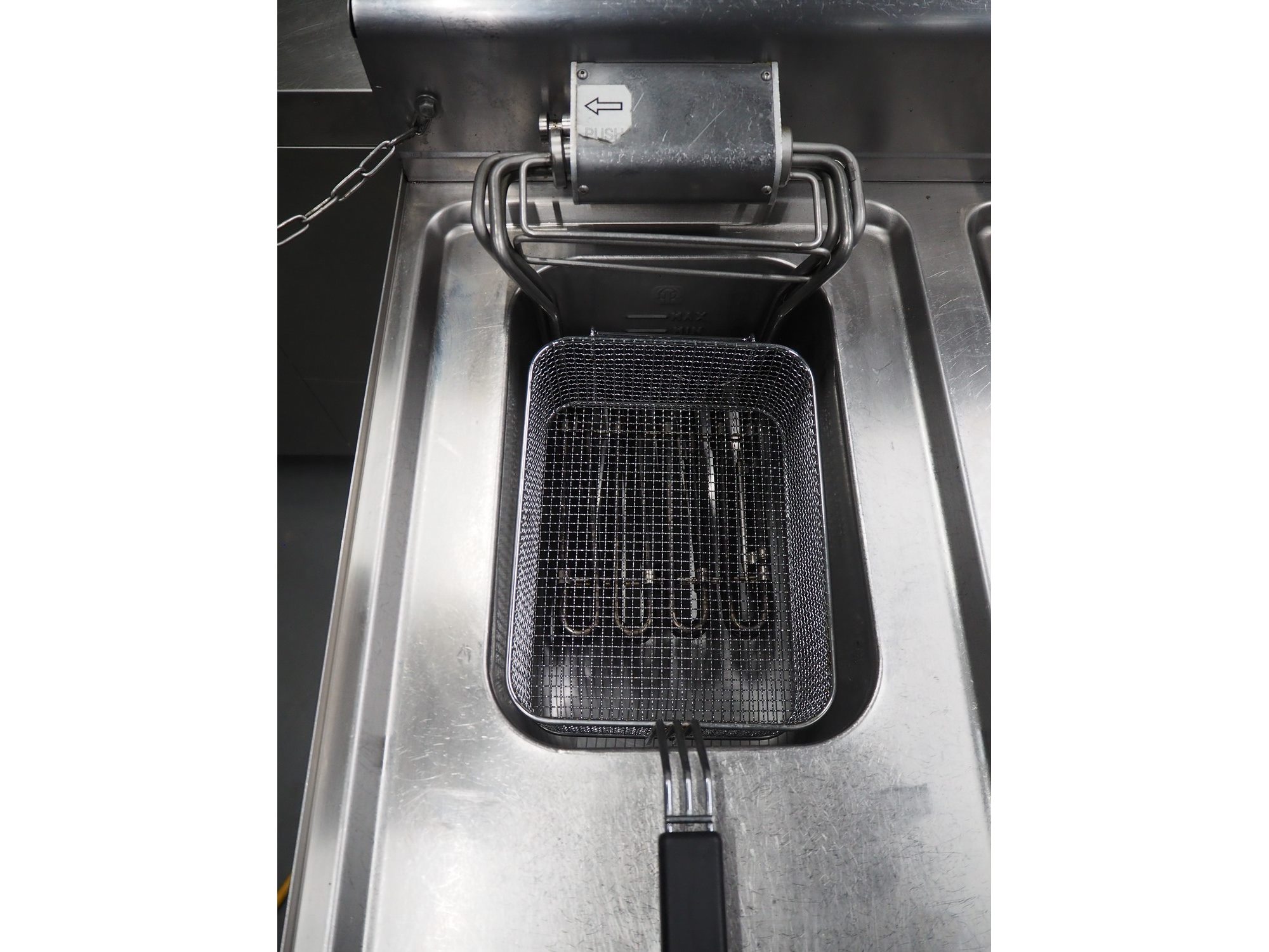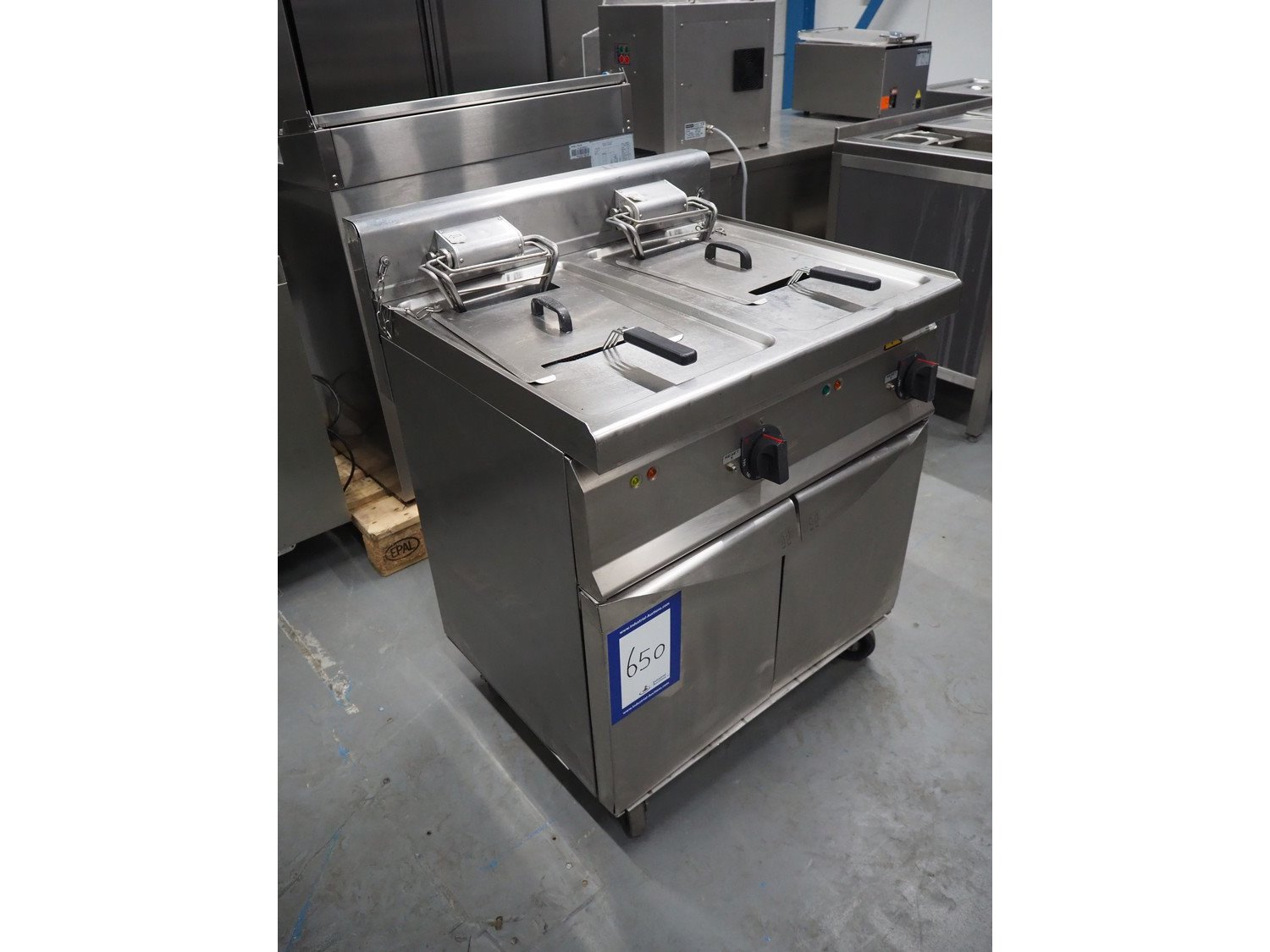 Berto's SPA double fryer, model: E7F10-8MS, number: 11258/78532, 380/415 V, 3 Ph, 50/60 Hz, 18 kW, inside dimensions: (2x) 230 mm x 340 mm x 150 mm, total dimensions: 800 mm x 700 mm x 1040 mm.