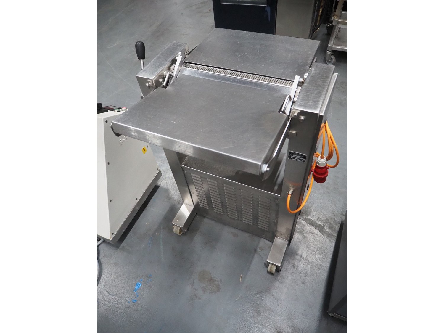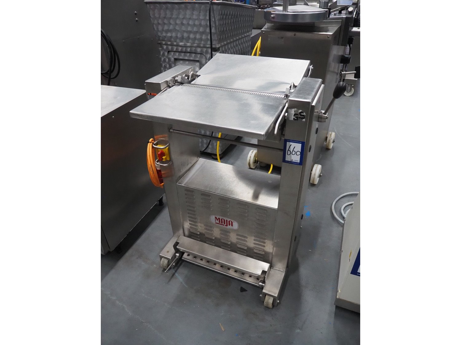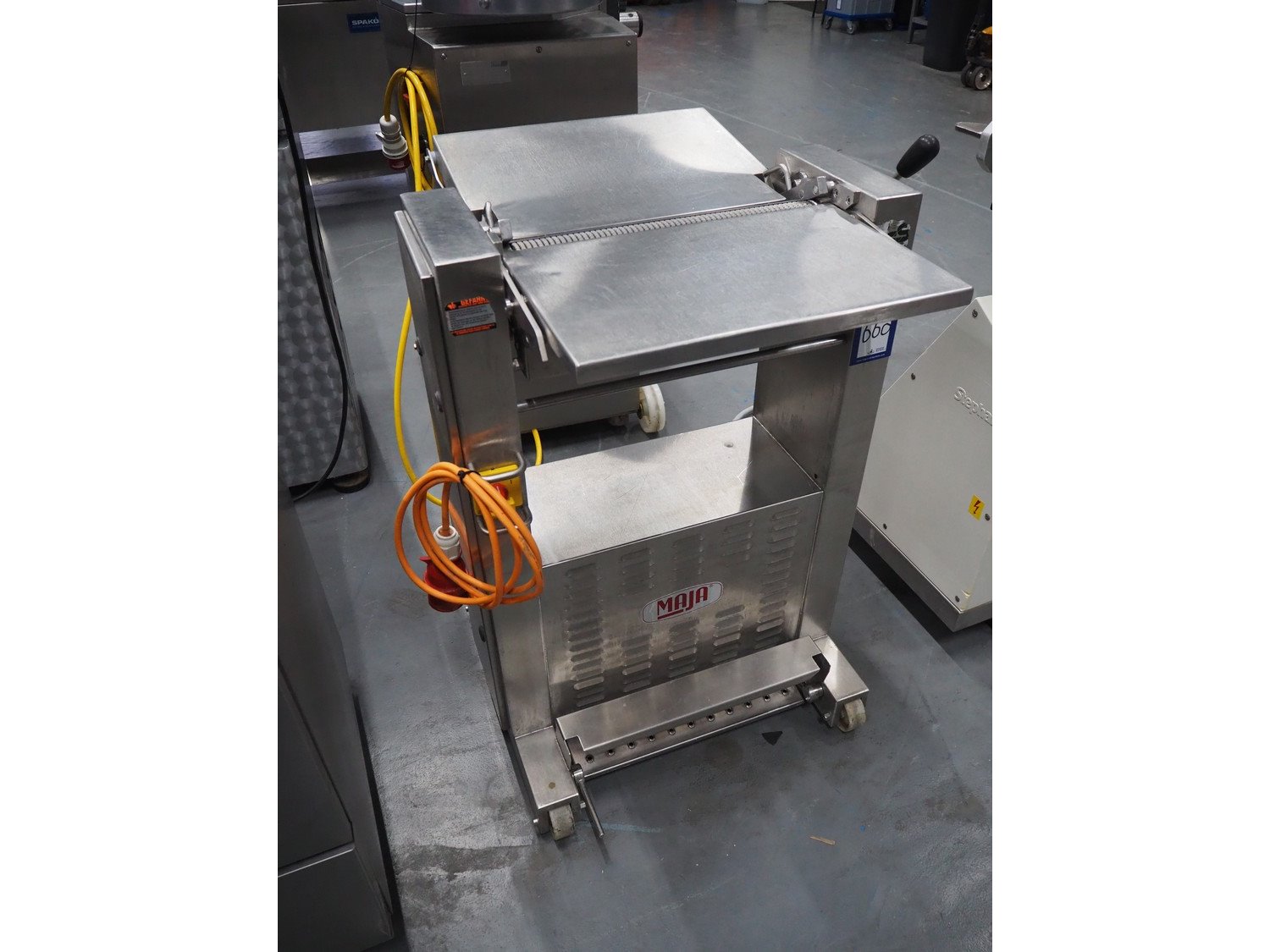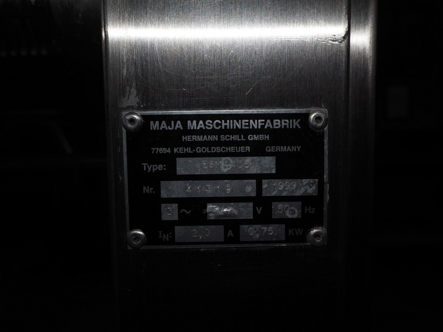 Maja mobile skinning machine, type: ESM 435, number: 41319, year of construction: 1999, 400 V, 3 Ph, 50 Hz, 2 A, 0.75 kW, working width: 430 mm, total dimensions: 770 mm x 730 mm x 980 mm.