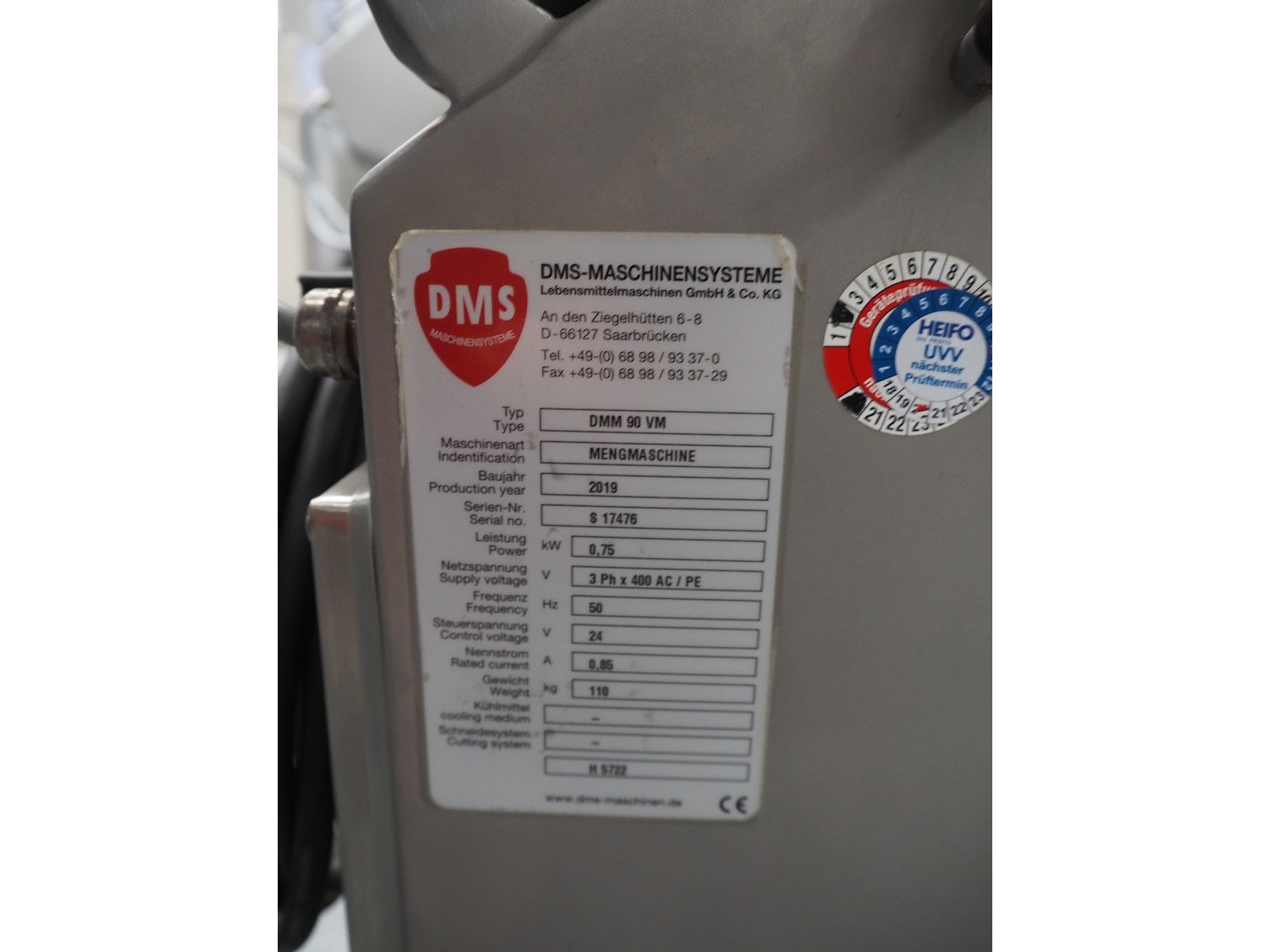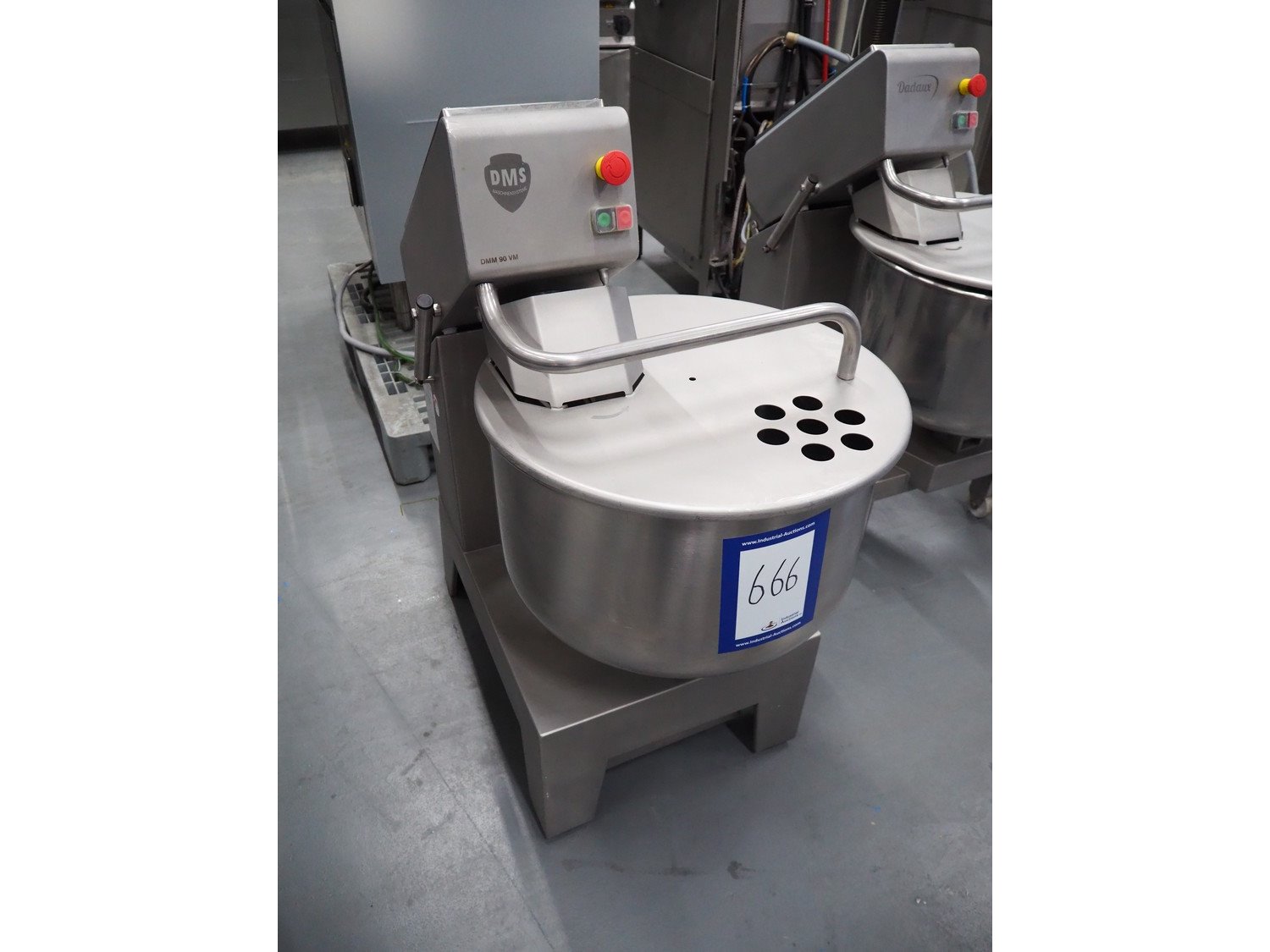 DMS mixer, type: DMM 90 VM, serial number: S 17476, year of construction: 2019, 400 V, 3 Ph, 50 Hz, 0.85 A, 0,75 kW, weight: 110 kg, volume: 90 liter, dimensions: 600 mm x 900 mm x 1120 mm.