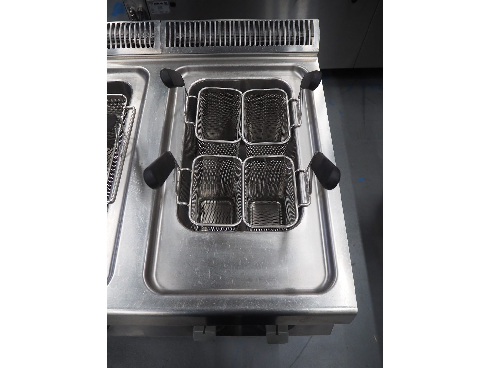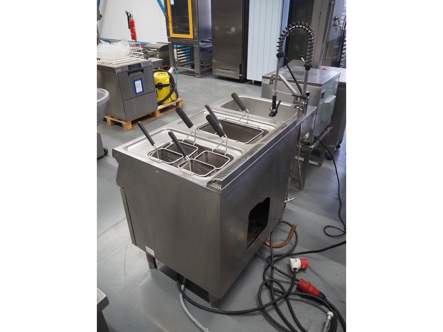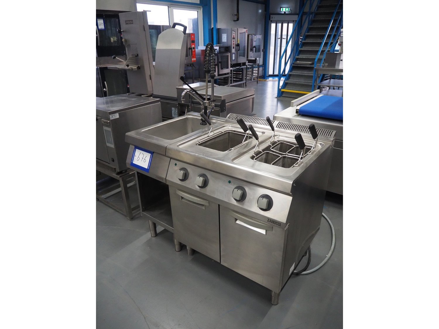 Zanussi pasta cooking machine, double basket, model: Z7PCEH2KF0, serial number: 036200001, 380-400 V, 3 Ph, 50/60 Hz, 12 kW, dimensions: 1200 mm x 730 mm x 1450 mm. Including 5 baskets.