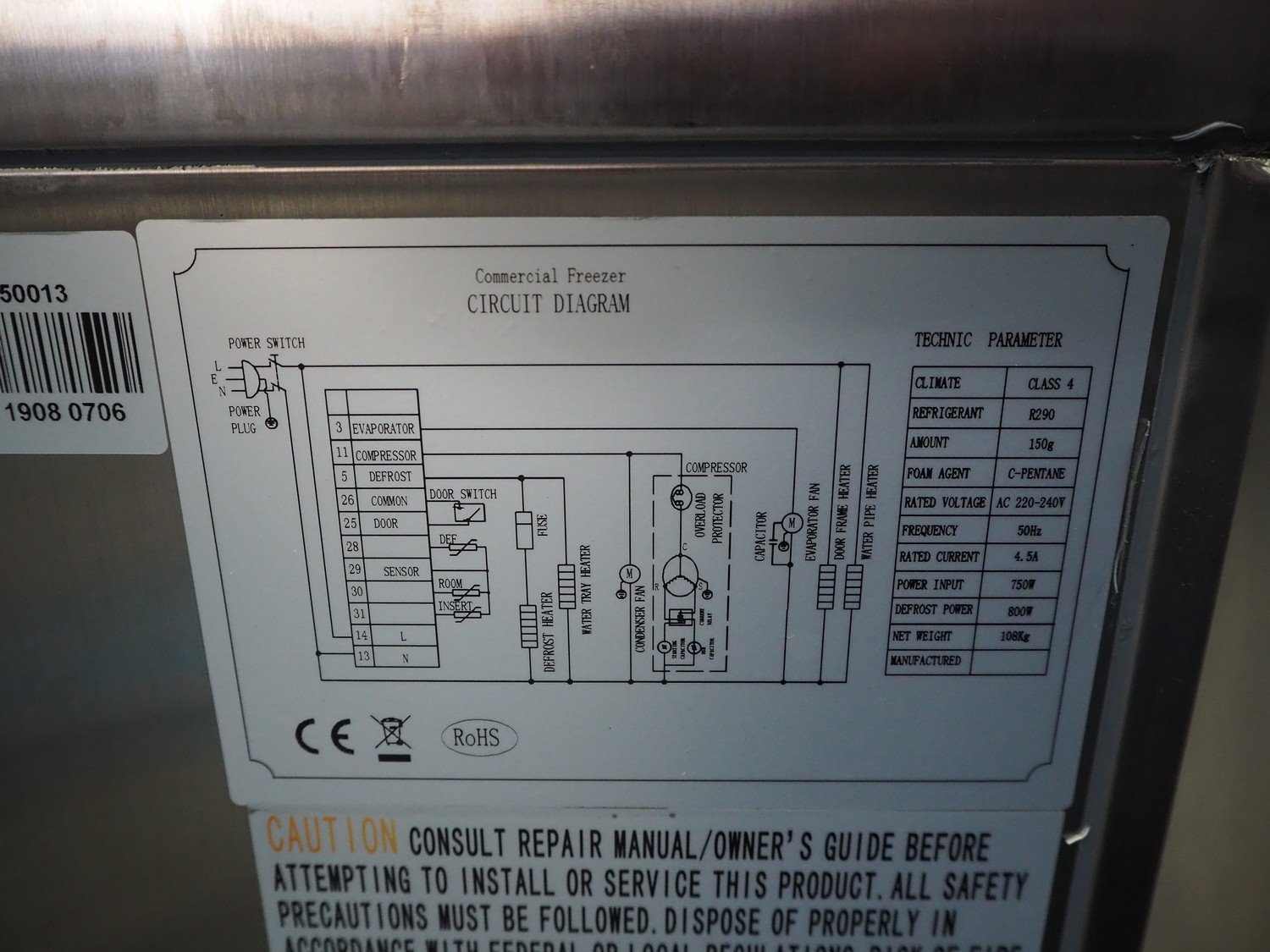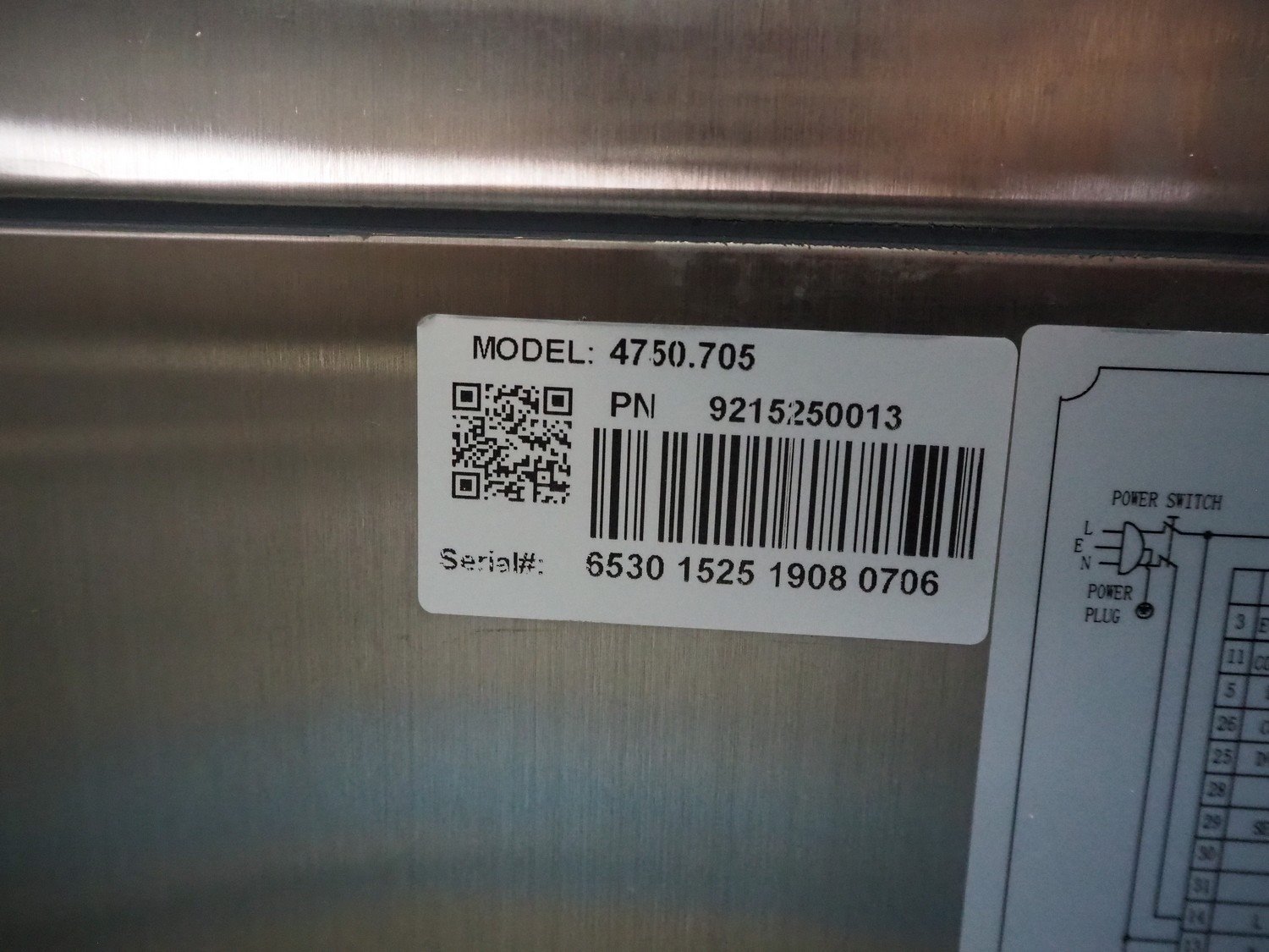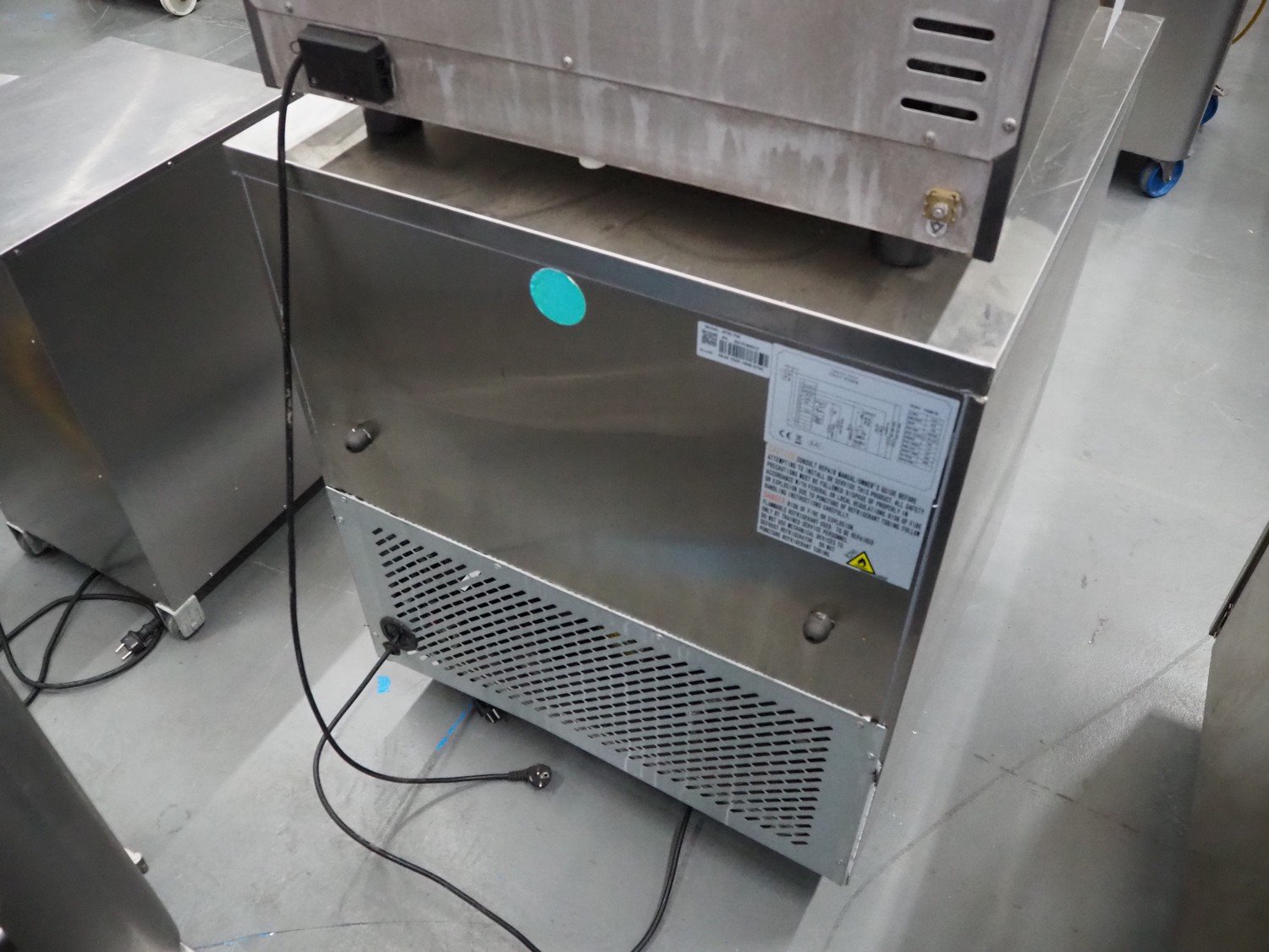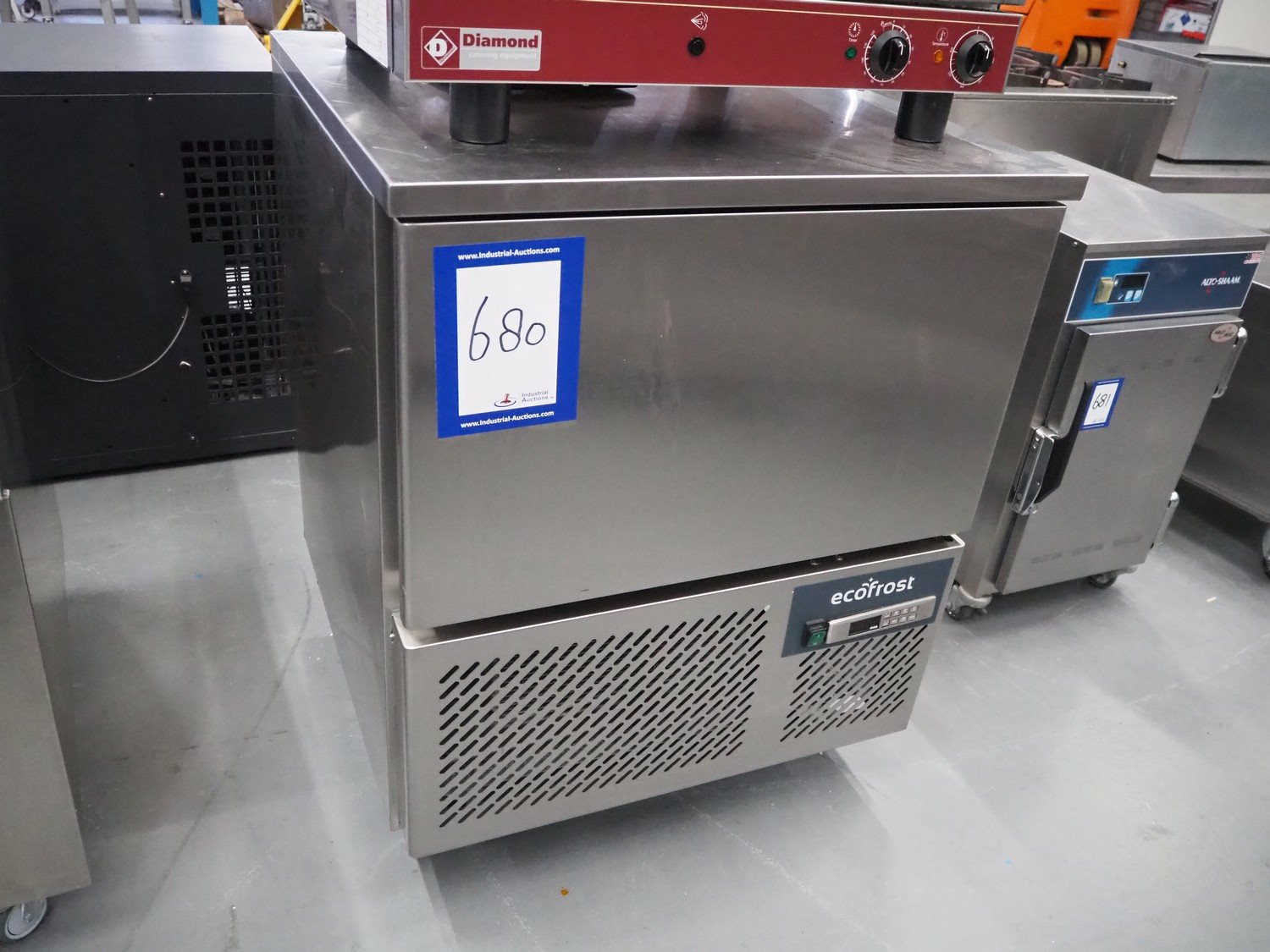 Ecofrost blast chiller, model: 4750.705, serial number: 6530 1525 1908 0706, 220/240 V, 50 Hz, 4.5 A, 750 W, weight: 108 kg, refrigerant: R290/250g, 5 floors, dimensions each floor: 600 mm x 370 mm, total dimensions: 800 mm x 800 mm x 1000 mm.