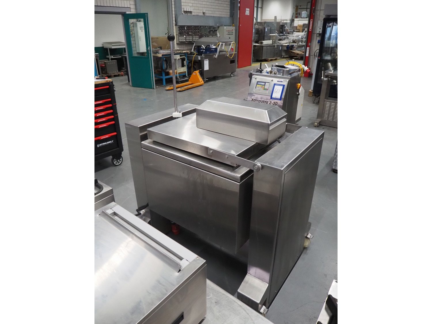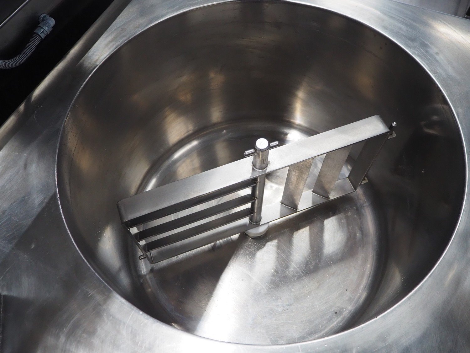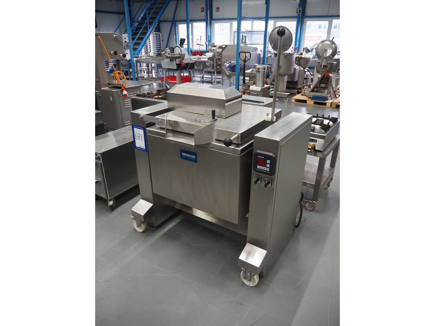 Spako cooking vessel with agitator, type: TRK100, serial number: 21.532, 230/400 V, 50 Hz, 9.5 kW, inside dimensions: Ø 600 mm x 400 mm, total dimensions: 1160 mm x 880 mm x 1590 mm.