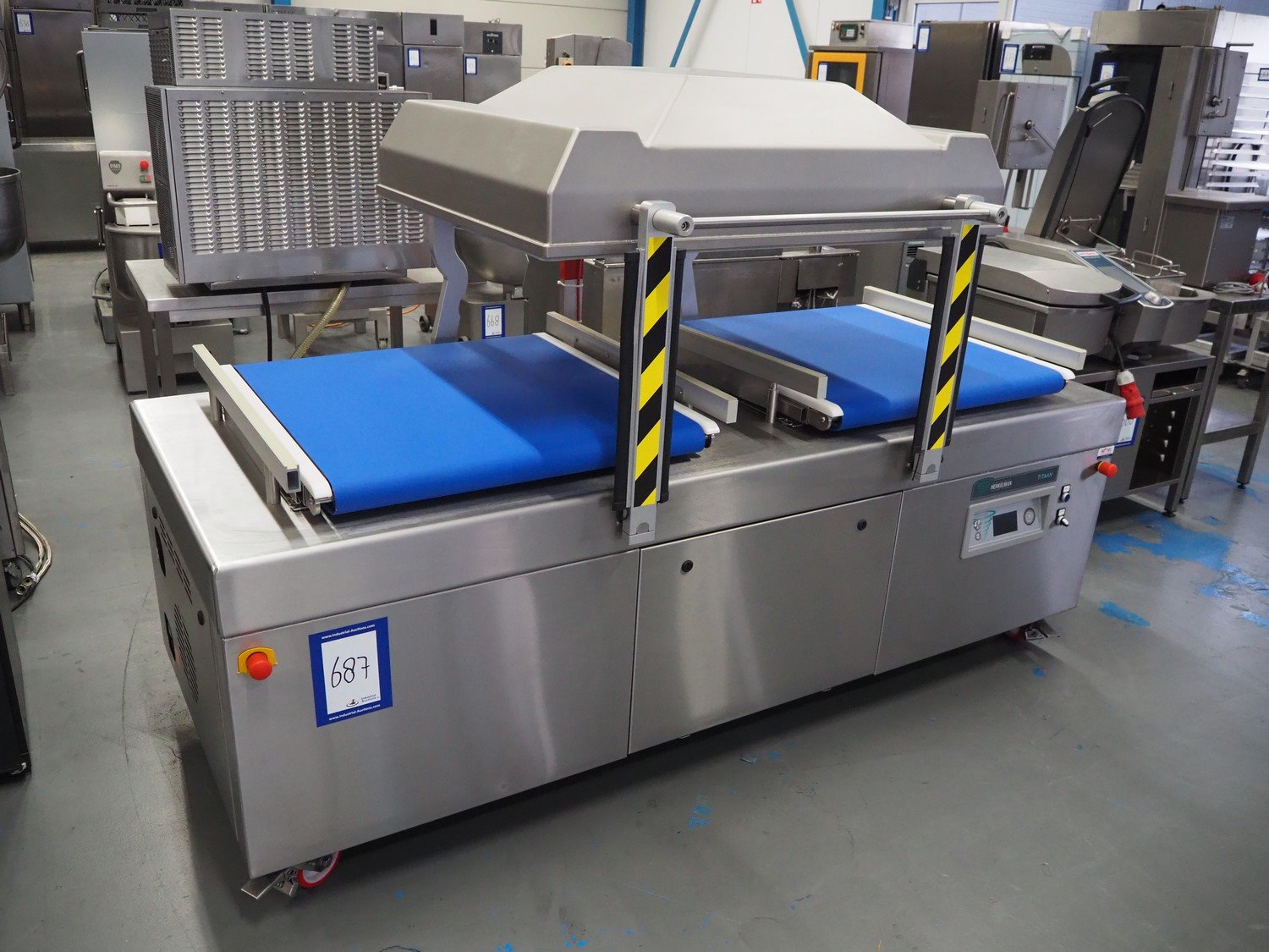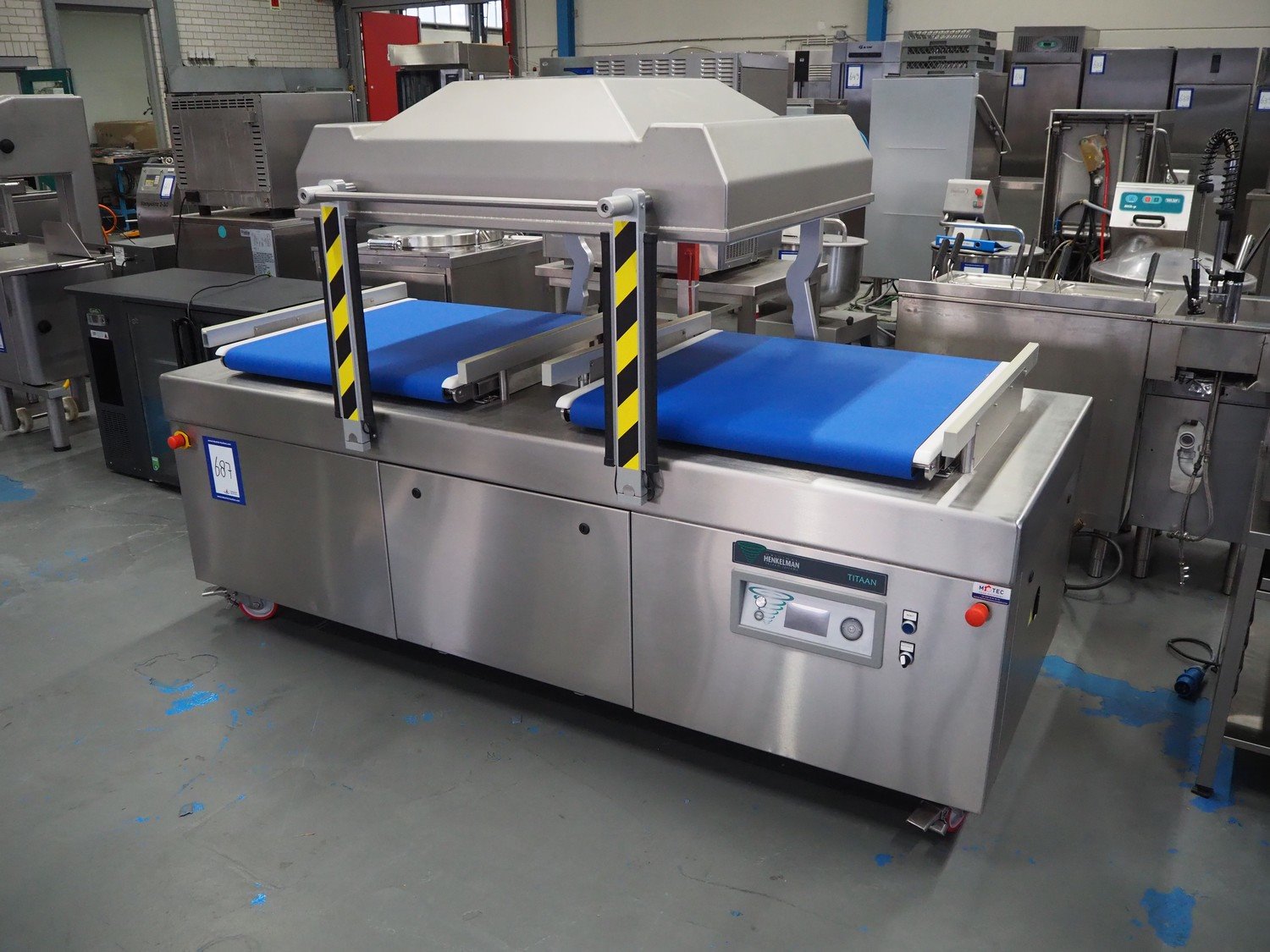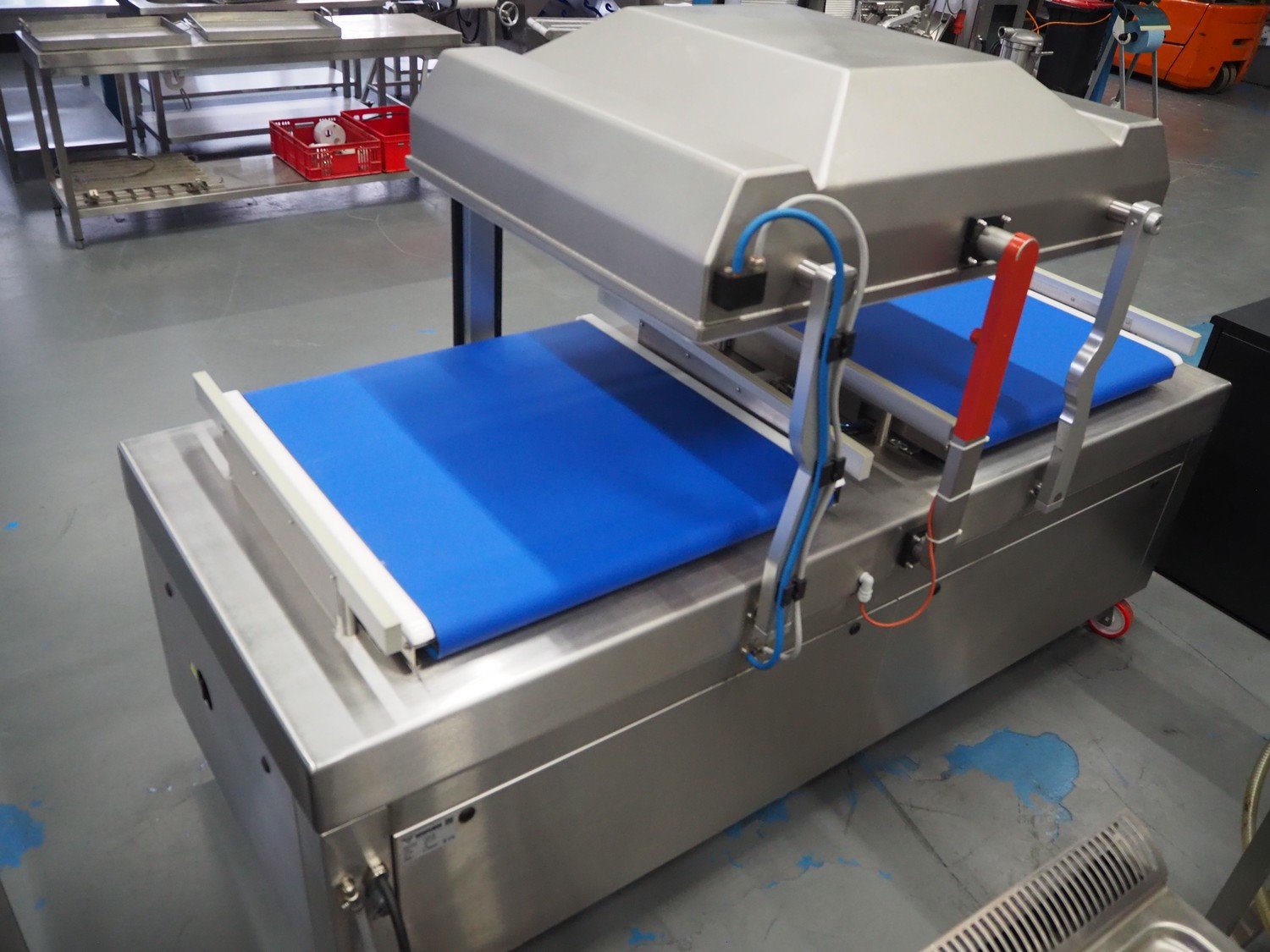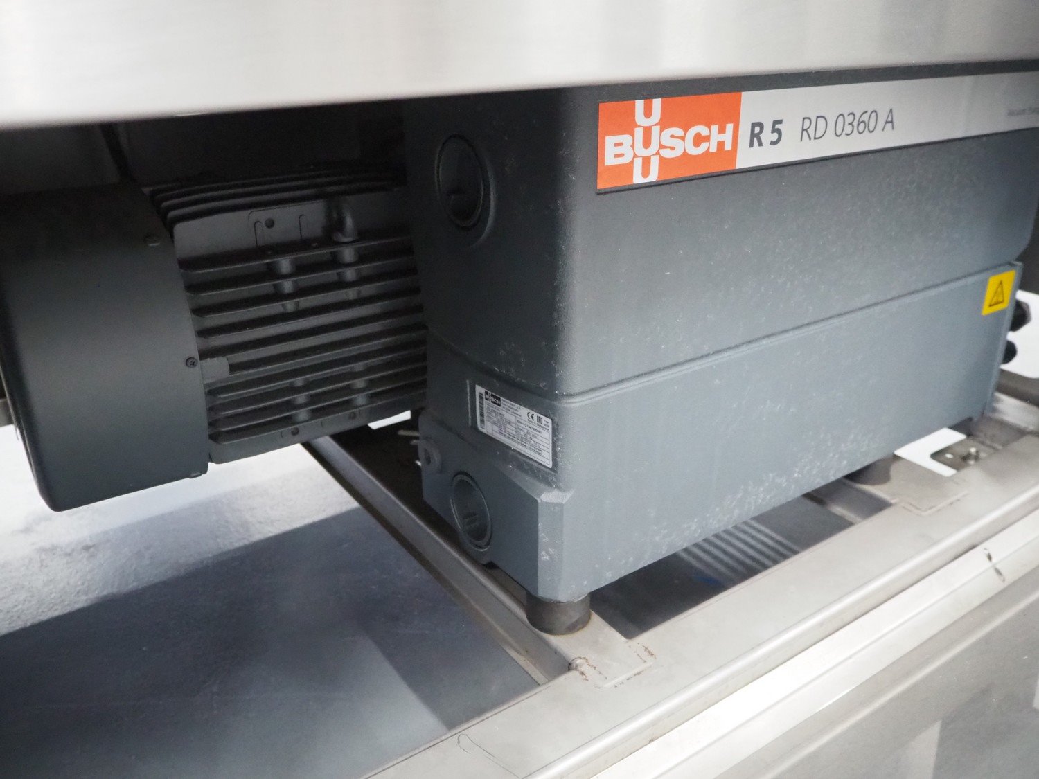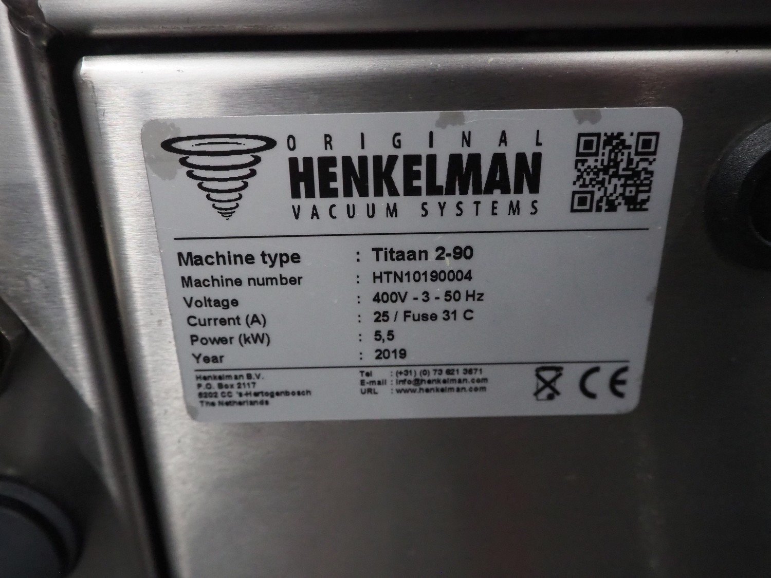 Henkelman mobile double chamber vacuum machine, type: Titaan 2-90, machine number: HTN10190004, year of construction: 2019, 400 V, 3 Ph, 50 Hz, 5.5 kW, seal length: (4x) 850 mm, chamber dimensions: (2x) 850 mm x 900 mm, working hours: 46:32, Busch vacuum pump, type: RD 0360 A 5H3, capacity: 300 m³ per hour, total dimensions: 2500 mm x 1200 mm x 1150 mm. Only 40 working hours.