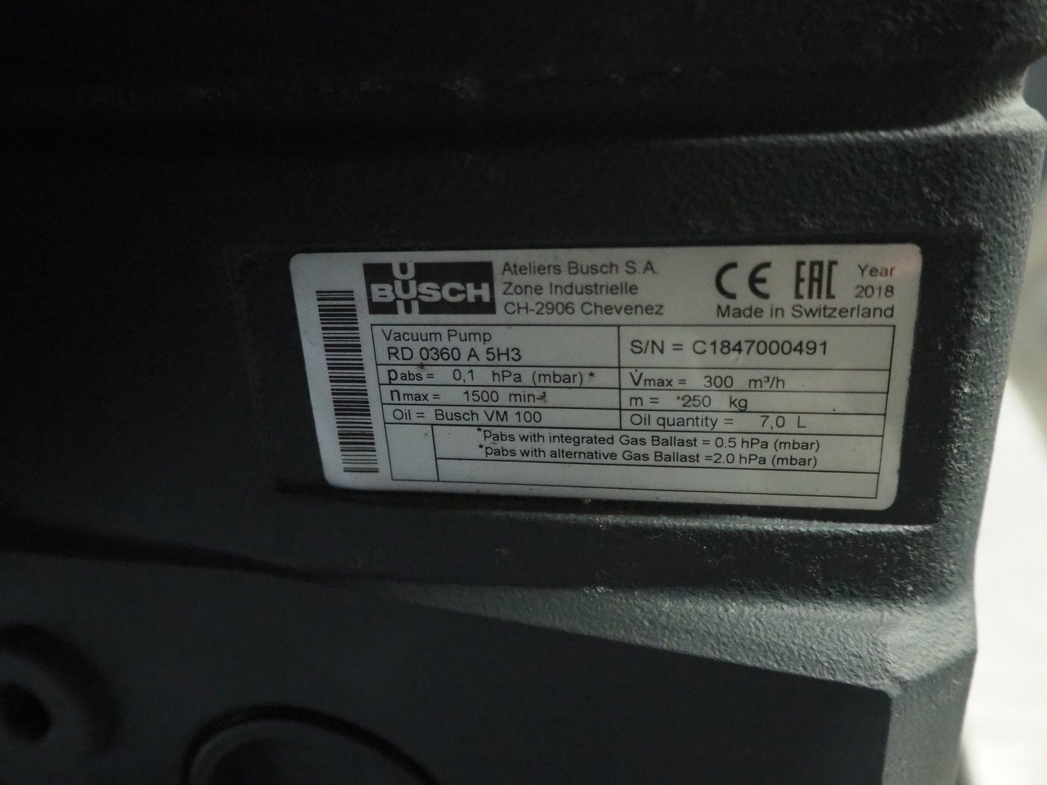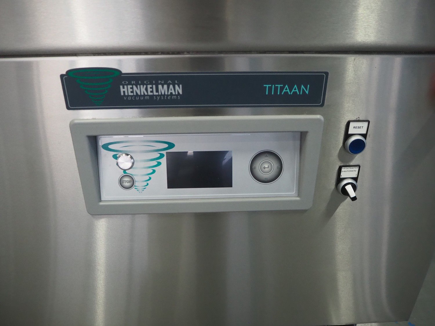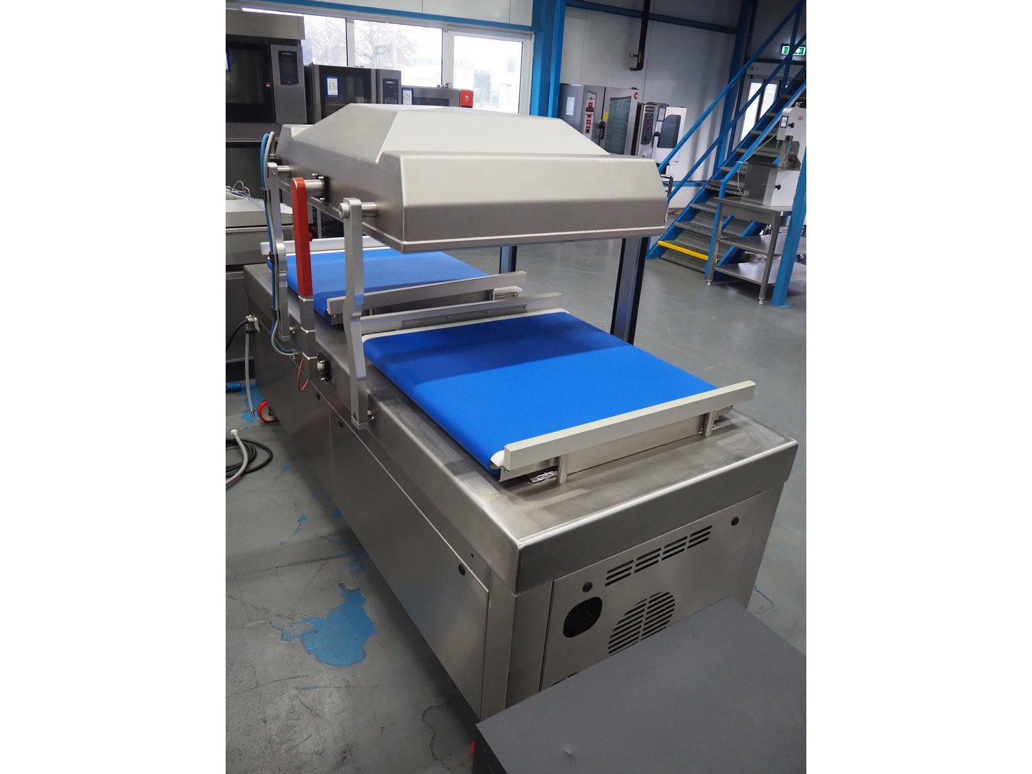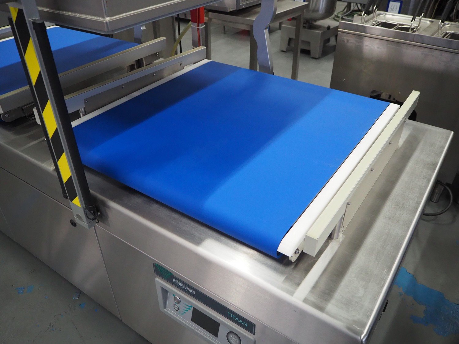 Henkelman mobile double chamber vacuum machine, type: Titaan 2-90, machine number: HTN10190004, year of construction: 2019, 400 V, 3 Ph, 50 Hz, 5.5 kW, seal length: (4x) 850 mm, chamber dimensions: (2x) 850 mm x 900 mm, working hours: 46:32, Busch vacuum pump, type: RD 0360 A 5H3, capacity: 300 m³ per hour, total dimensions: 2500 mm x 1200 mm x 1150 mm. Only 40 working hours.