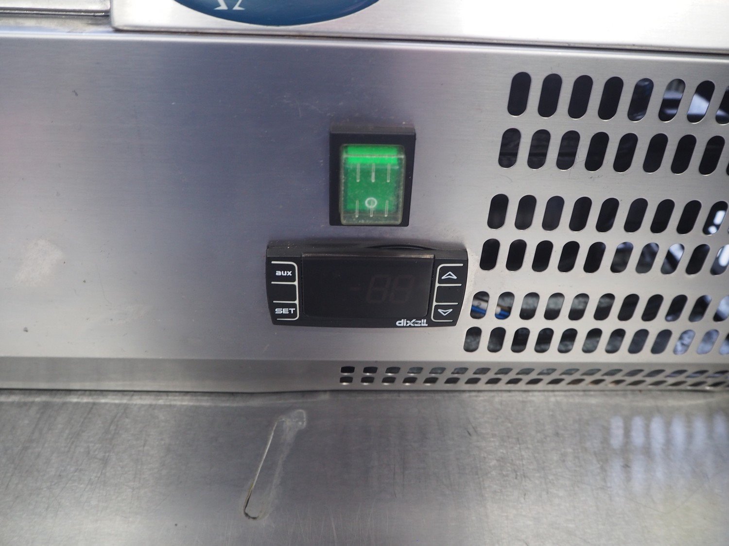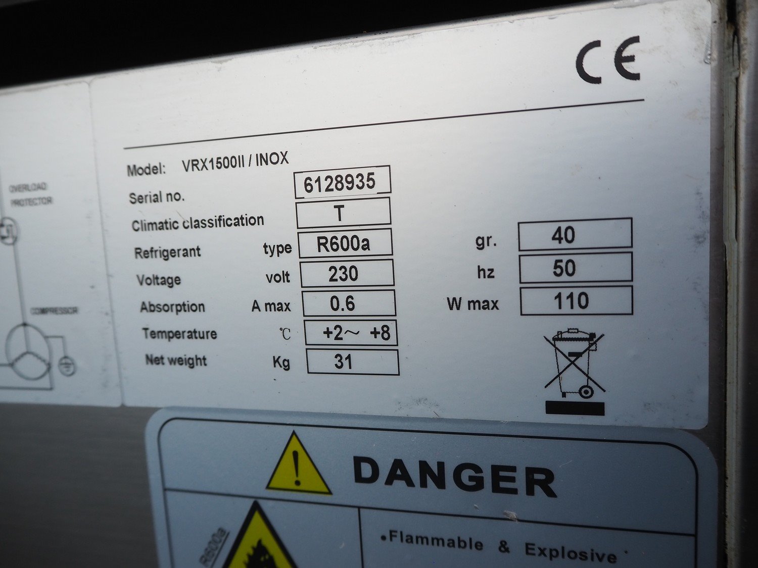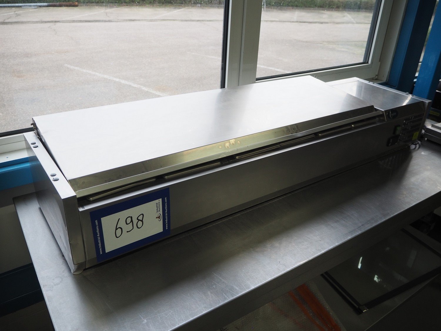 Topcold refrigerated showcase, model: VRX1500II/INOX, serial number: 6128935, year of construction: 07.2016, 230 V, 50 Hz, 0.6 A, 110 W, weight: 31 kg, refrigerant: R600a, dimensions: 1500 mm x 400 mm x 1280 mm.