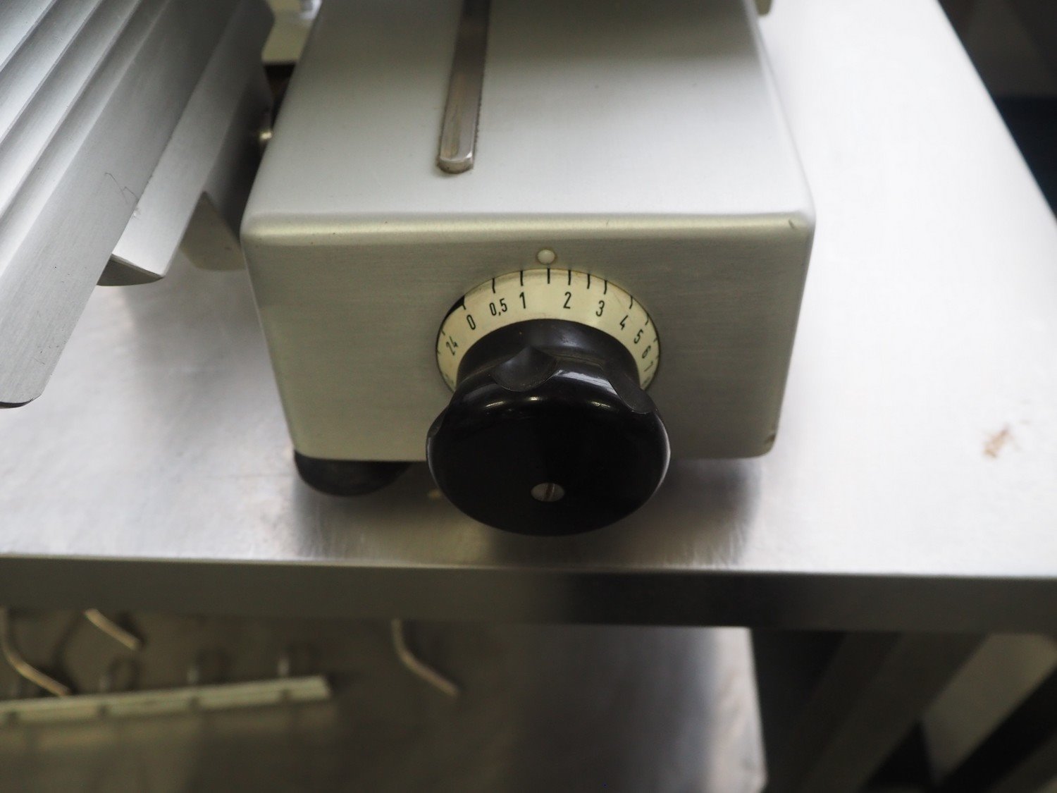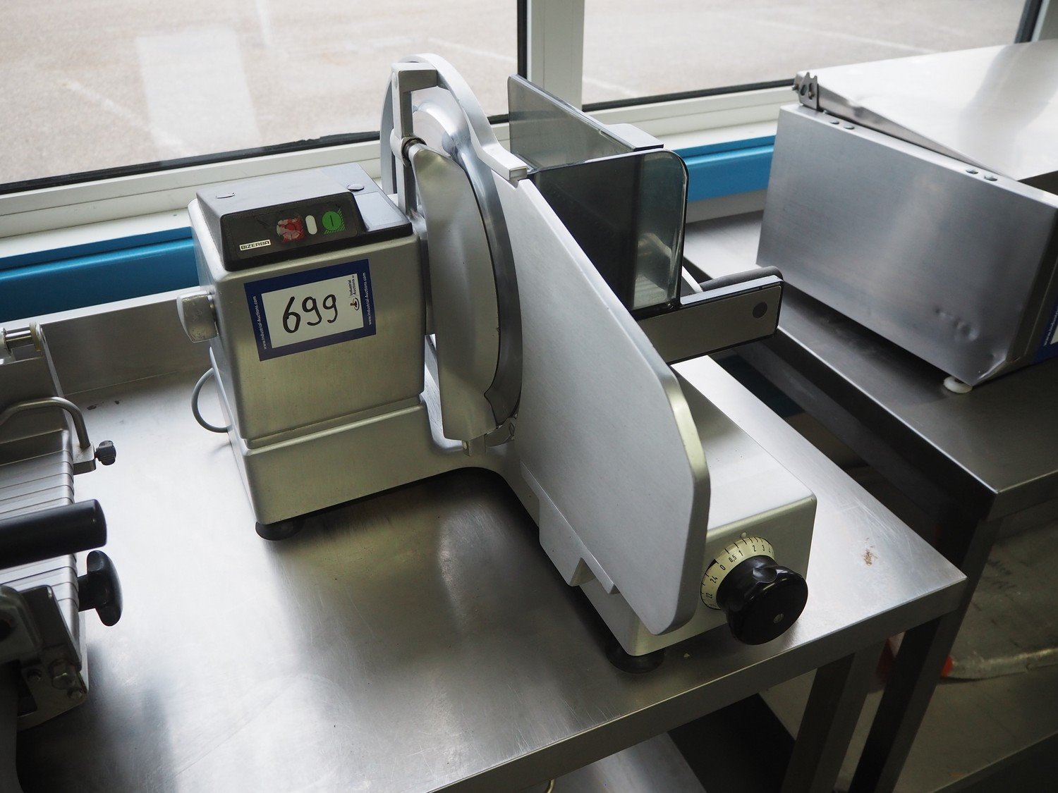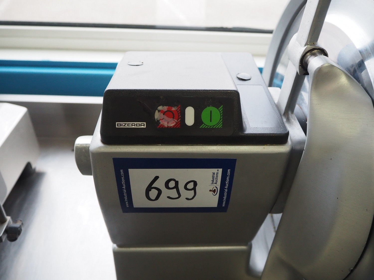 Bizerba slicer, type: VS 8, number: 1655141, year of construction: 1998, 230 V, 1 Ph, 50 Hz, 1.79 A, dimensions: 655 mm x 530 mm x 430 mm.