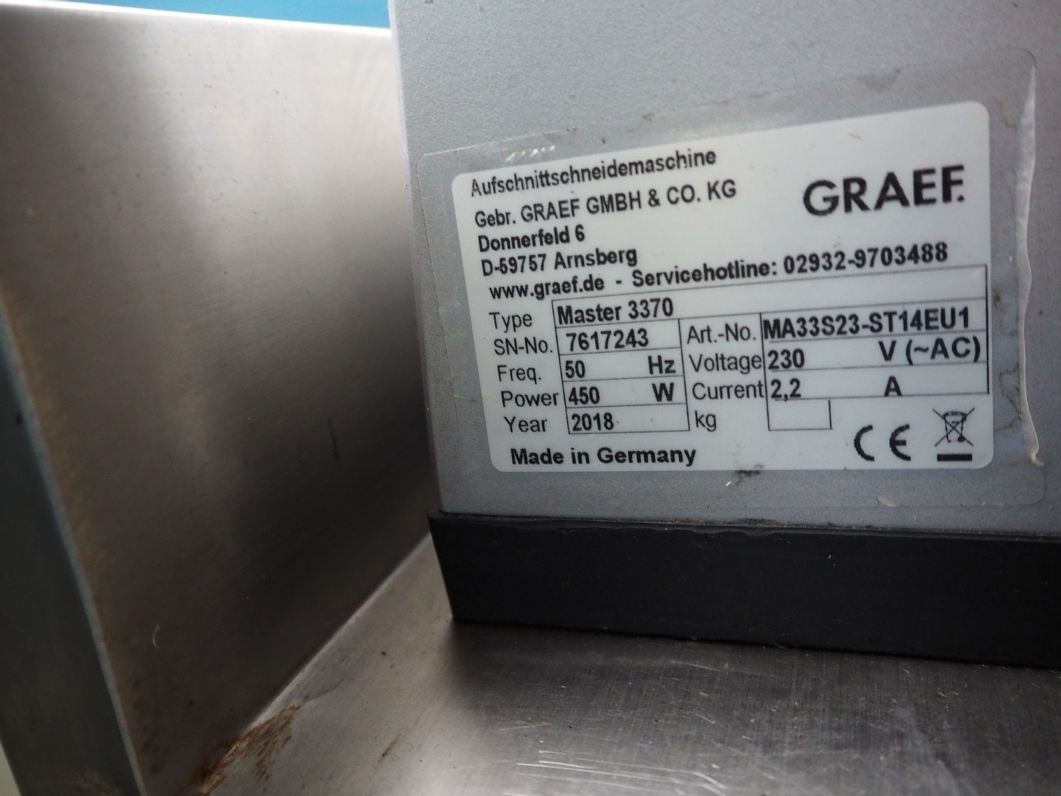 Greaf slicer, type: Master 3370, serial number: 7617243, year of construction: 2018, 230 V, 50 Hz, 2.2 A, 450 W, dimensions: 710 mm x 630 mm x 650 mm.