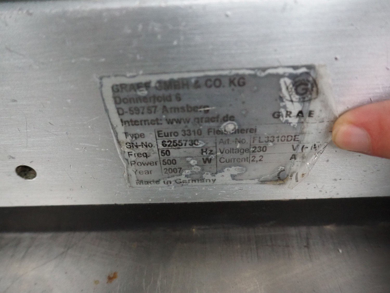 Graef slicer, type: Euro 3310, serial number: 6255730, year of construction: 2007, 230 V, 50 Hz, 2.2 A, 500 W, dimensions: 550 mm x 700 mm x 500 mm.