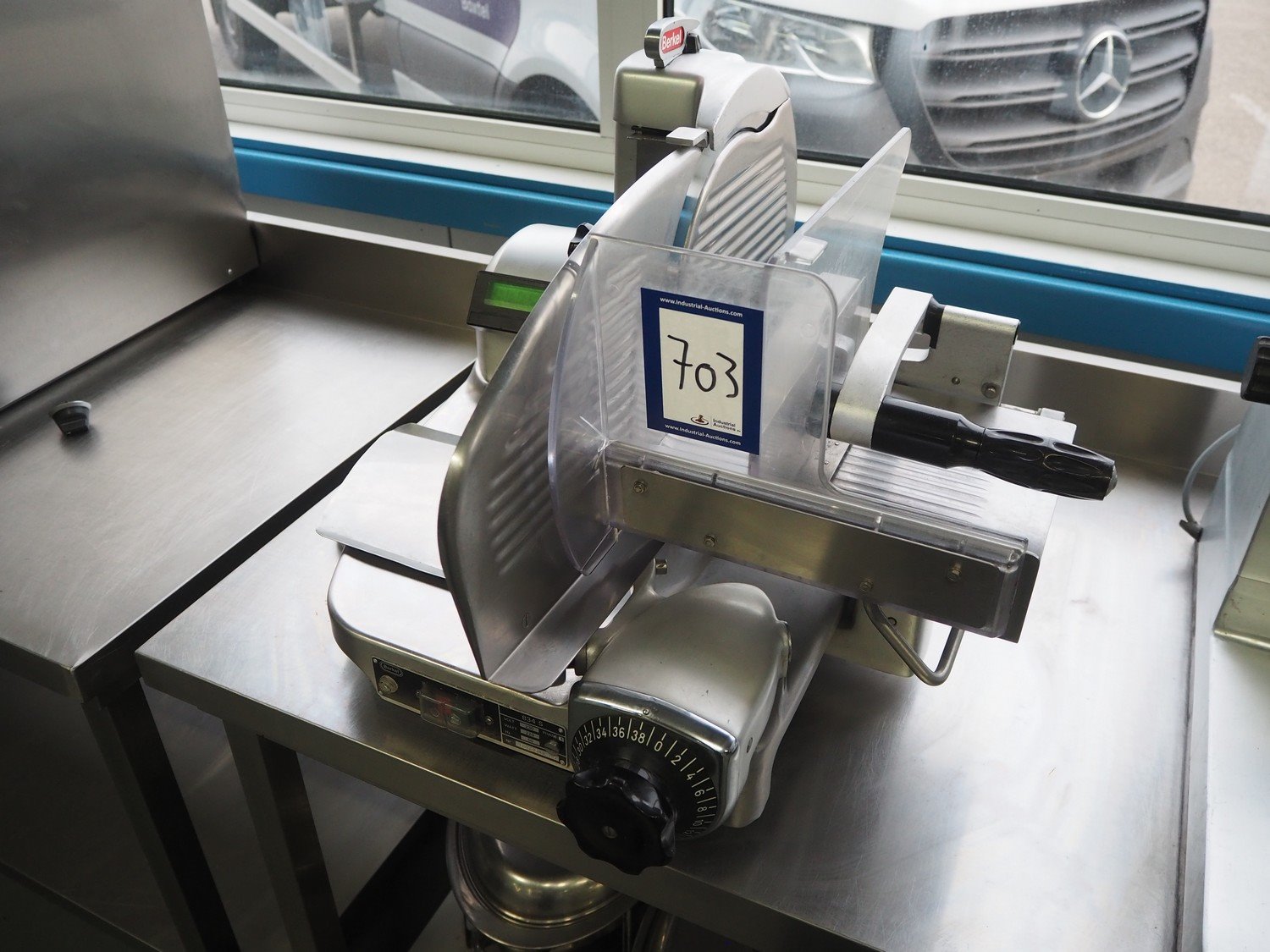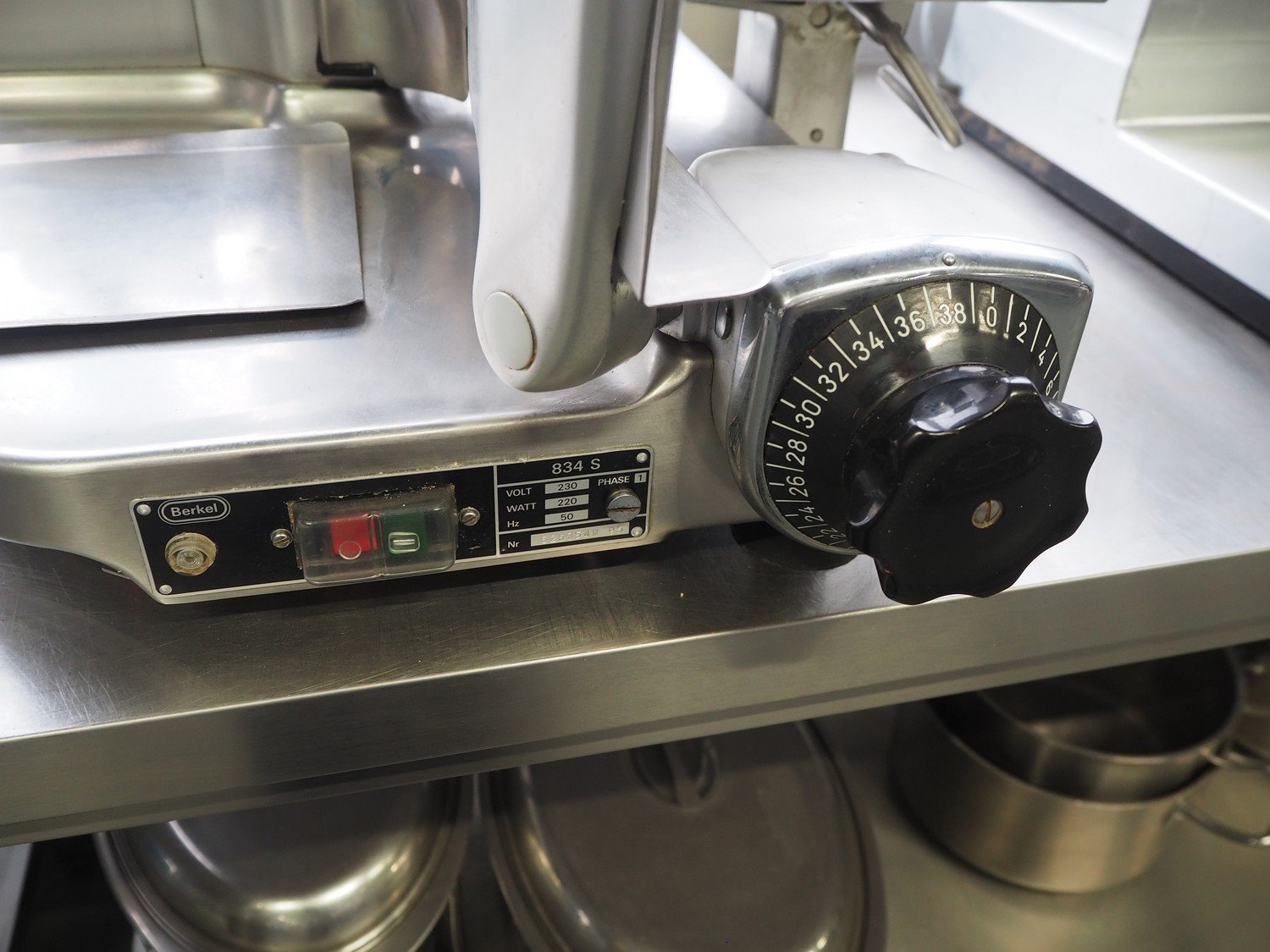Berkel slicer, type: 834 S, number: 626354W 95, with weighing scale, 230 V, 1 Ph, 50 Hz, 220 W, dimensions: 600 mm x 700 mm x 450 mm.
