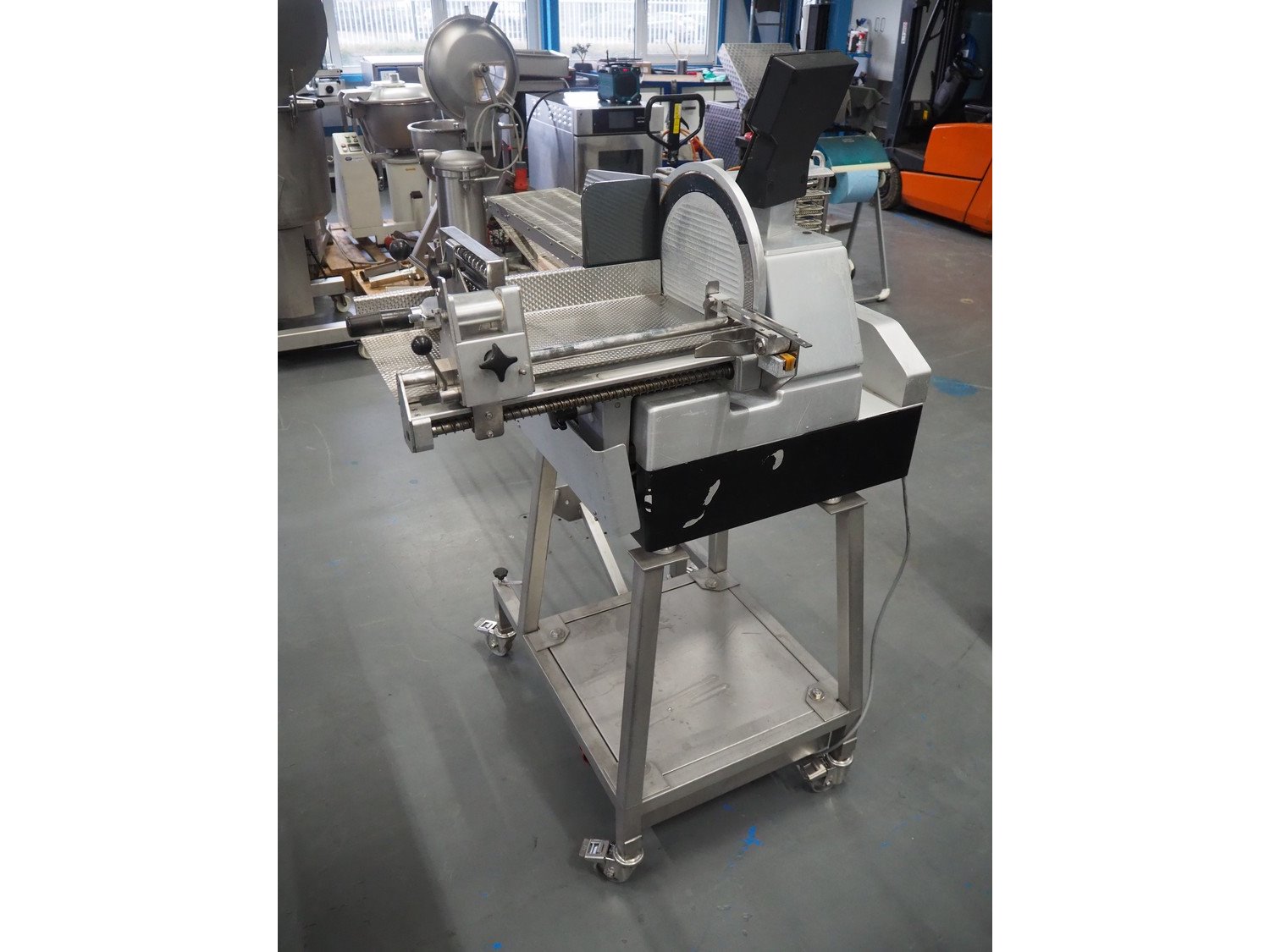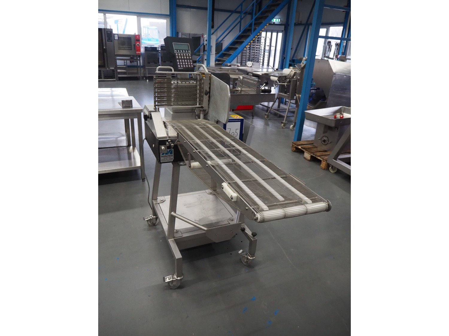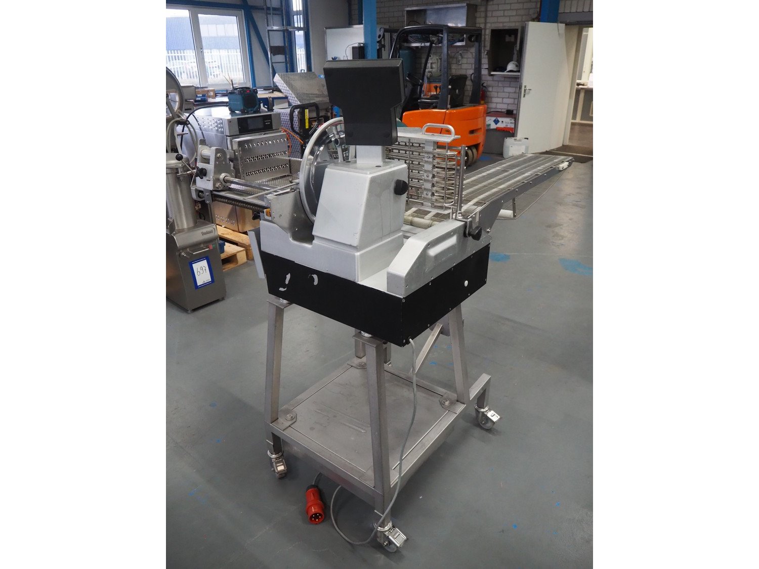 Bizerba mobile automatic slicer, model: A 404 FB, number: 1742198, year of construction: 1999, 230/400 V, 3 Ph, 50 Hz, 2.5/1.4 A, s/s mesh outfeed belt, belt width: 250 mm, total dimensions: 1700 mm x 1000 mm x 1600 mm.