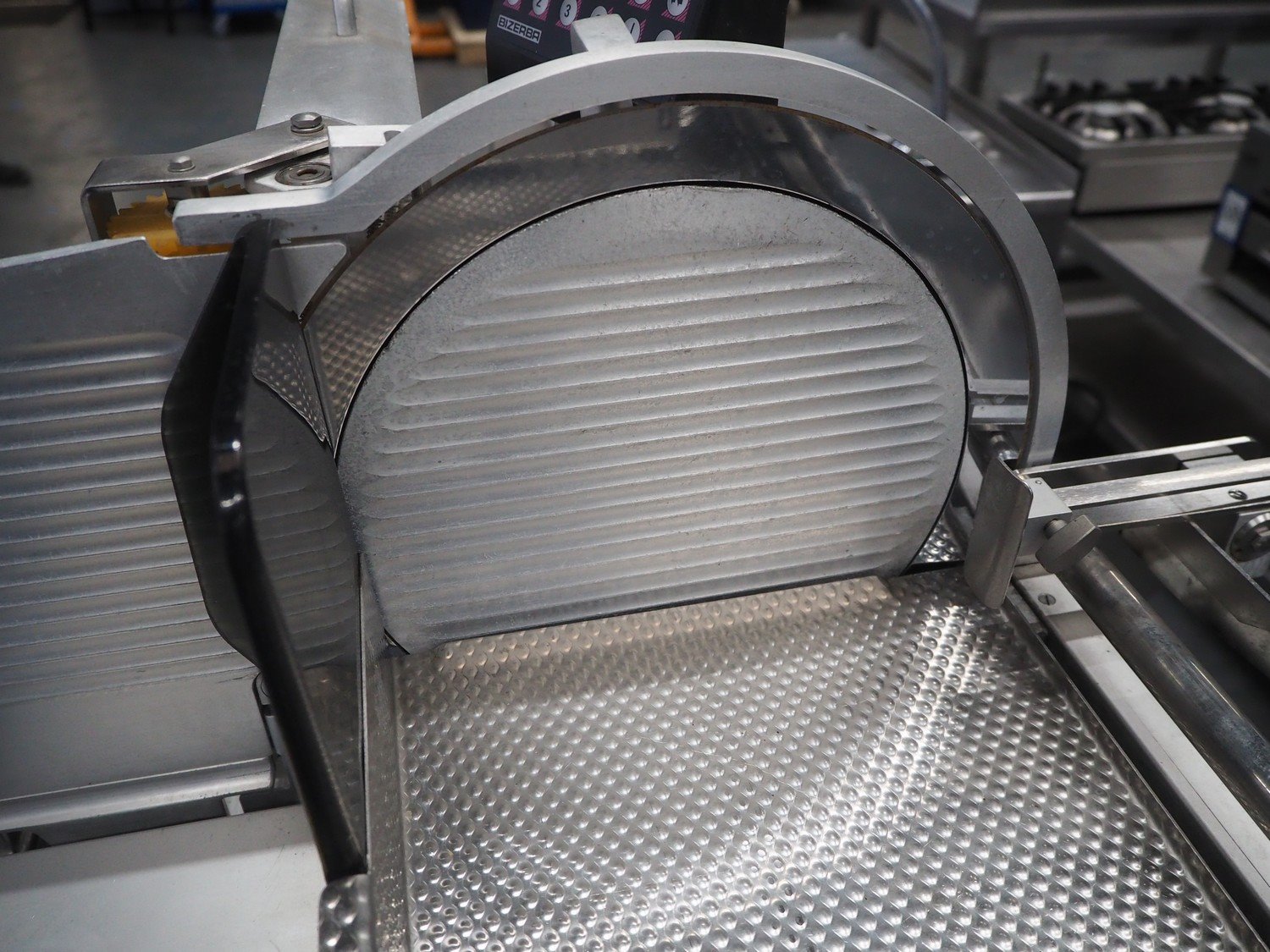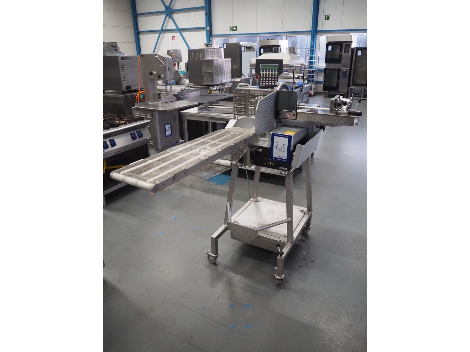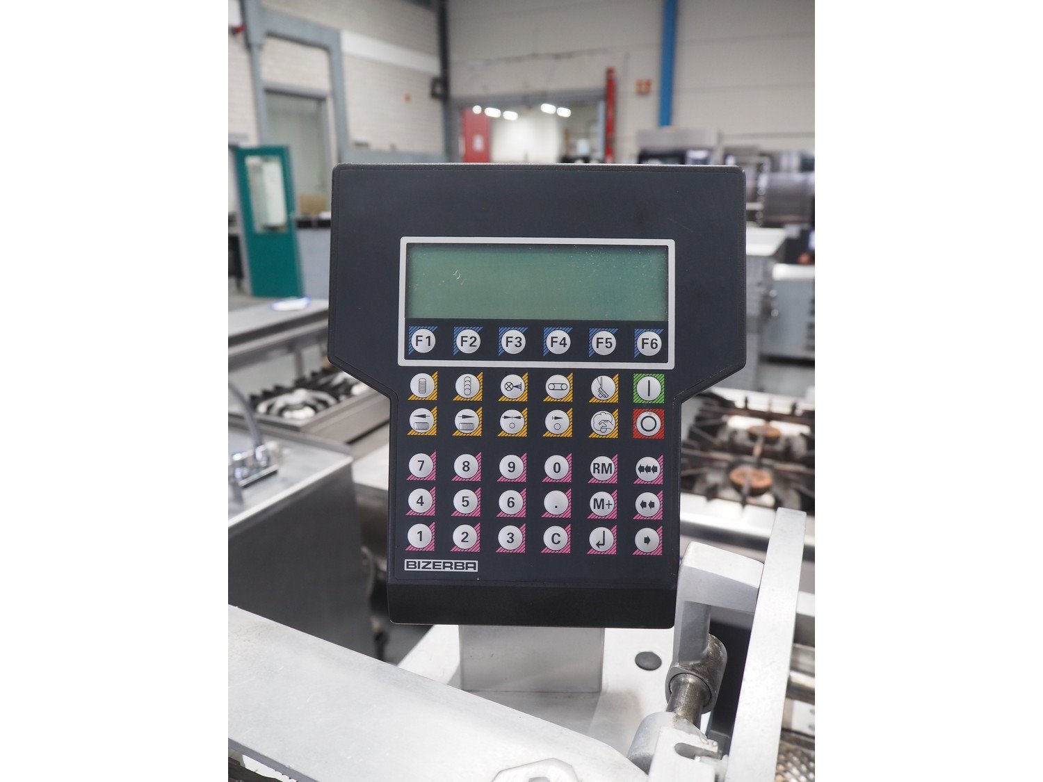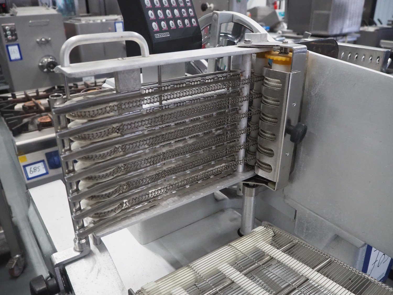 Bizerba mobile automatic slicer, model: A 404 FB, number: 1742198, year of construction: 1999, 230/400 V, 3 Ph, 50 Hz, 2.5/1.4 A, s/s mesh outfeed belt, belt width: 250 mm, total dimensions: 1700 mm x 1000 mm x 1600 mm.