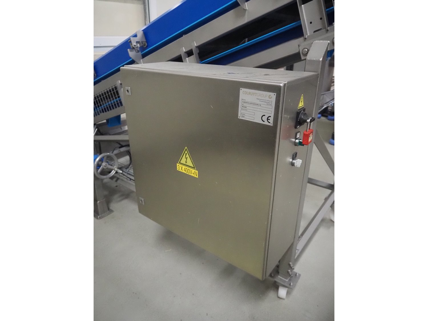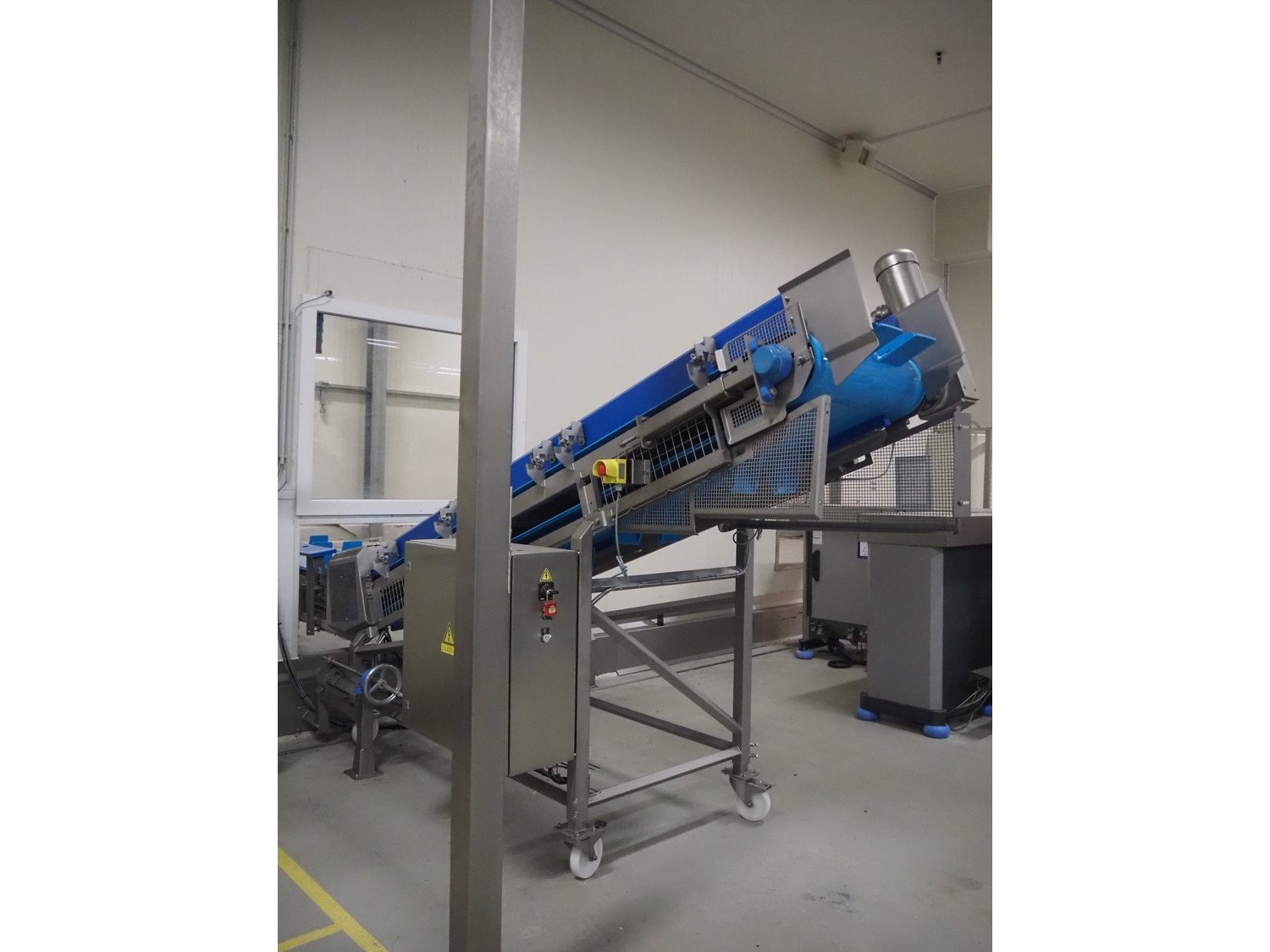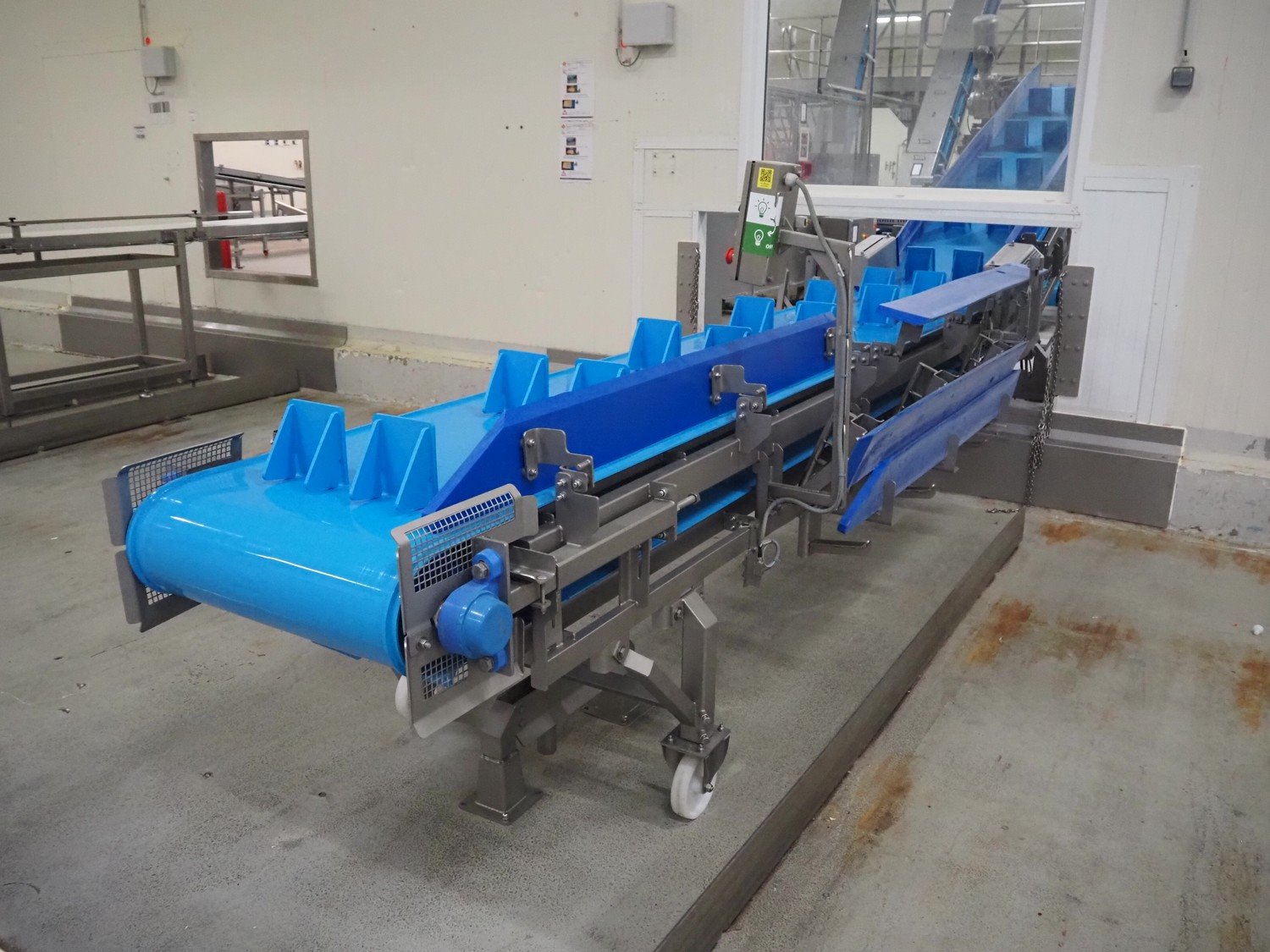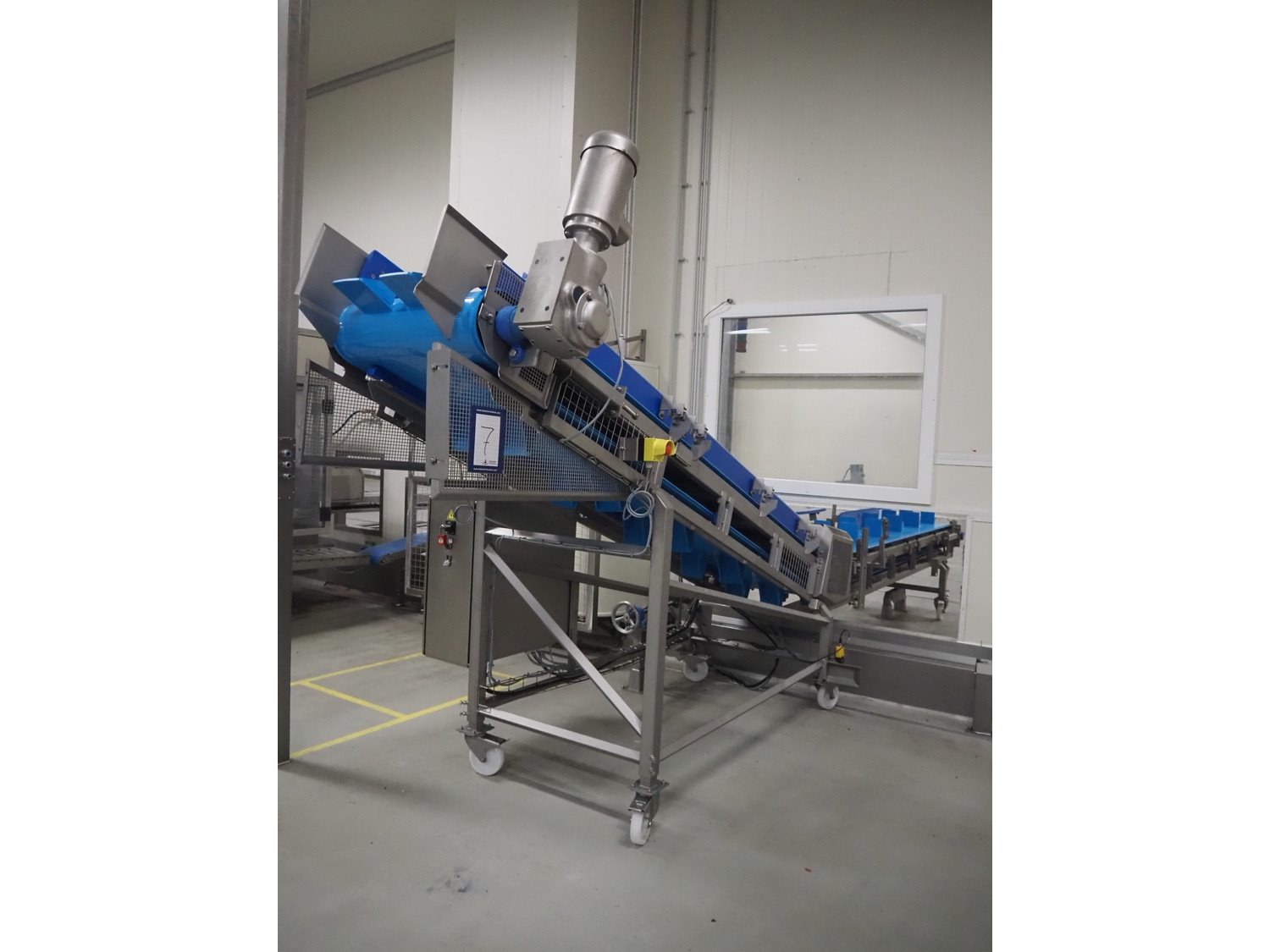 Stumaco mobile elevating belt, type: 20 209 02, year of construction: 2021, plastic belt with dividers, belt width: 680 mm, dividers height: 150 mm, distance between dividers: 550 mm, elevating height: 1950 mm, total dimensions: 7400 mm x 1350 mm x 2430 mm.