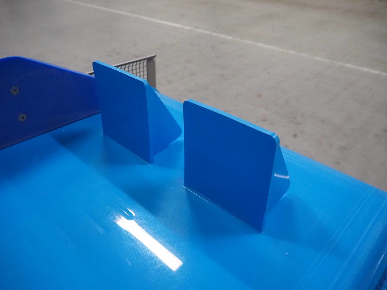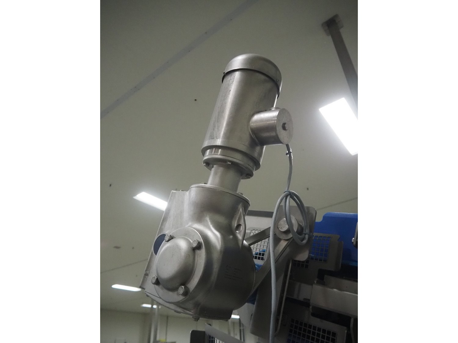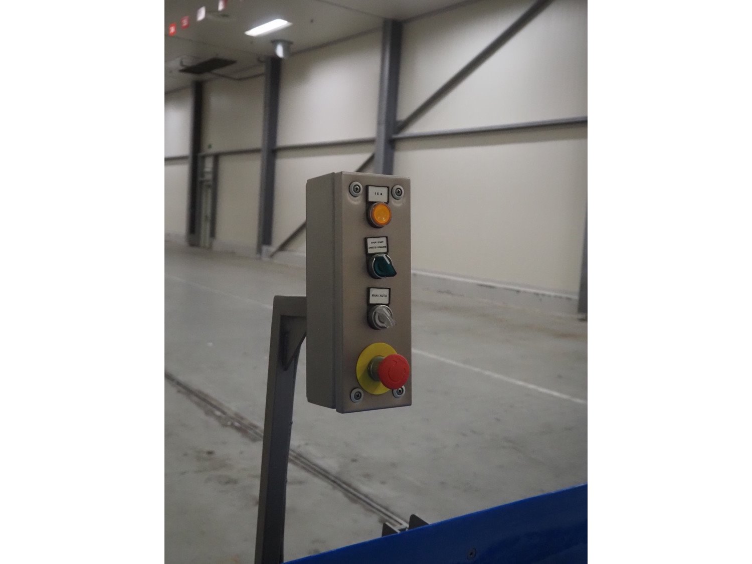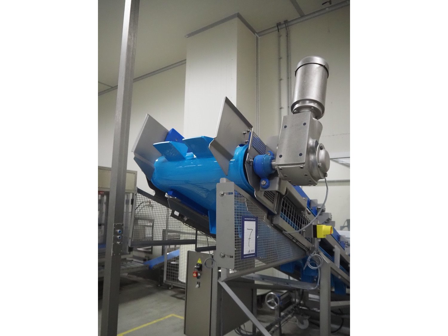 Stumaco mobile elevating belt, type: 20 209 02, year of construction: 2021, plastic belt with dividers, belt width: 680 mm, dividers height: 150 mm, distance between dividers: 550 mm, elevating height: 1950 mm, total dimensions: 7400 mm x 1350 mm x 2430 mm.