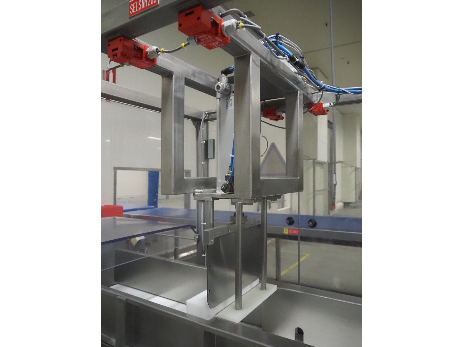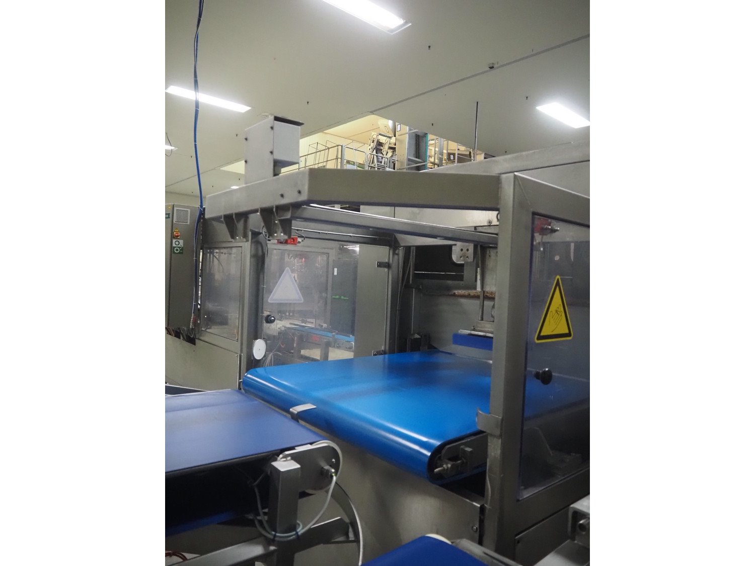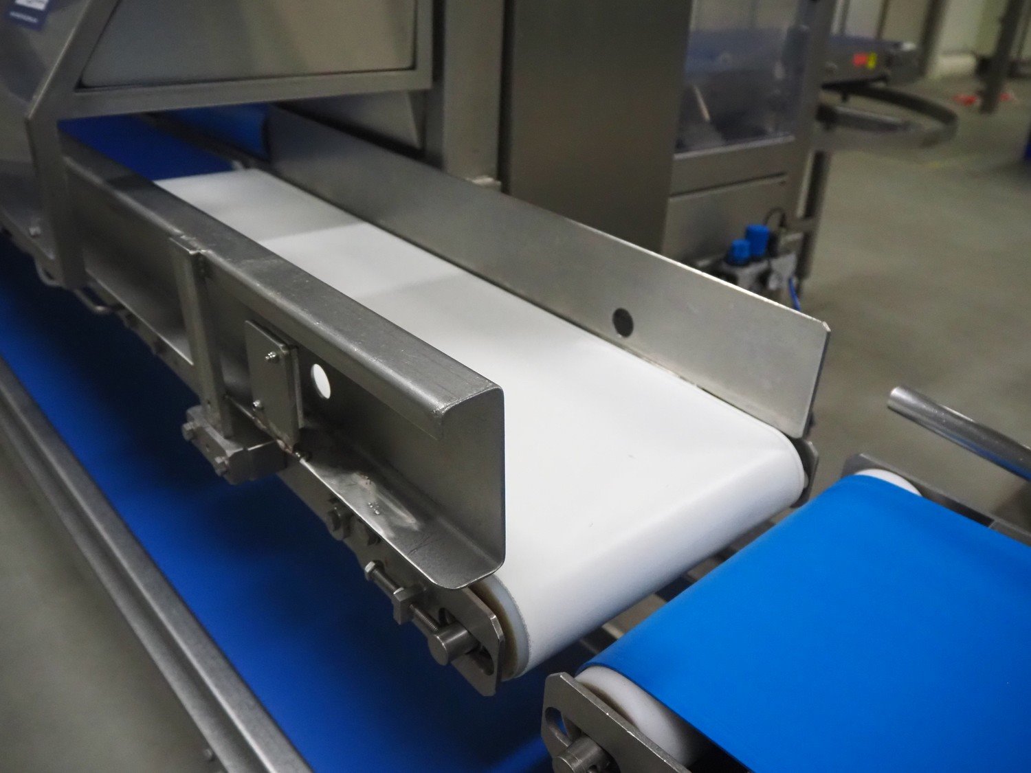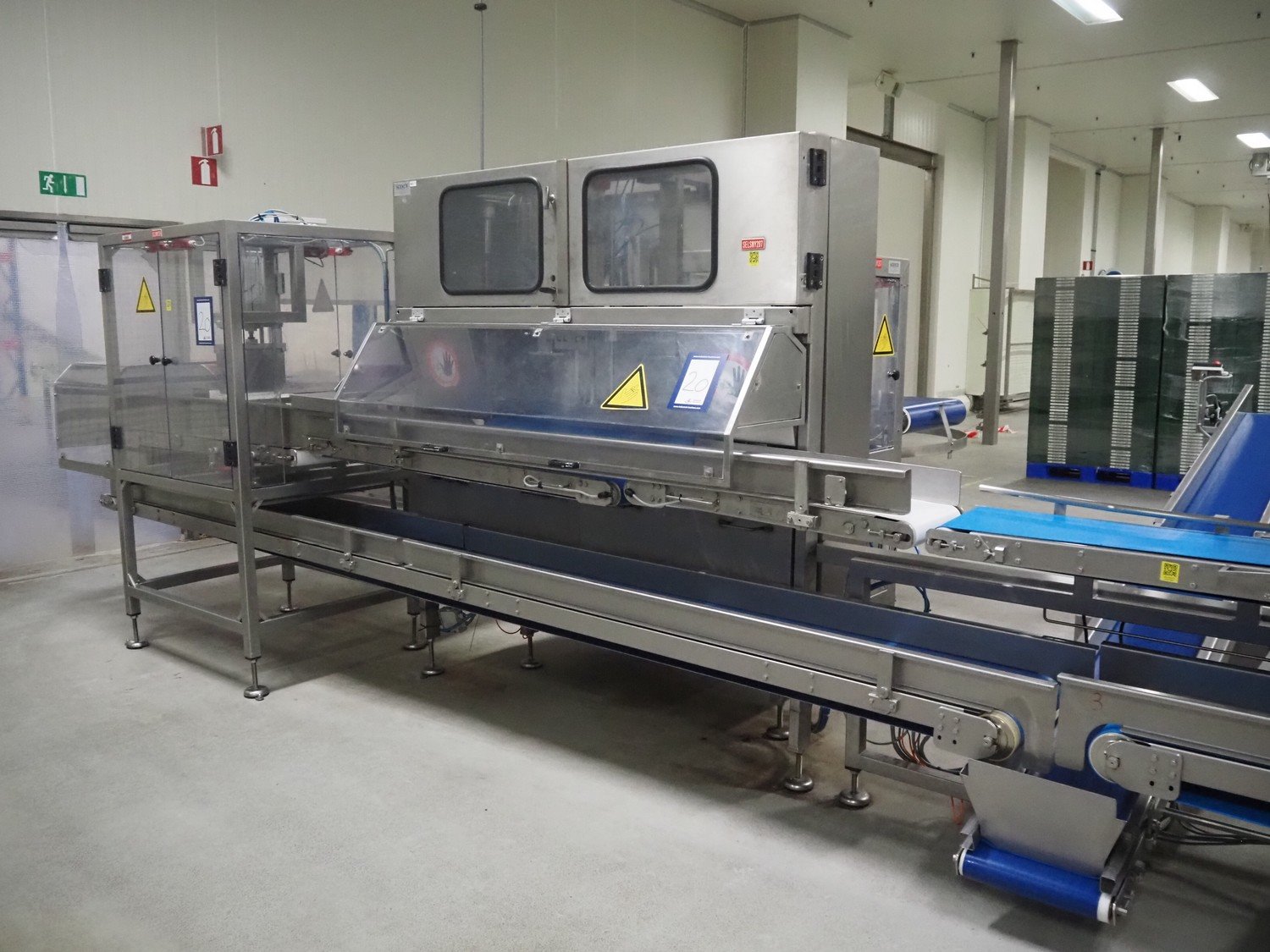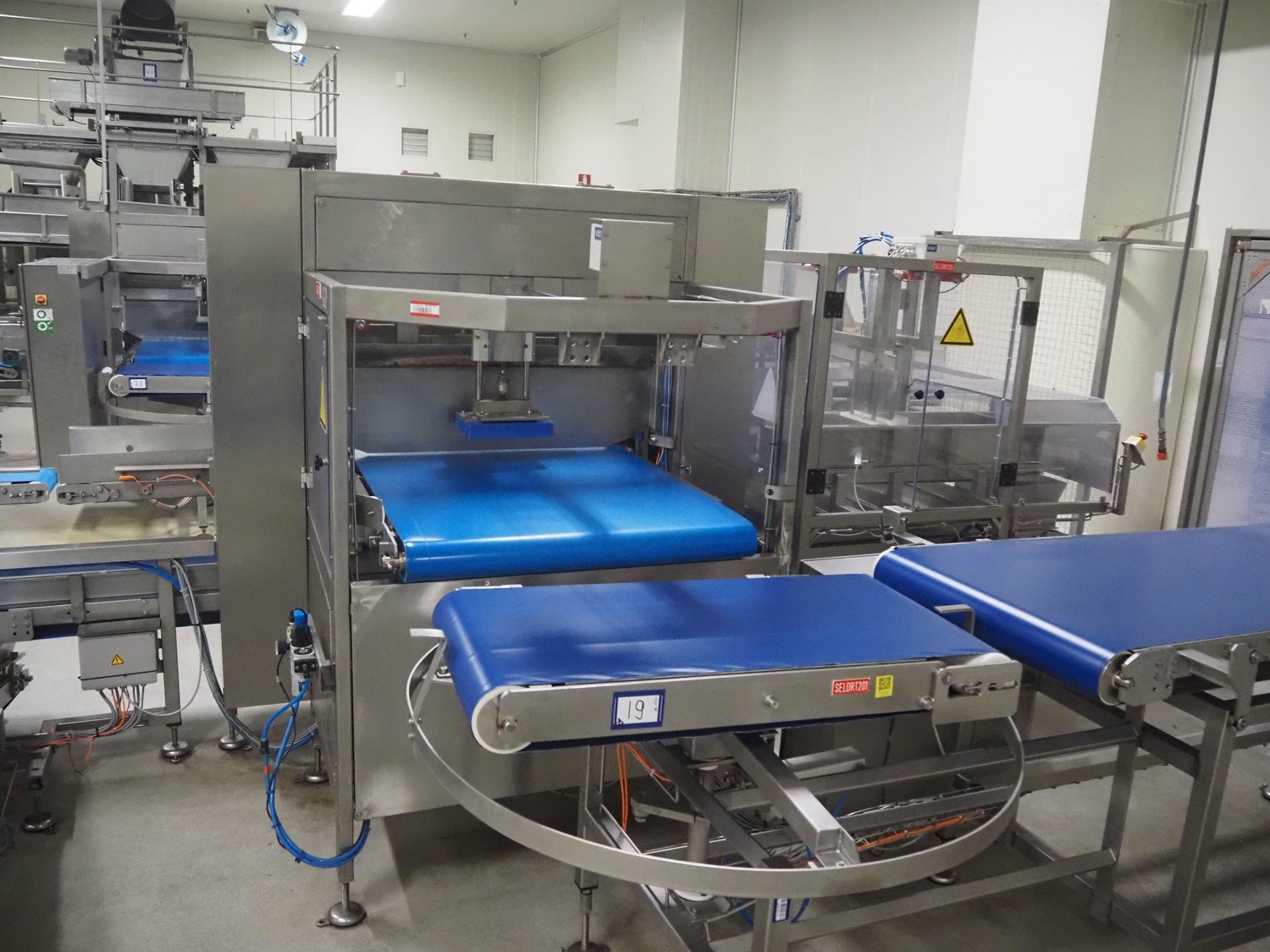 Selvex SA portioning machine, number: COL21-2, year of construction: 2002, 400 V, 3 Ph, 7 kW, infeed plastic belt, belt width: 1000 mm, clearance: 1230 mm x 500 mm, knive width: (1x) 1060 mm (1x) 340 mm, plastic belt, belt width: 350 mm, total dimensions: 2150 mm x 5000 mm x 2100 mm.