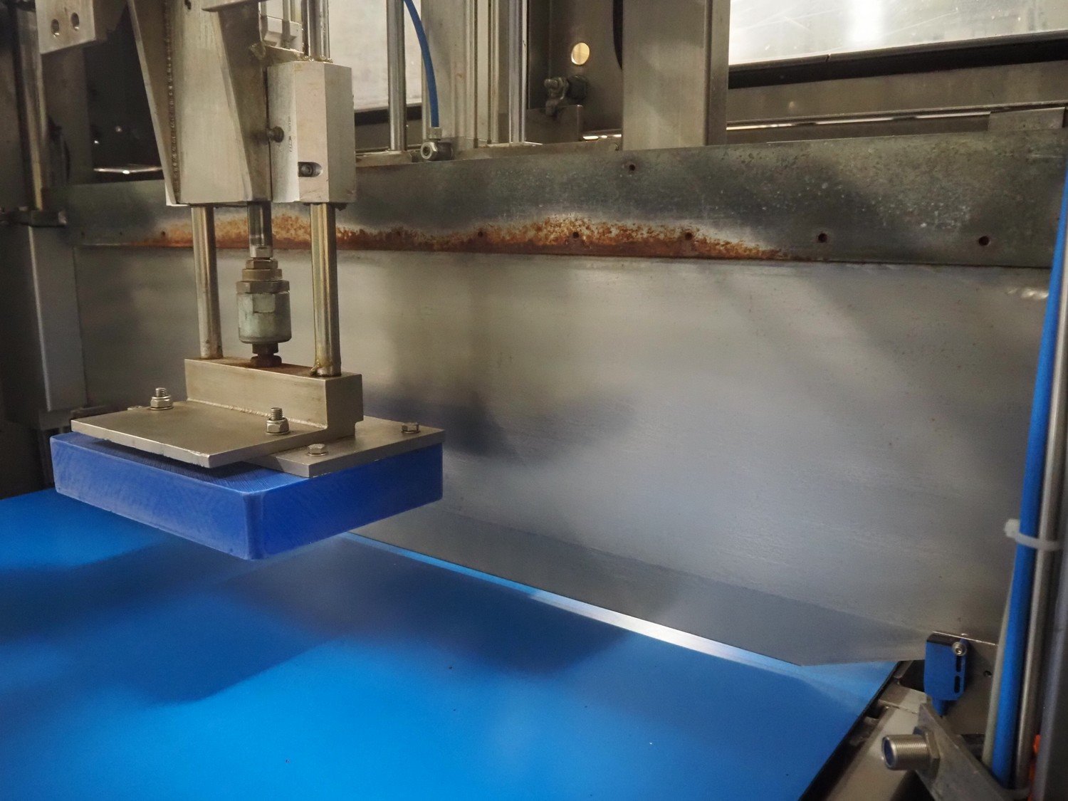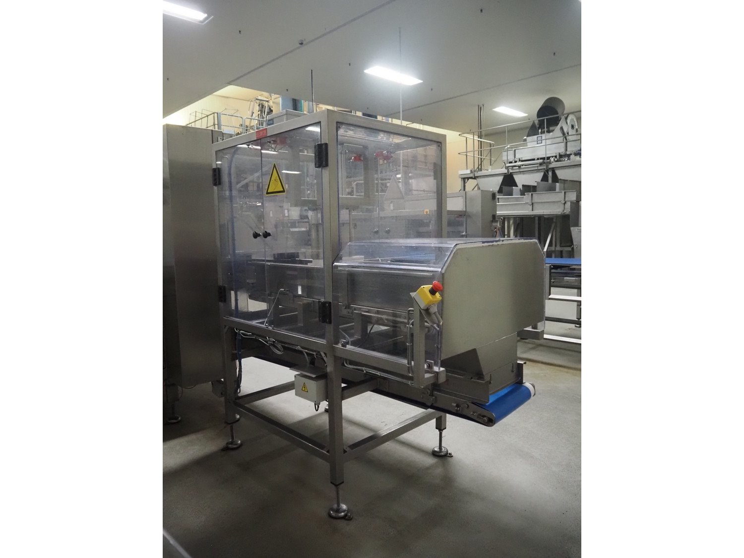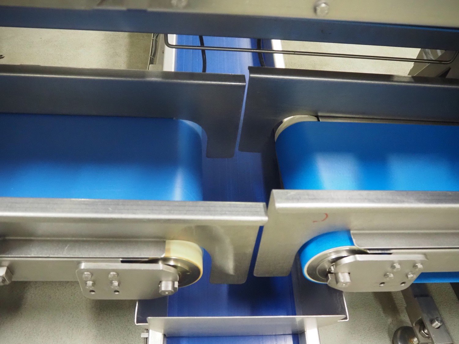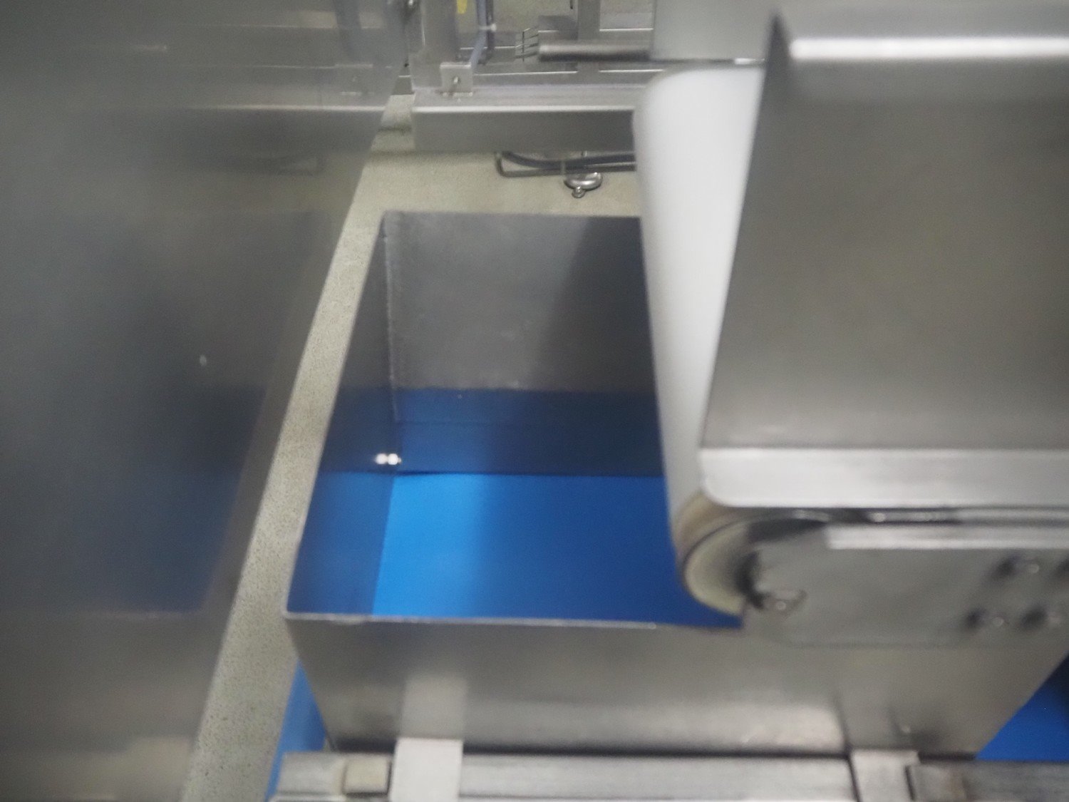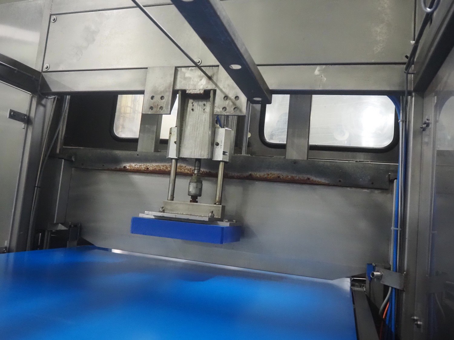 Selvex SA portioning machine, number: COL21-2, year of construction: 2002, 400 V, 3 Ph, 7 kW, infeed plastic belt, belt width: 1000 mm, clearance: 1230 mm x 500 mm, knive width: (1x) 1060 mm (1x) 340 mm, plastic belt, belt width: 350 mm, total dimensions: 2150 mm x 5000 mm x 2100 mm.