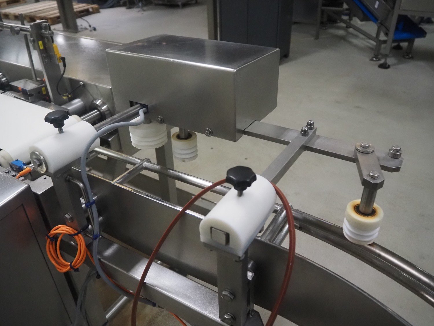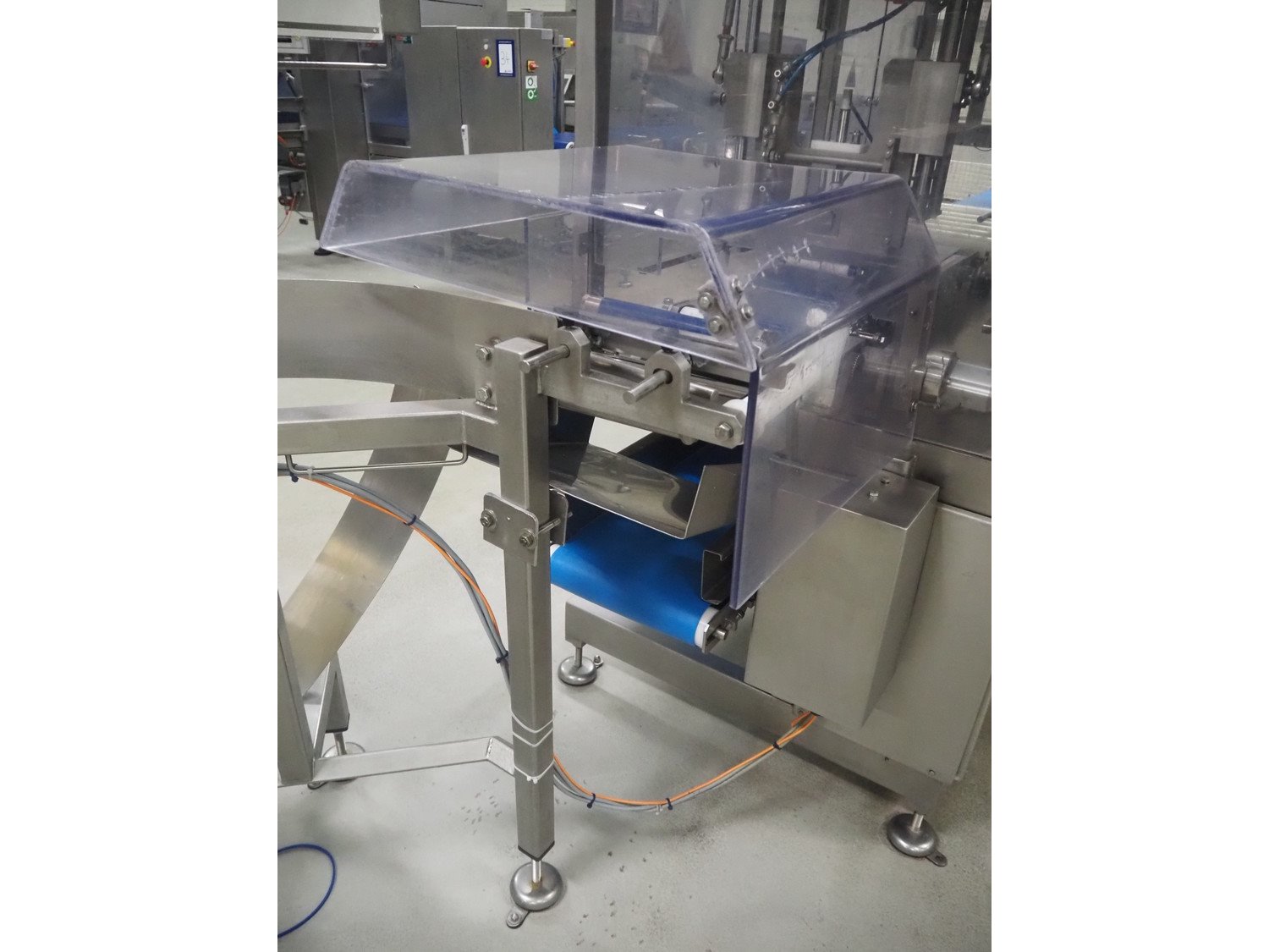 Buffer belt with 90° infeed curve conveyor, plastic mesh belt, belt width: 190 mm, 5 stations, plastic belt, belt width: (5x) 200 mm, dimensions infeed belt: 1270 mm x 1360 mm x 1260 mm, dimensions buffer belt: 2650 mm x 780 mm x 1300 mm.