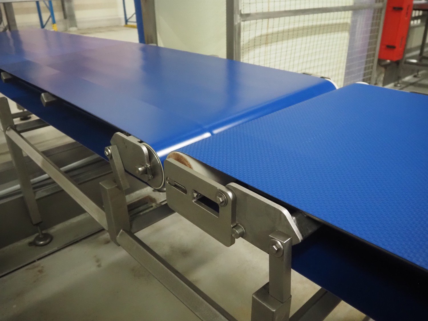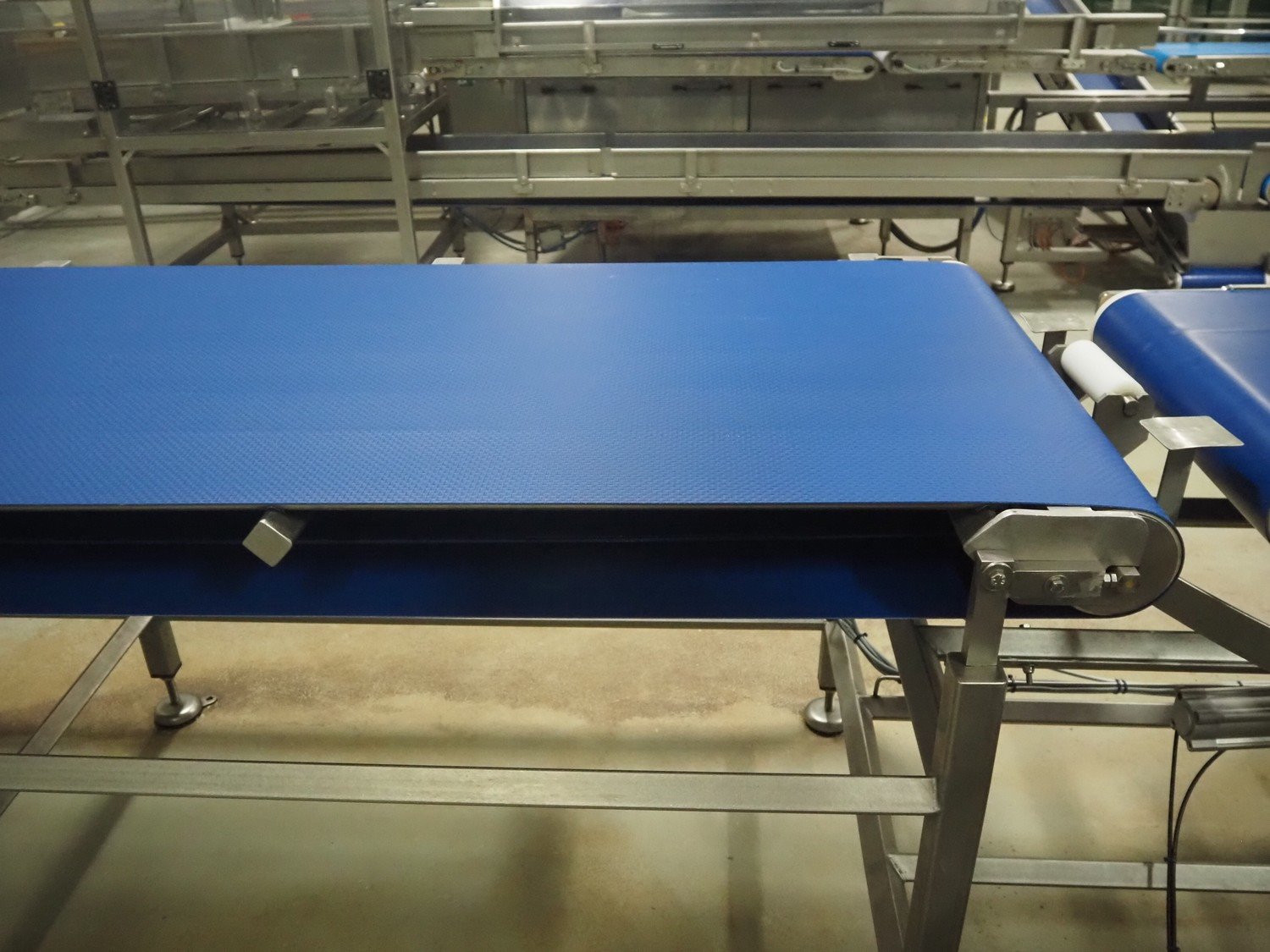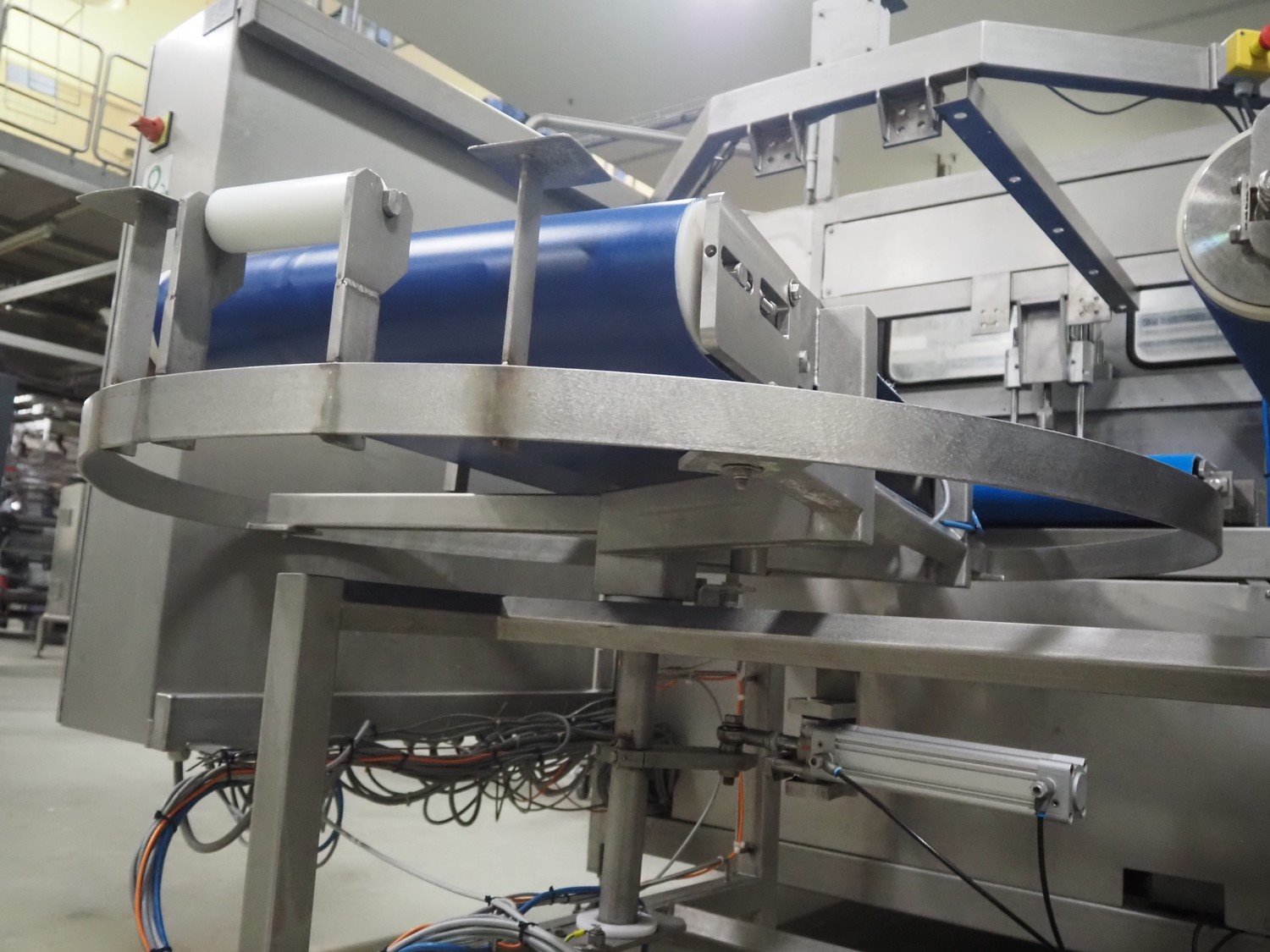 Transport system with turning device, plastic belt, belt width: (2x) 790 mm, (1x) 550 mm, diameter turning device: 330 mm, total dimensions: 8040 mm x 1350 mm x 990 mm.