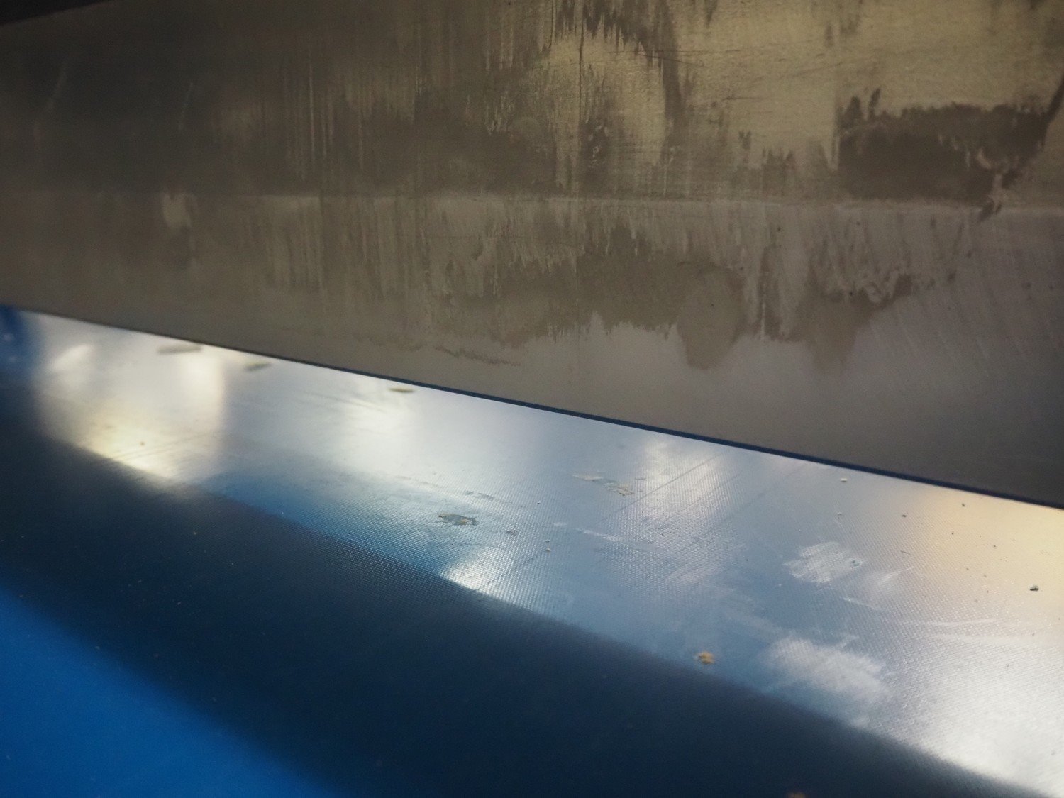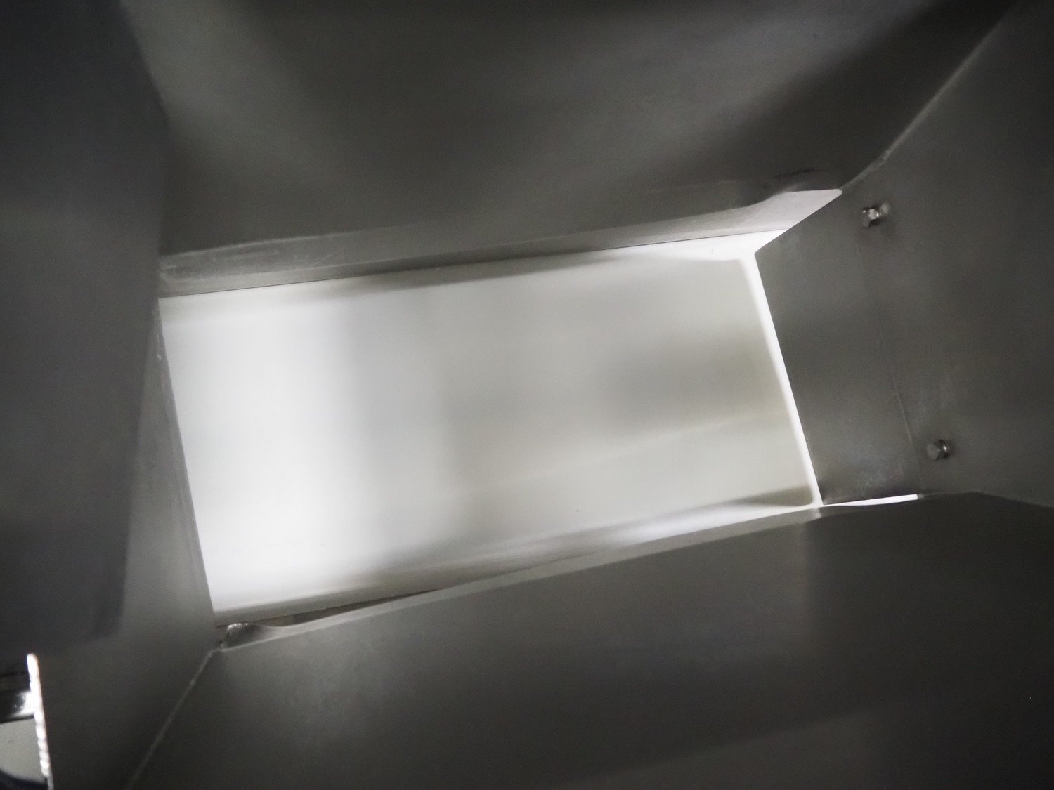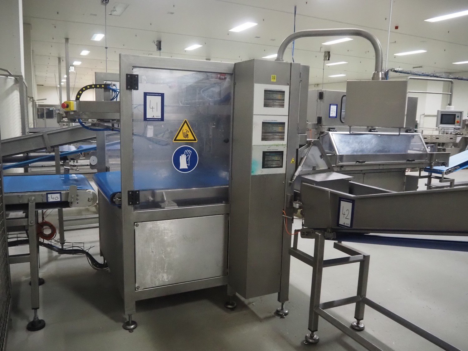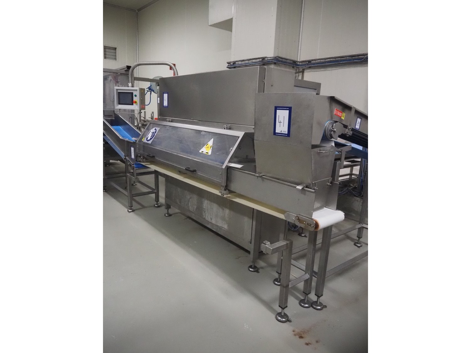 Portioning machine, plastic belt, belt width: (1x) 1000 mm and (1x) 300 mm, clearance: 1260 mm x 420 mm, knive width: 1200 mm, total dimensions: 2100 mm x 3060 mm x 2200 mm.
