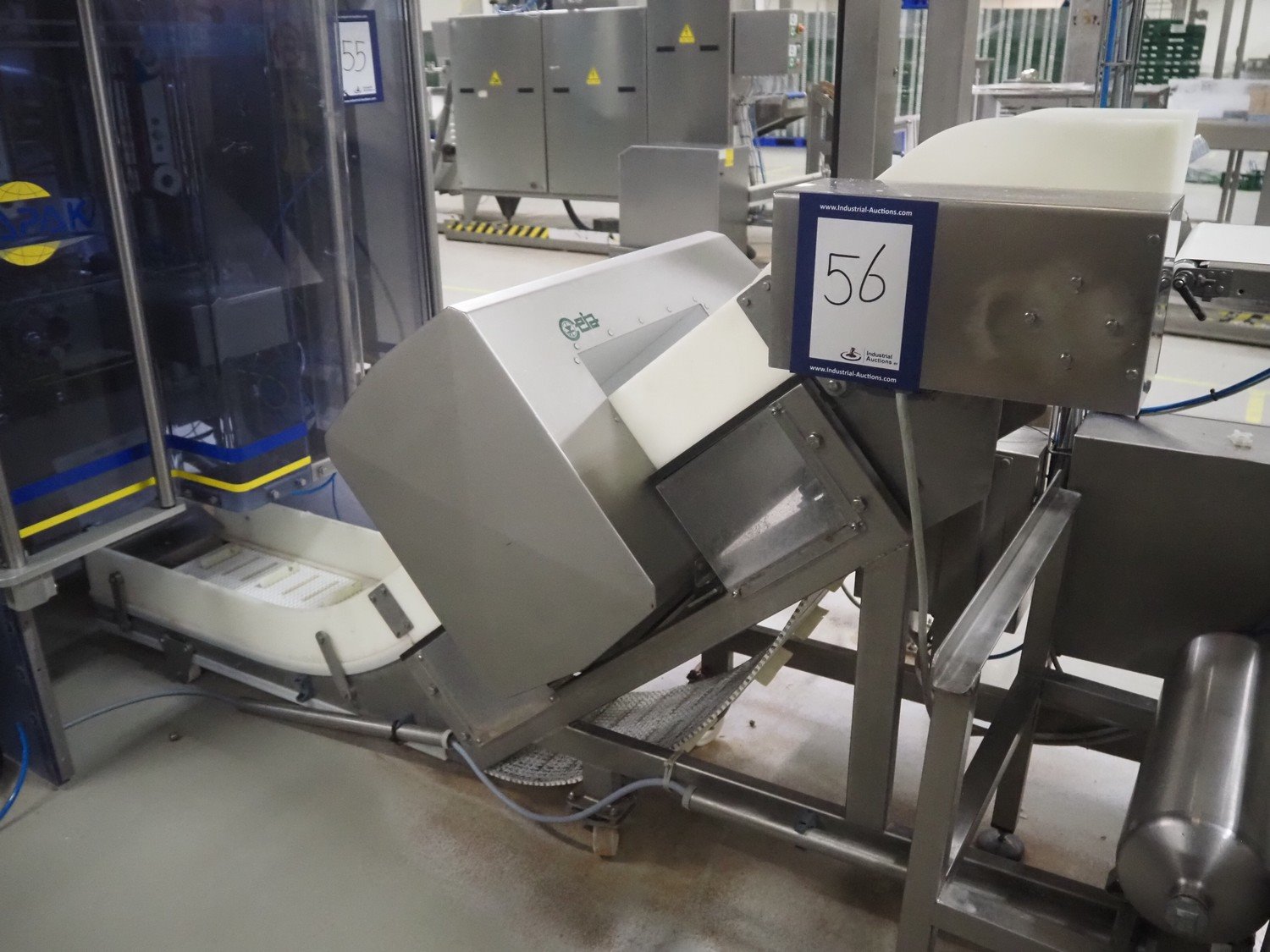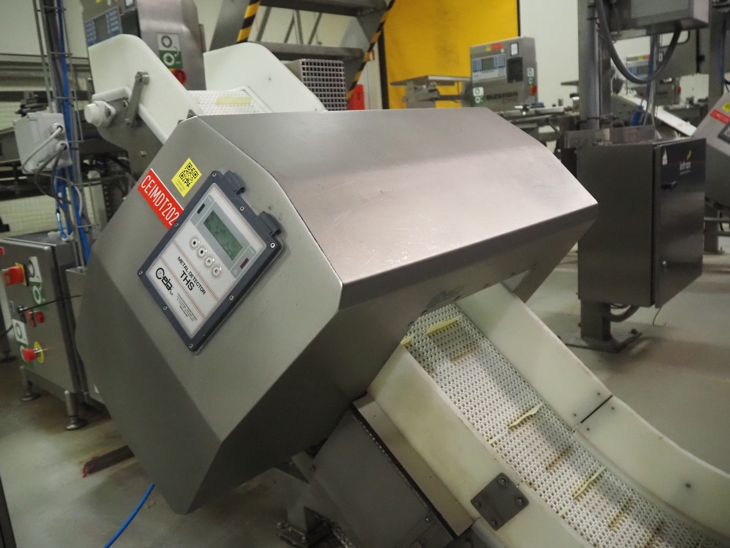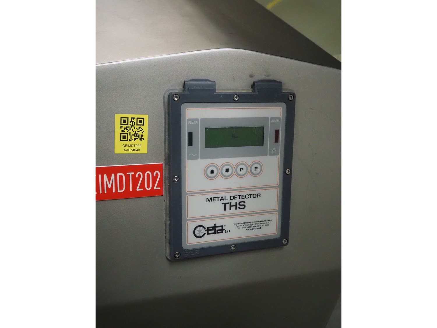 Ceia metal detector on elevating belt, model: THS, serial number: 20500210016, plastic mesh belt with dividers, belt width: 330 mm, dividers height: 25 mm, distance between dividers: 210 mm, clearance: 400 mm x 200 mm, elevating height: 1100 mm, total dimensions: 2300 mm x 900 mm x 1250 mm.