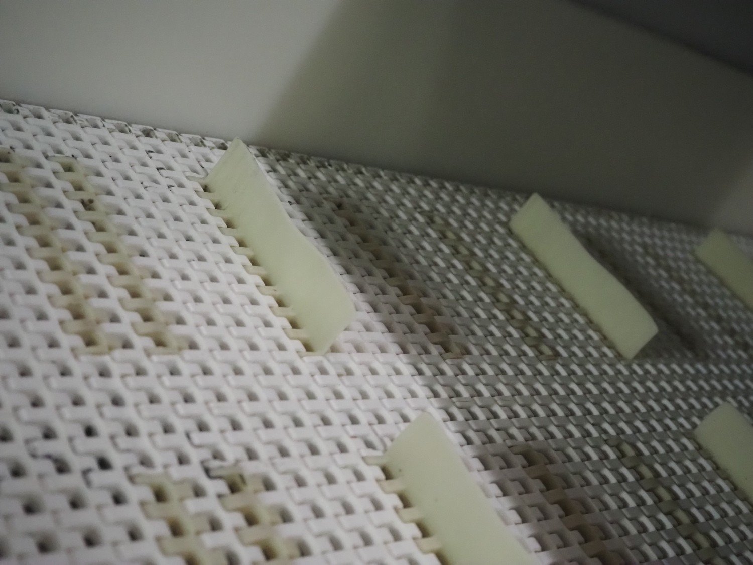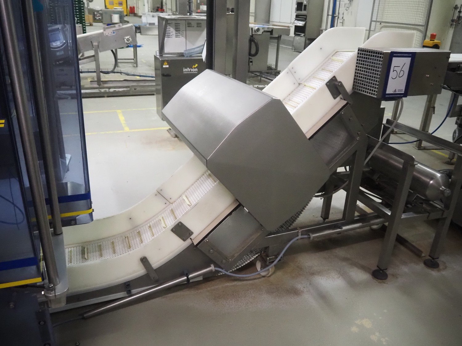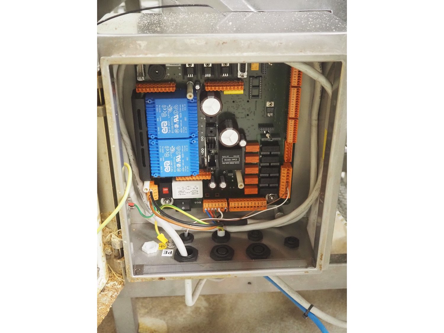Ceia metal detector on elevating belt, model: THS, serial number: 20500210016, plastic mesh belt with dividers, belt width: 330 mm, dividers height: 25 mm, distance between dividers: 210 mm, clearance: 400 mm x 200 mm, elevating height: 1100 mm, total dimensions: 2300 mm x 900 mm x 1250 mm.