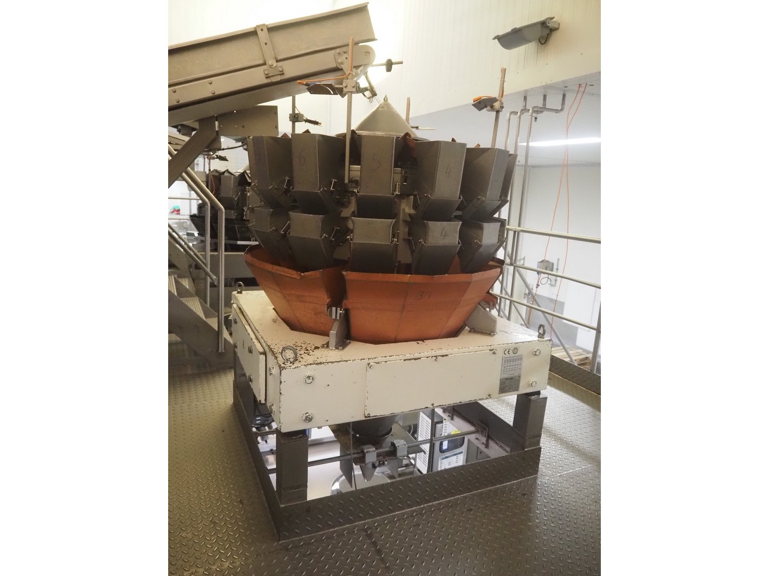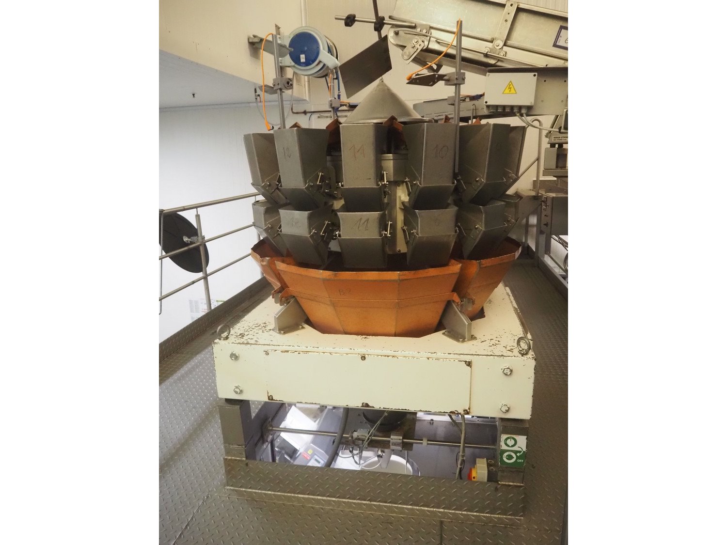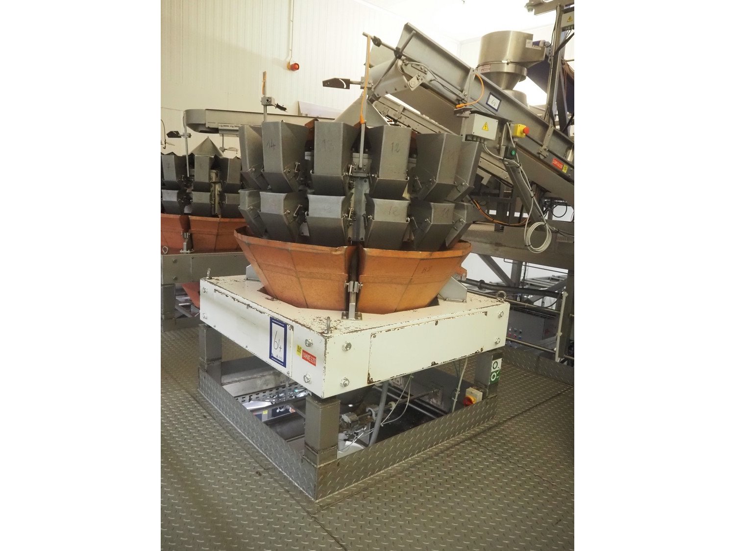 Yamato 14-heads multihead weigher, model: ADW-514SD, serial number: WG 990491, weight range: 20 g, - 2000 g, 220/240 V, 1 Ph, 50/60 Hz, 10 A, each basket: 110 mm x 140 mm x 280 mm, total dimensions: 1250 mm x 1250 mm x 1850 mm.