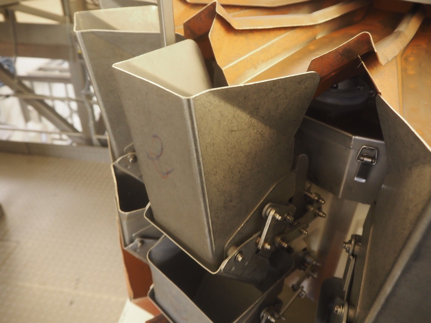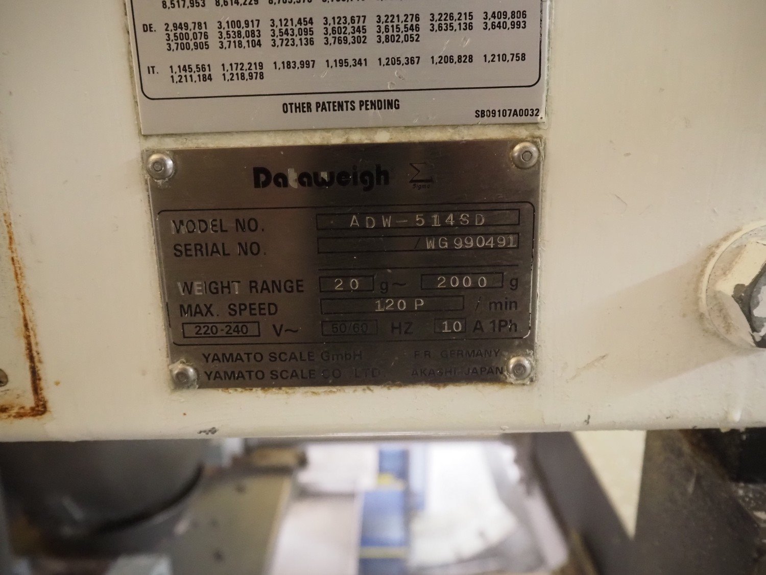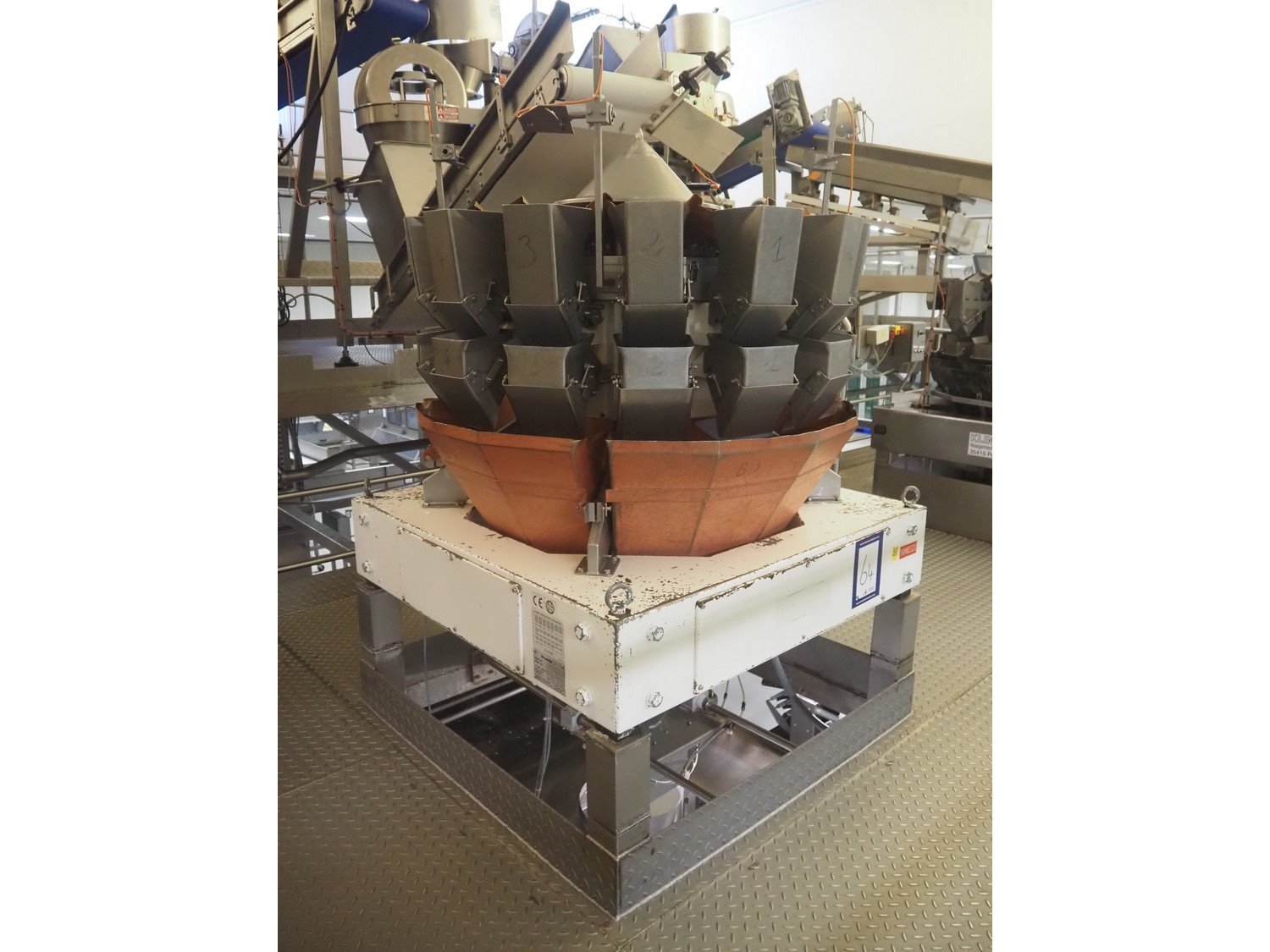 Yamato 14-heads multihead weigher, model: ADW-514SD, serial number: WG 990491, weight range: 20 g, - 2000 g, 220/240 V, 1 Ph, 50/60 Hz, 10 A, each basket: 110 mm x 140 mm x 280 mm, total dimensions: 1250 mm x 1250 mm x 1850 mm.