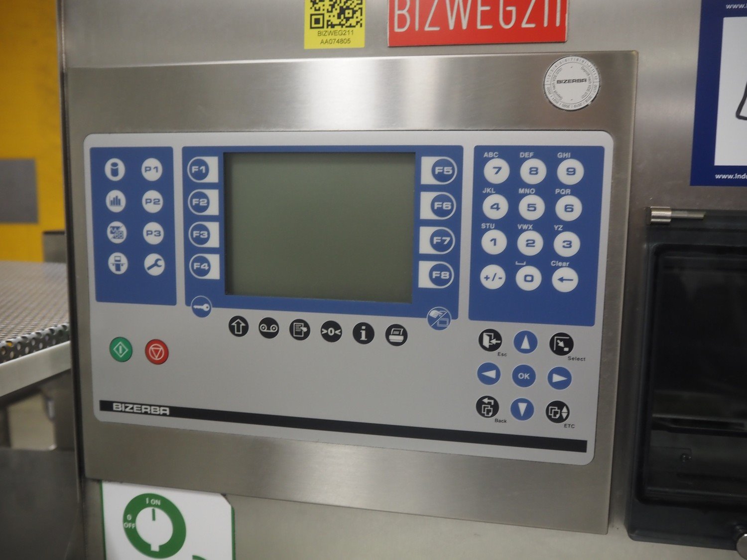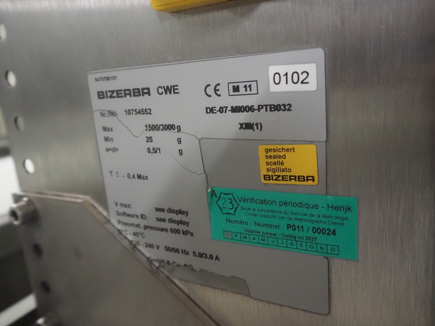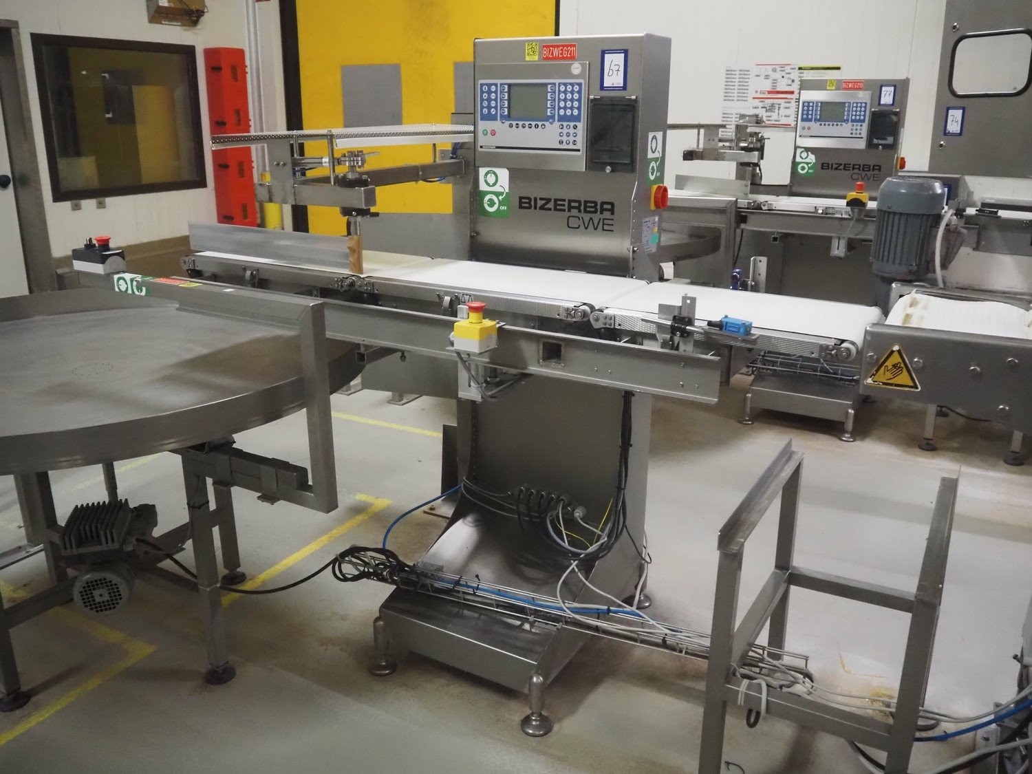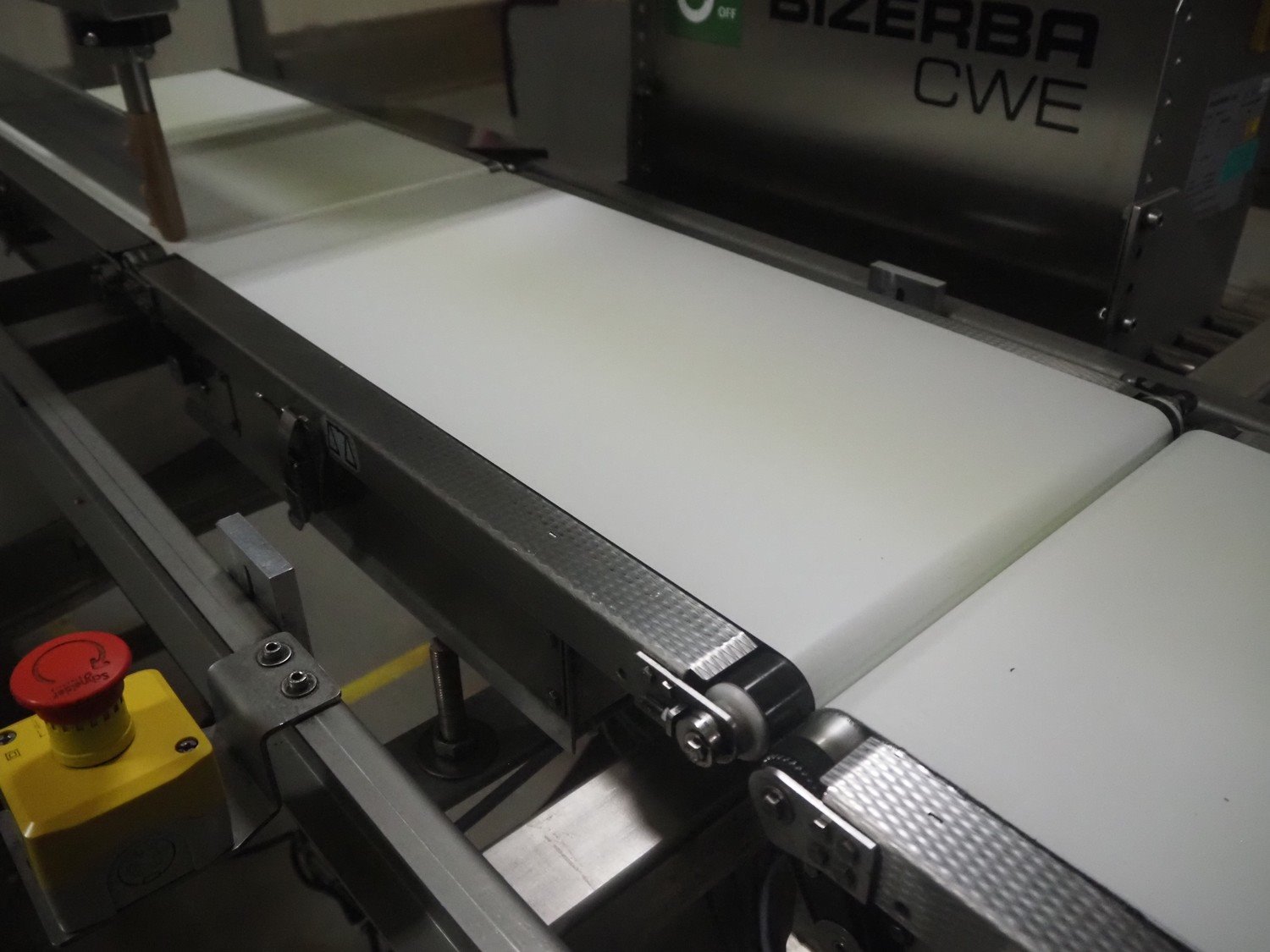 Bizerba checkweigher with rejector, model: CWE, serial number: 10754552, year of construction: M 11, 220/240 V, 50/60 Hz, 5.0/3.0 A, maximum: 1500/3000 g, minimum: 50 g, e=d= 0.5/1 g, plastic belt, belt width: (3x) 300 mm, total dimensions: 1820 mm x 930 mm x 1700 mm.