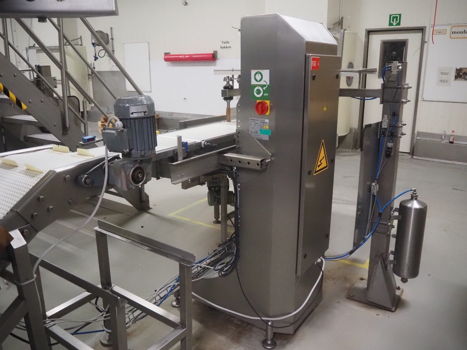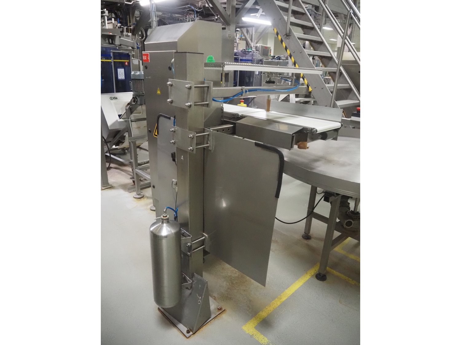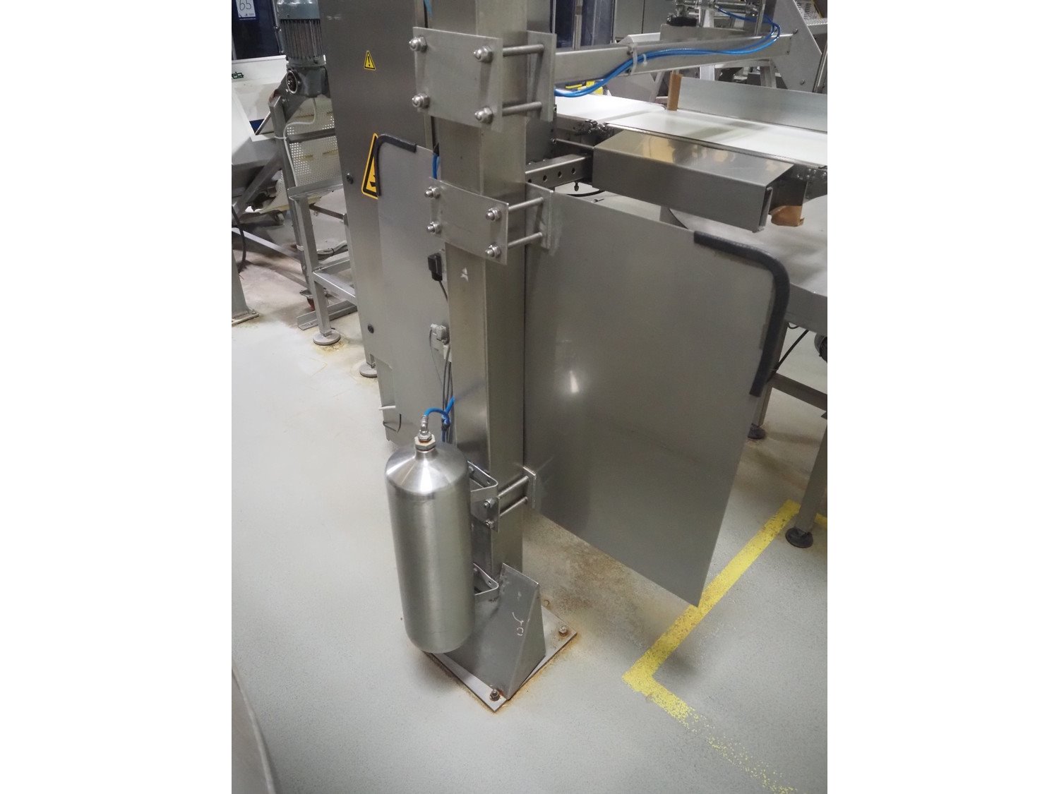 Bizerba checkweigher with rejector, model: CWE, serial number: 10754552, year of construction: M 11, 220/240 V, 50/60 Hz, 5.0/3.0 A, maximum: 1500/3000 g, minimum: 50 g, e=d= 0.5/1 g, plastic belt, belt width: (3x) 300 mm, total dimensions: 1820 mm x 930 mm x 1700 mm.