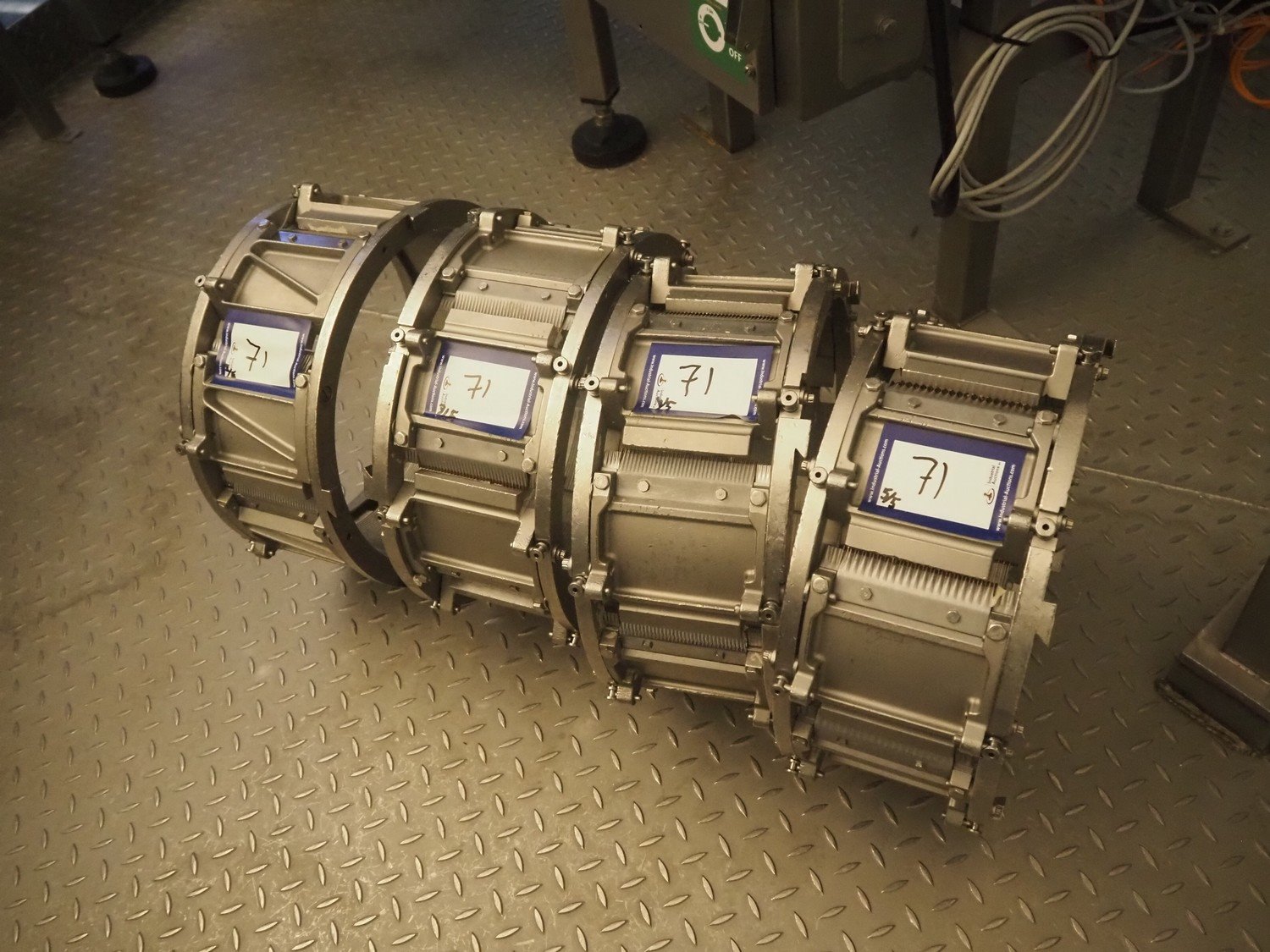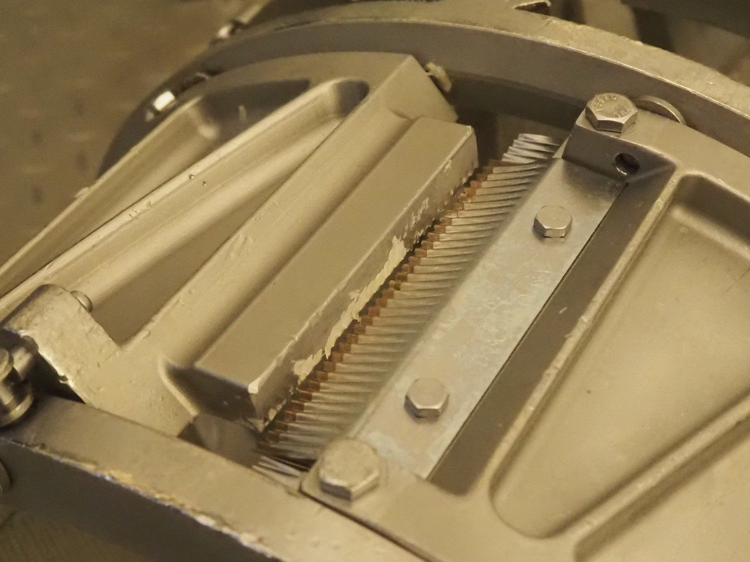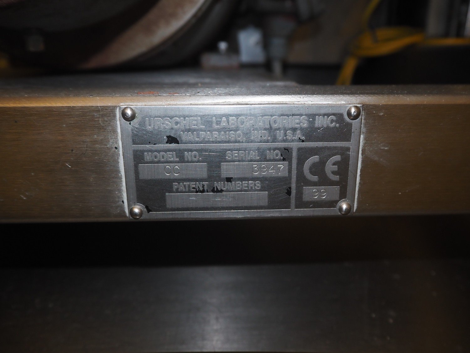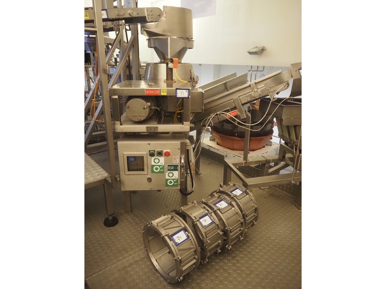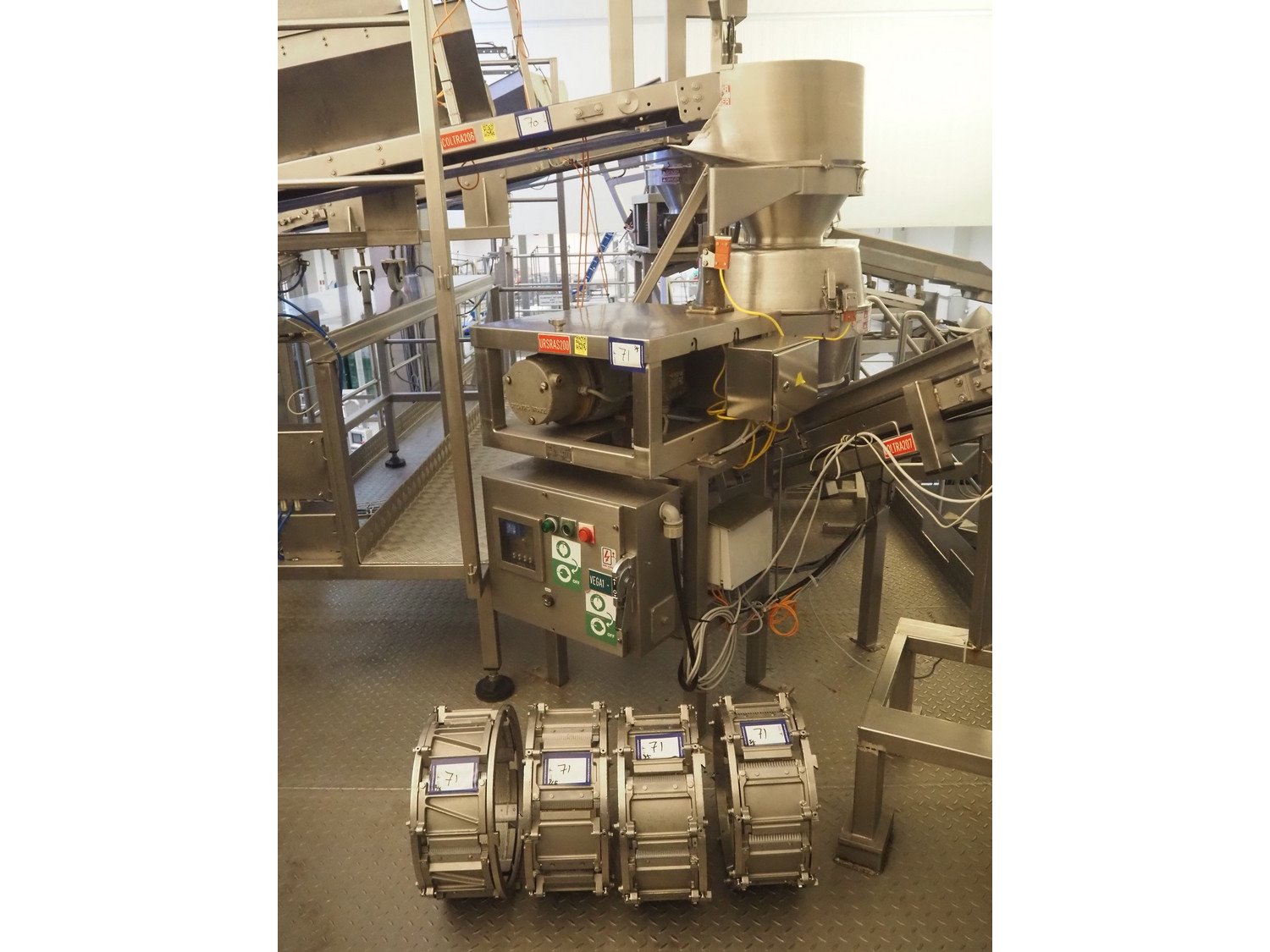Urschel slicer/shredder, model: CC, serial number: 3947, year of construction: 1999, infeed diameter: 450 mm, knive diameter: 410 mm, knive width: 100 mm, total dimensions: 1550 mm x 1300 mm x 2240 mm. Including 3 extra knives.
