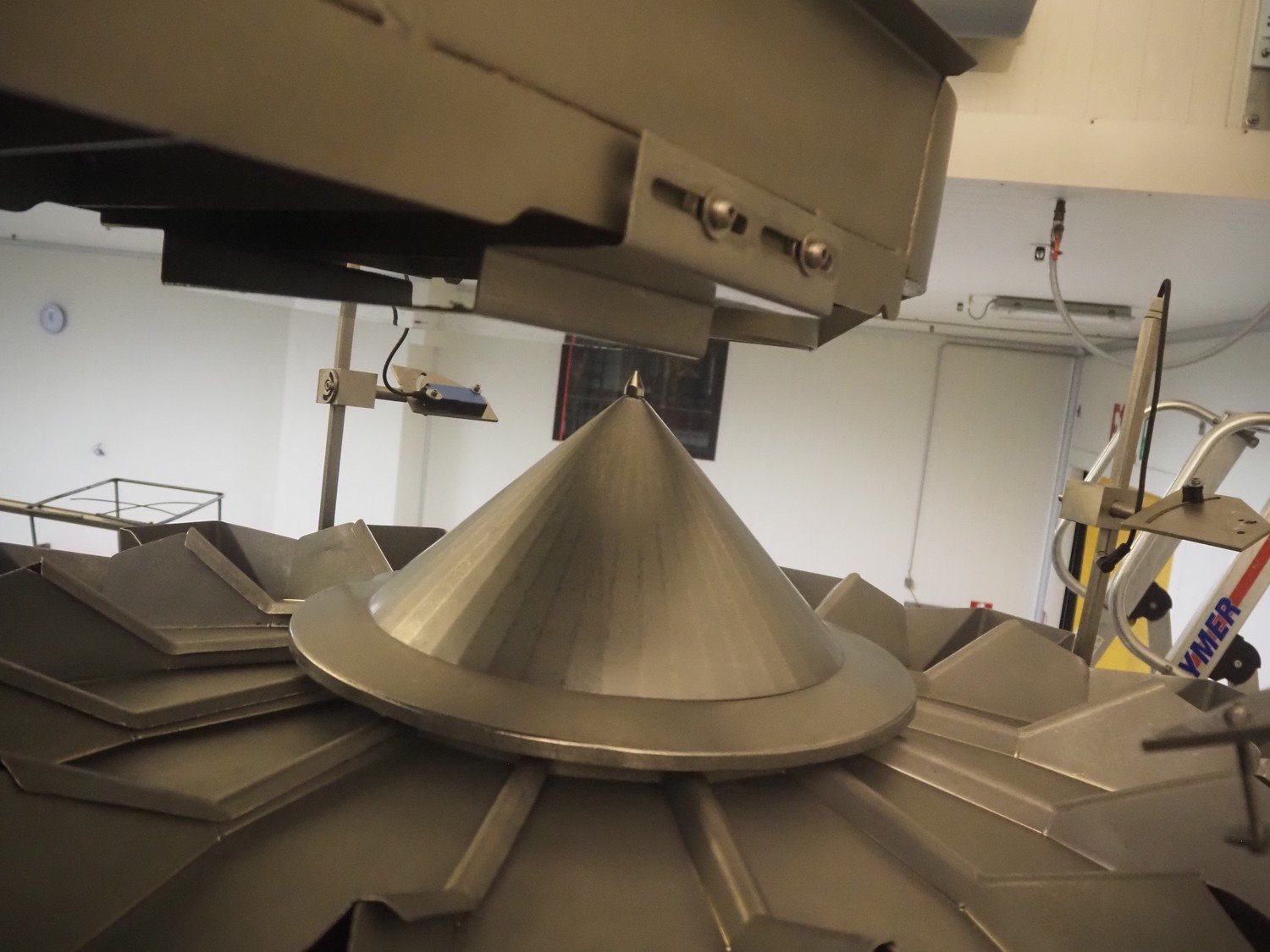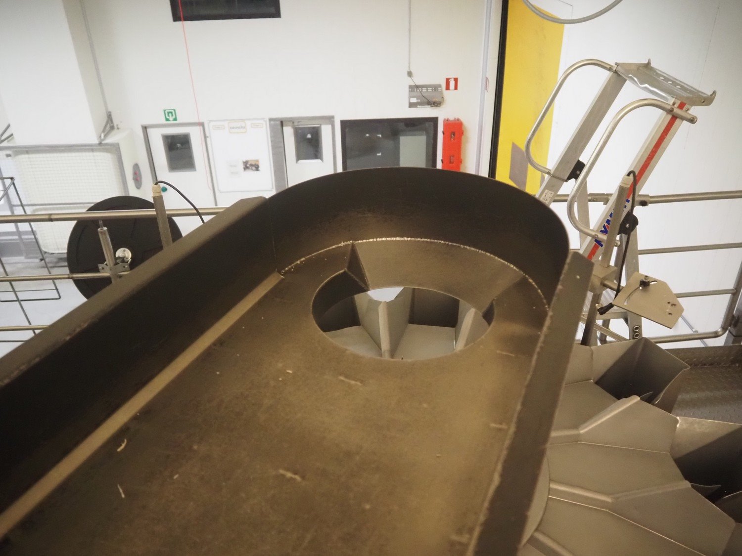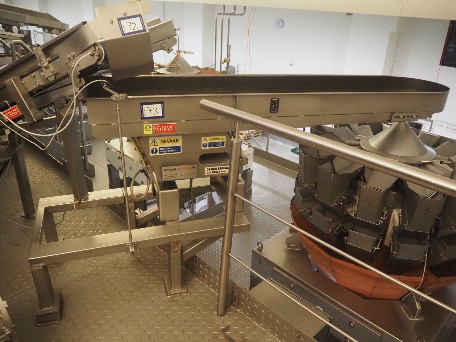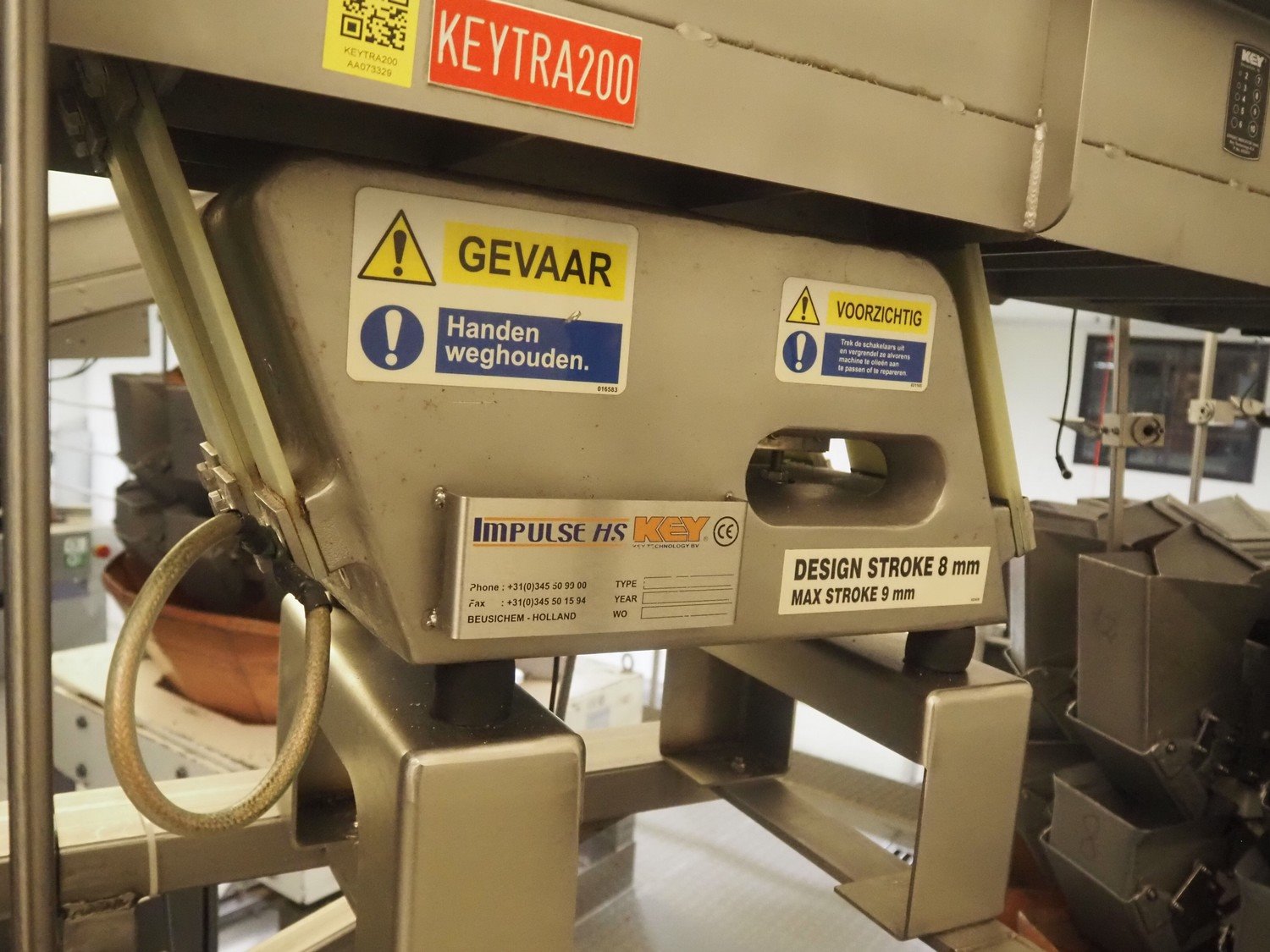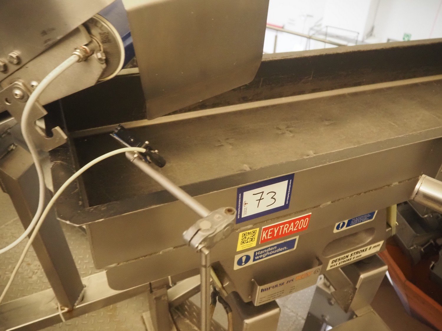 Impulse HS Key vibrating gutter, type: MVEIC, serial number: 4209348, year of construction: 2006, gutter length: 2050 mm, gutter width: 400 mm, outfeed diameter: Ø 250 mm, total dimensions: 2000 mm x 480 mm x 650 mm.