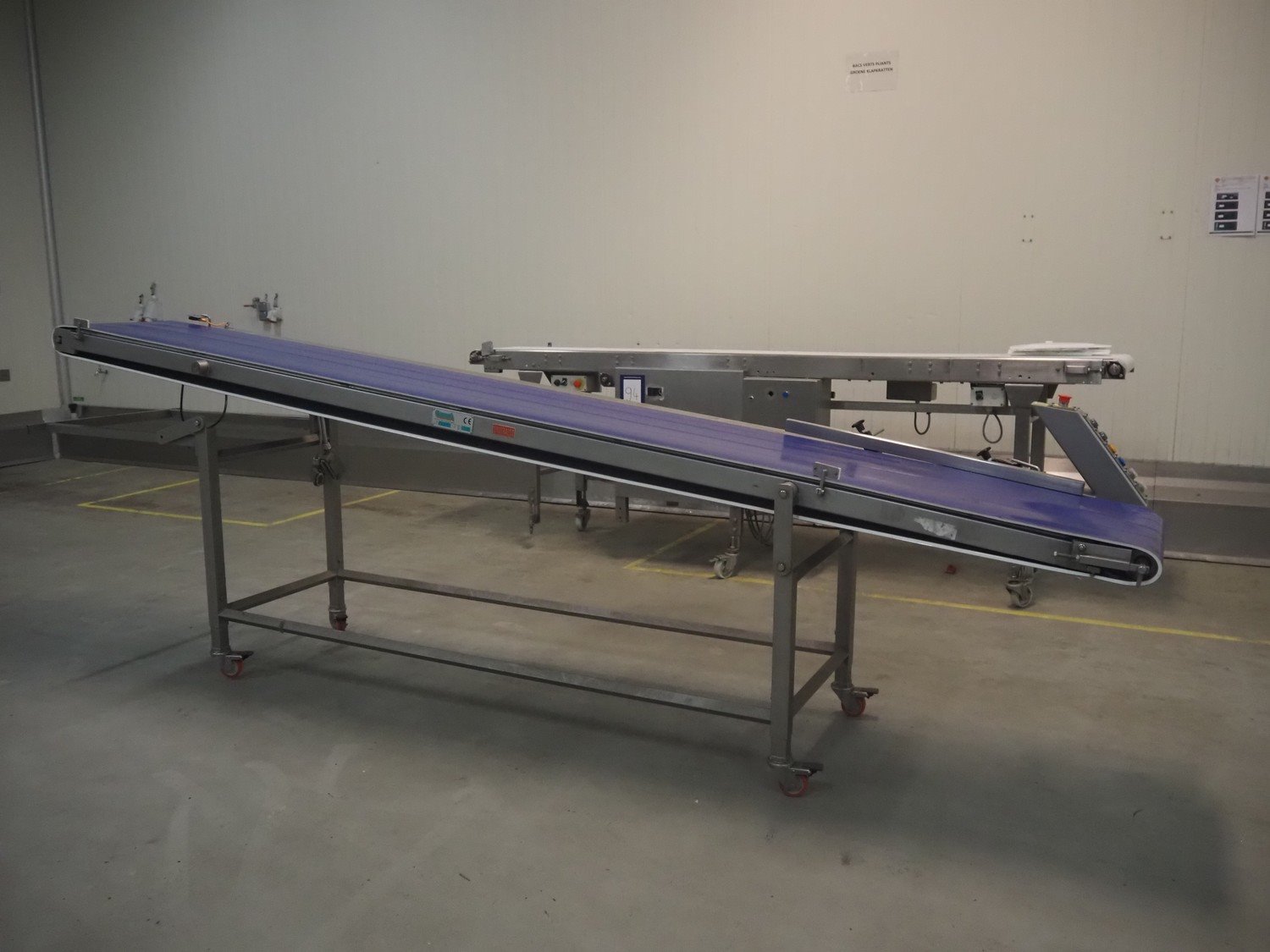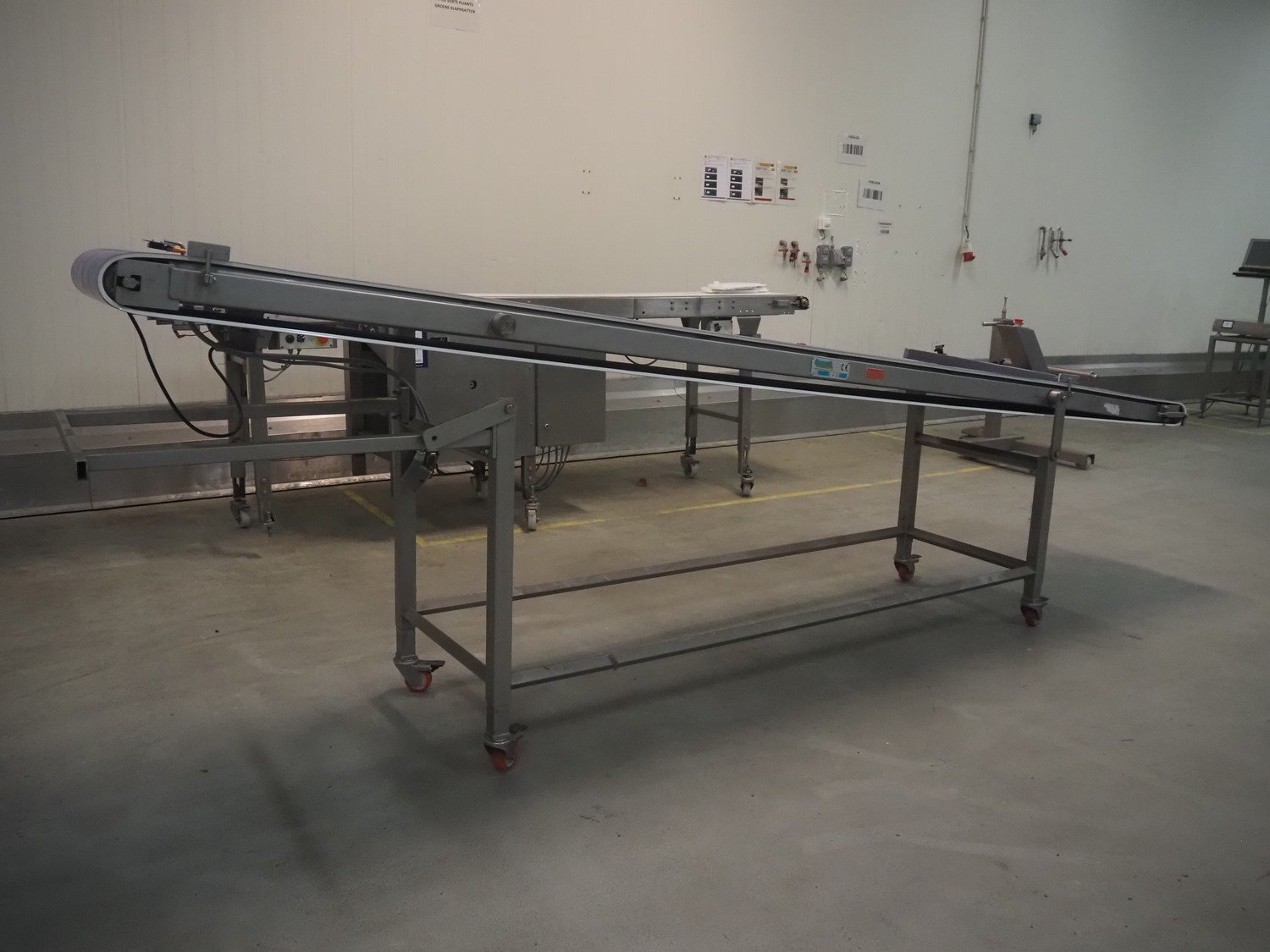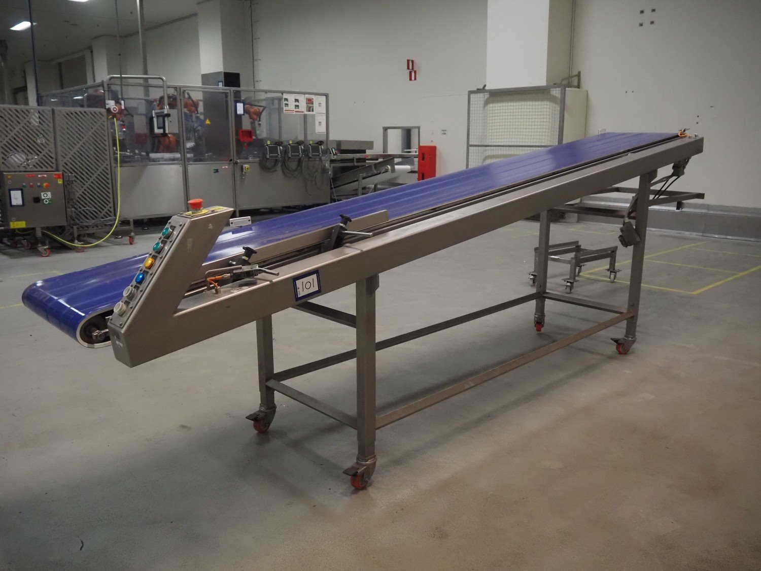Groba mobile elevating belt, type: TB-504, year of construction: 2005, weight: 230 kg, plastic belt, belt width: 500 mm, elevating height: 1330 mm, total dimensions: 4000 mm x 770 mm x 1350 mm.