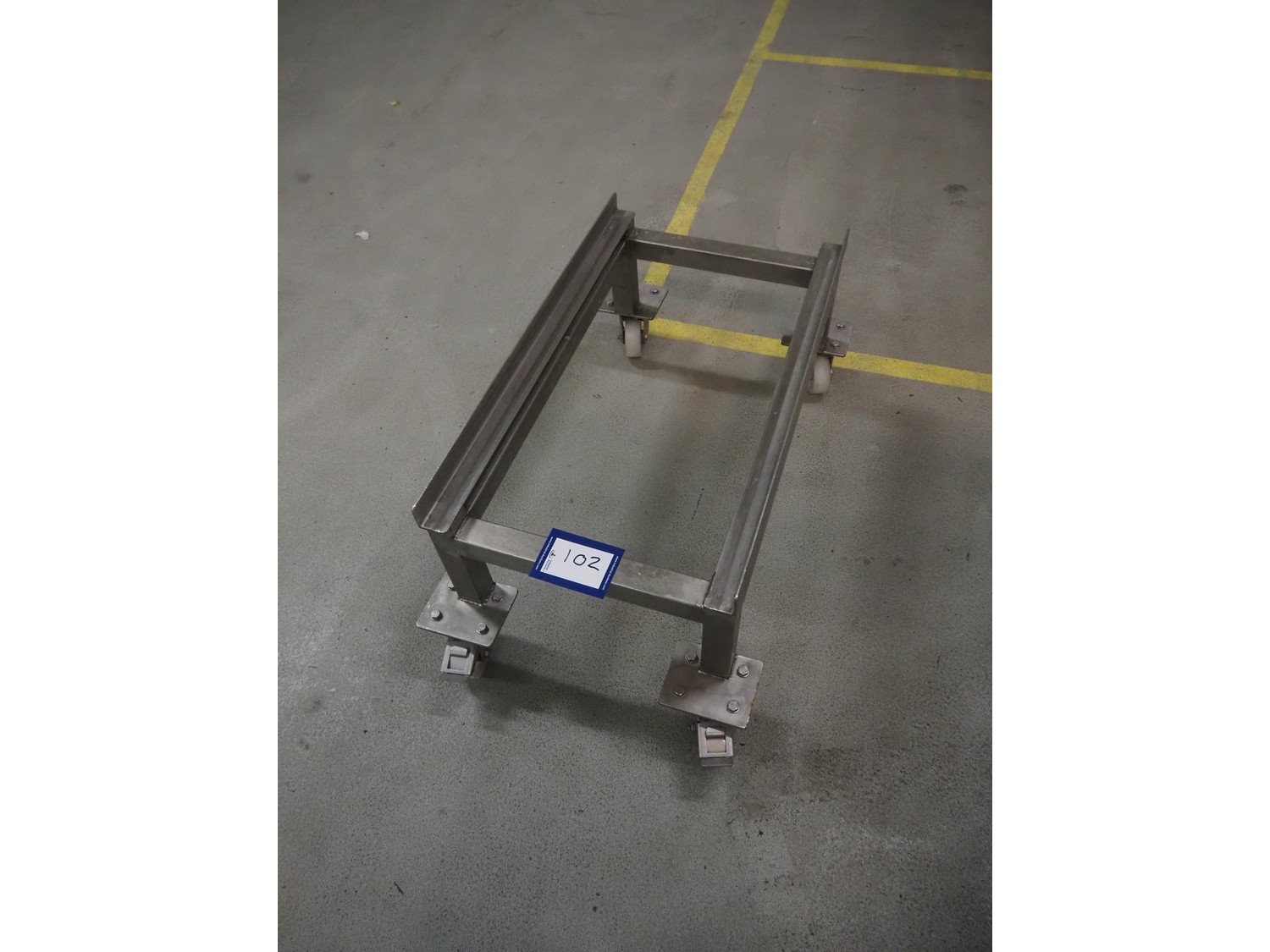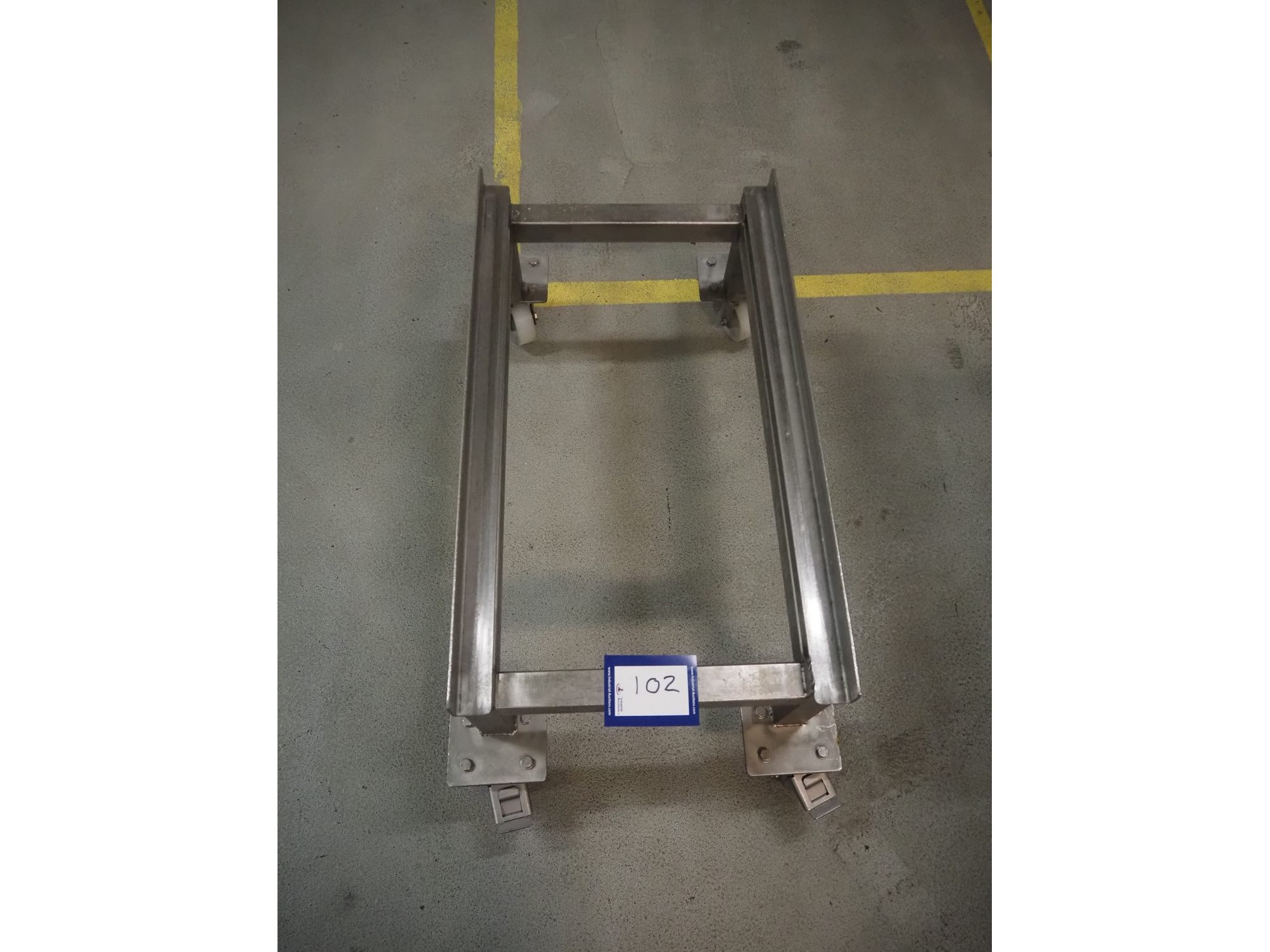 S/s trolley for crates, clearance: 730 mm x 400 mm, total dimensions: 830 mm x 490 mm x 340 mm.