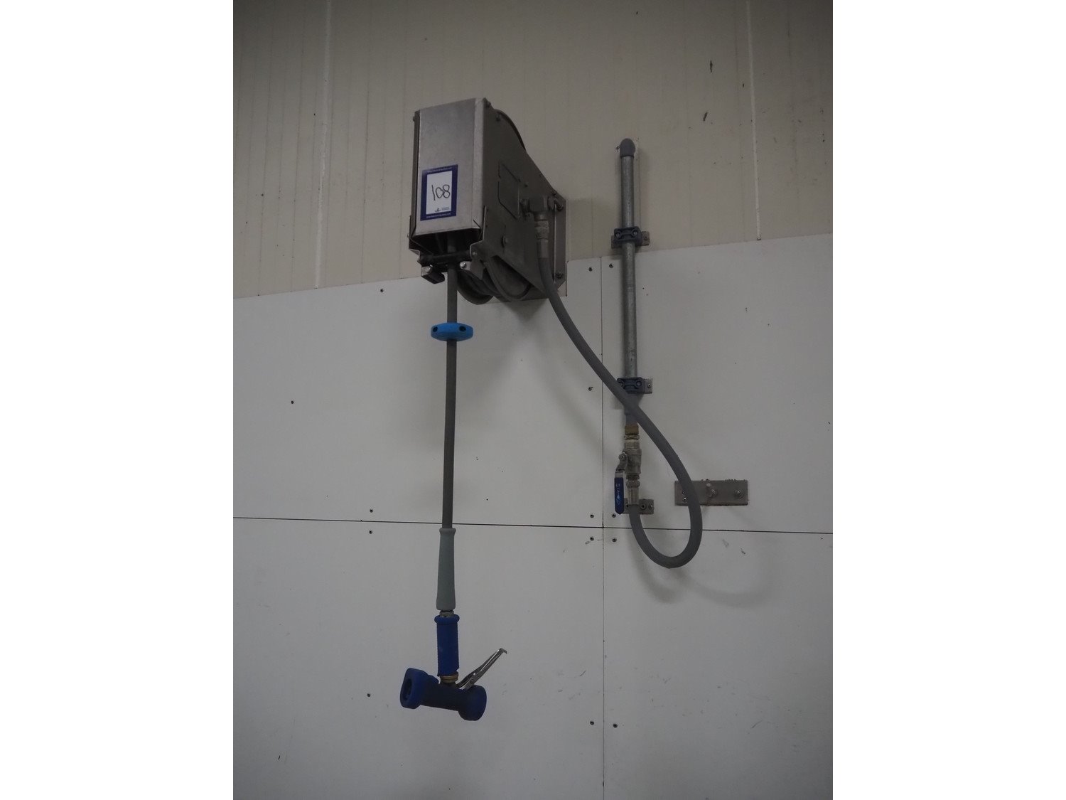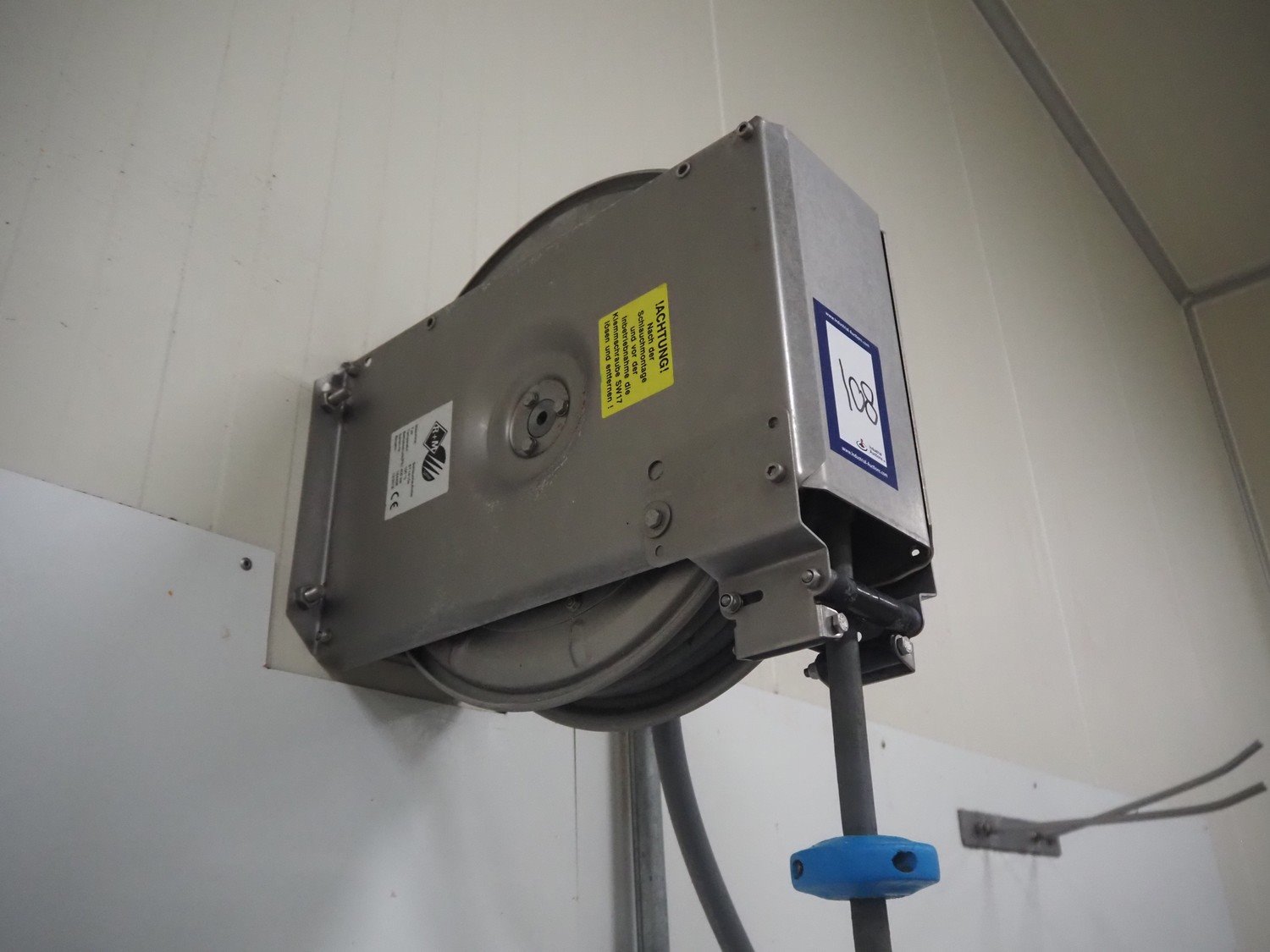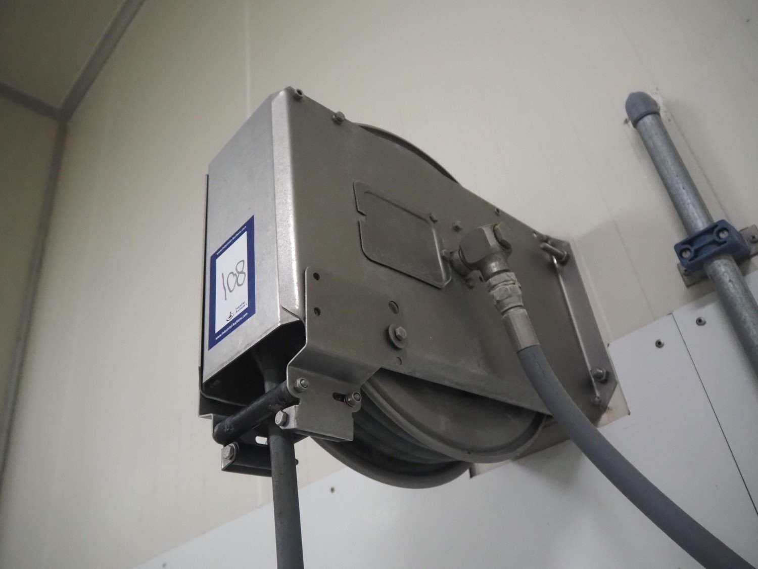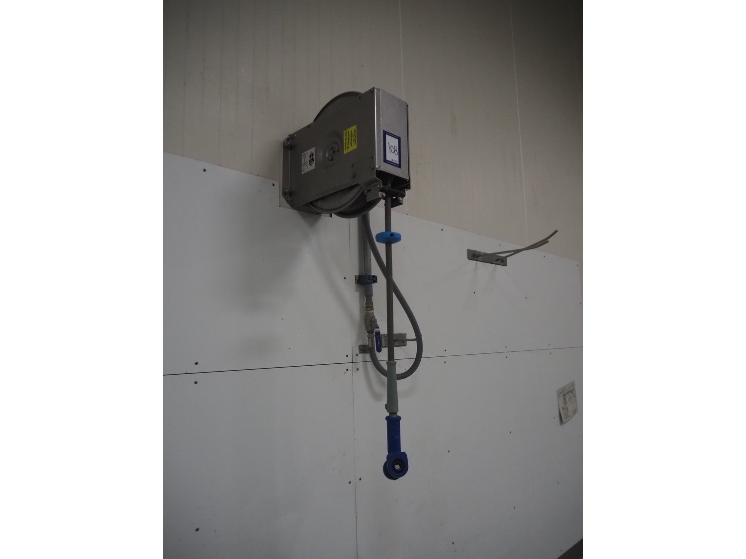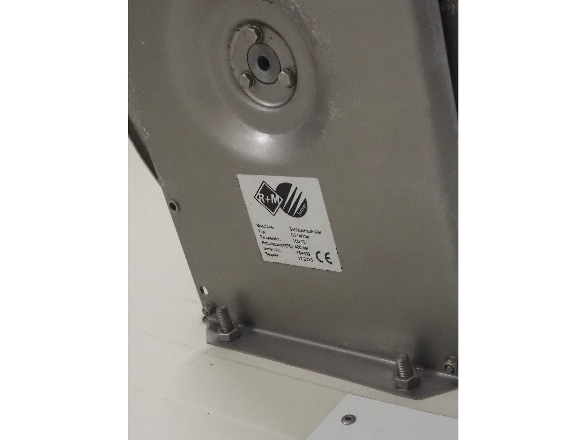 S/s hose reel with hose and pistol, dimensions: 430 mm x 230 mm x 420 mm.