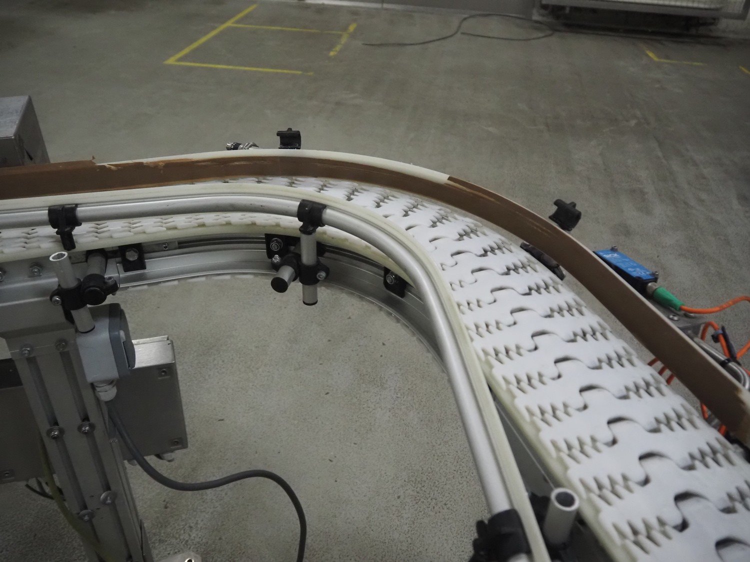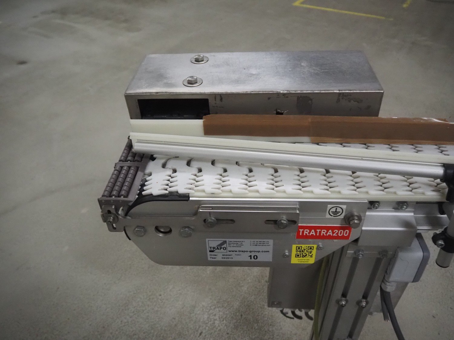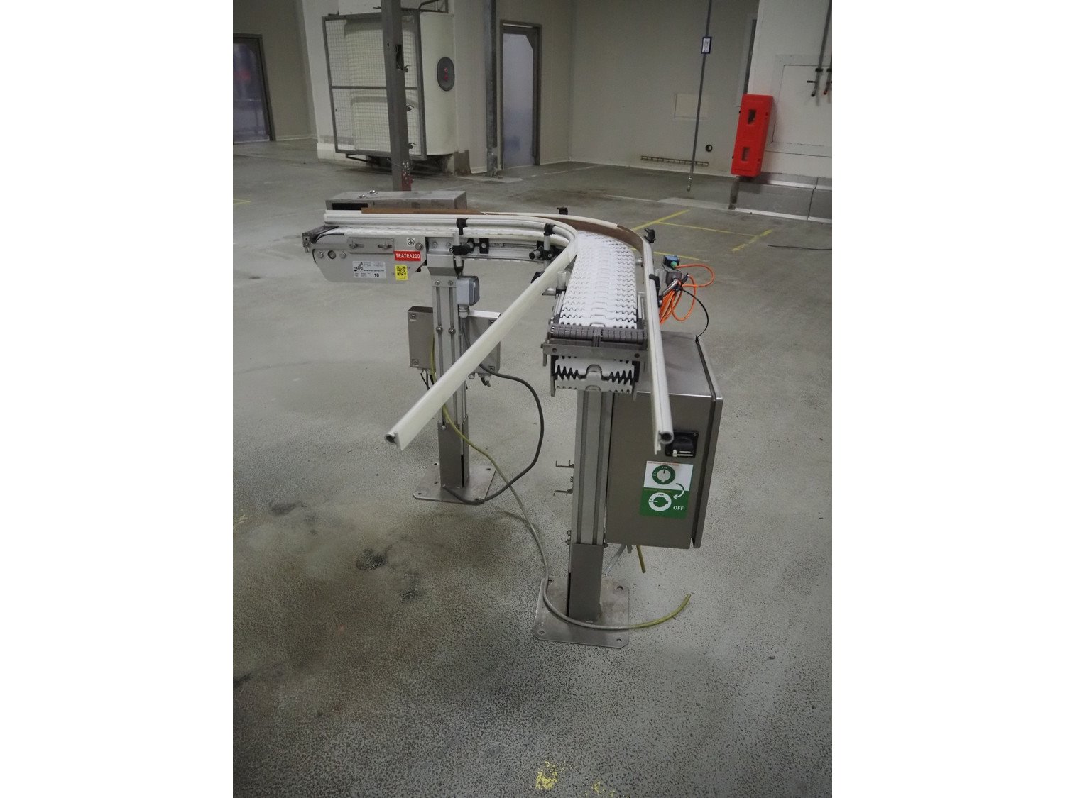 Trapo 90° curve conveyor, year of construction: 03/2013, plastic mesh belt, belt width: 140 mm, total dimensions: 1250 mm x 1200 mm x 930 mm.
