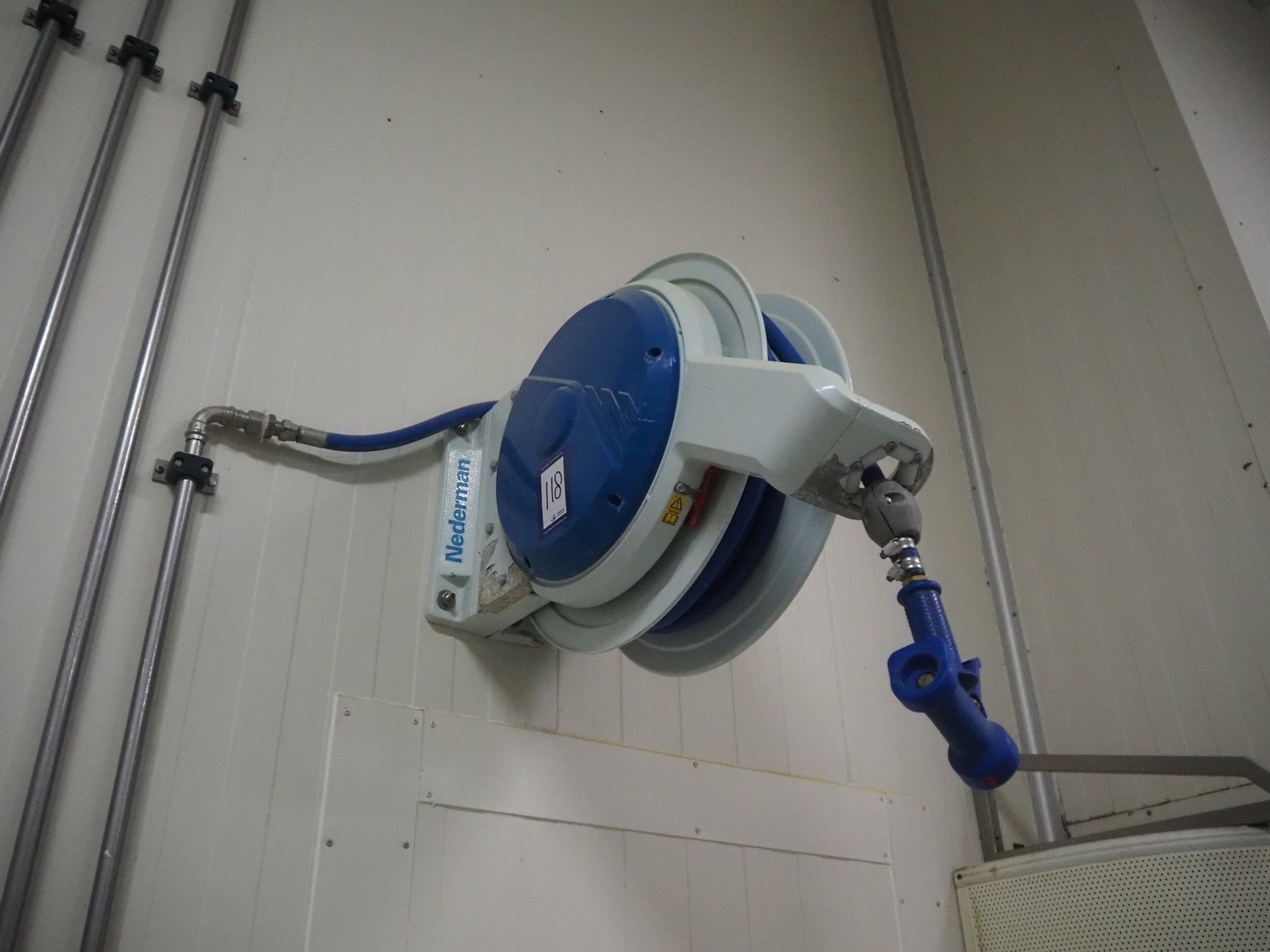 Nederman hose reel with pistol, dimensions: 730 mm x 300 mm x 550 mm.