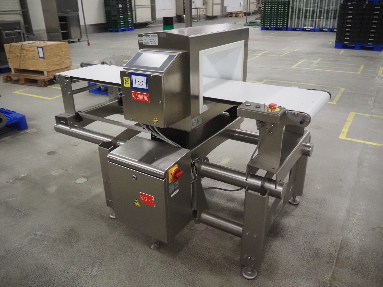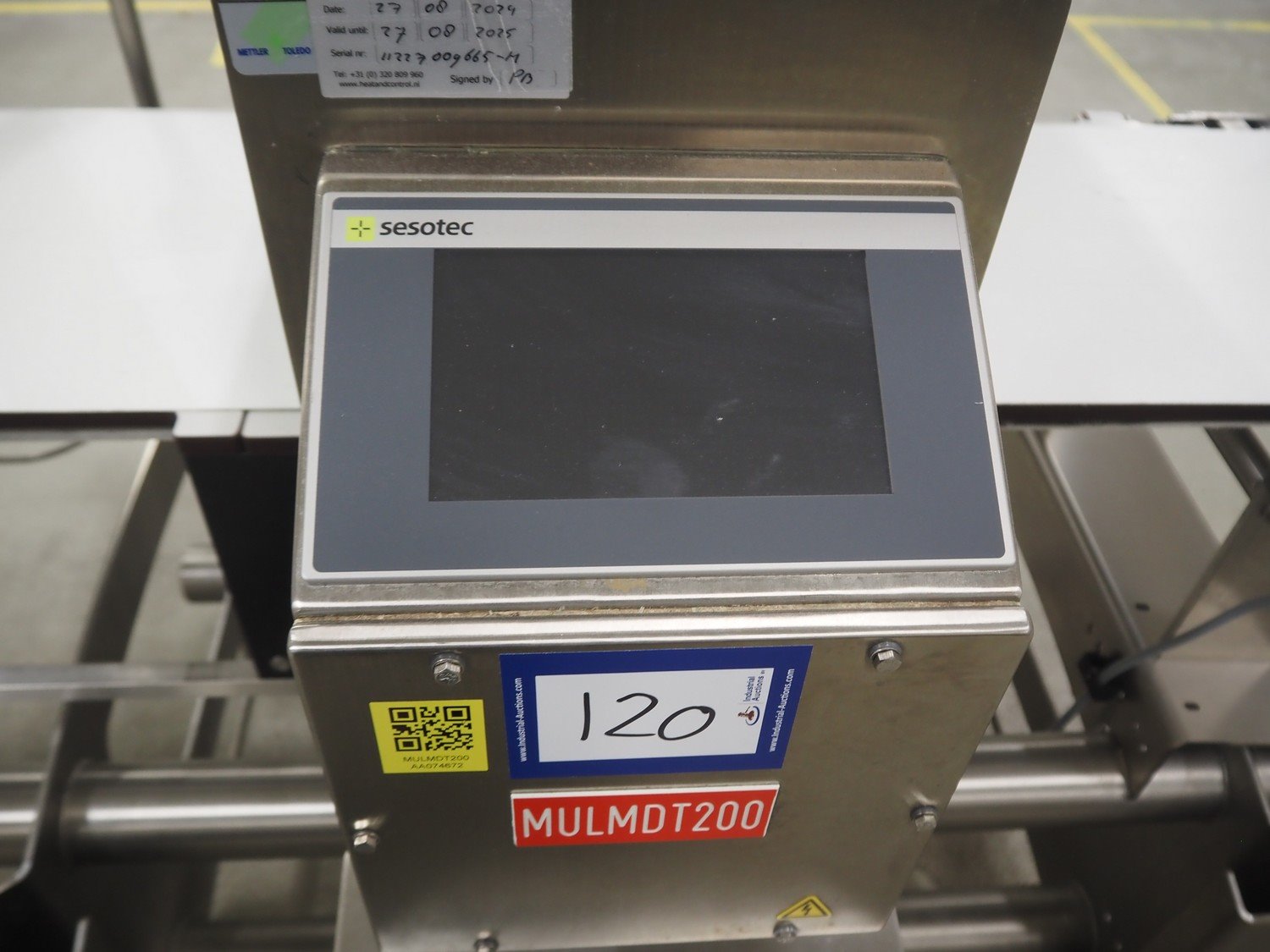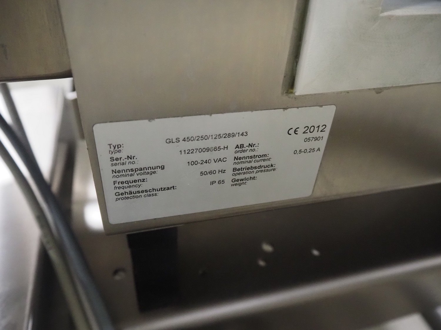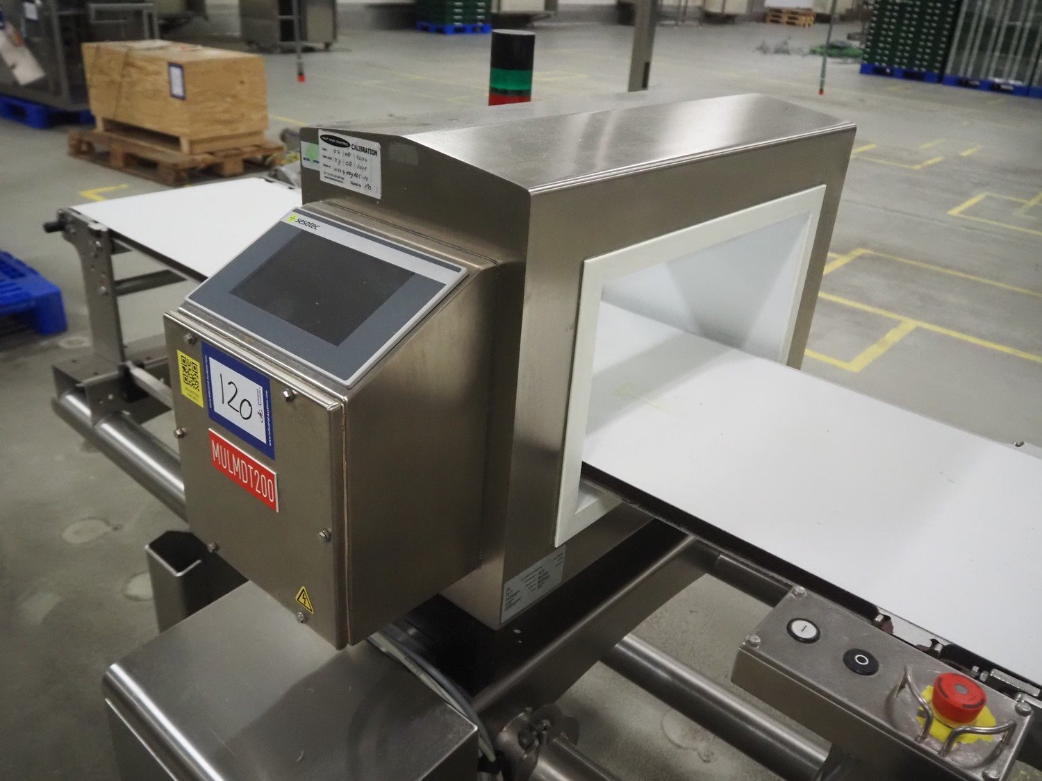 Sesotec metal detector, type: GLS 450/250/125/289/143, serial number: 11227009665-H, year of construction: 2012, 100-240 VAC, 50/60 Hz, 0.5-0.25 A, plastic belt, belt width: 390 mm, clearance: 450 mm x 200 mm, total dimensions: 1750 mm x 1000 mm x 1200 mm.