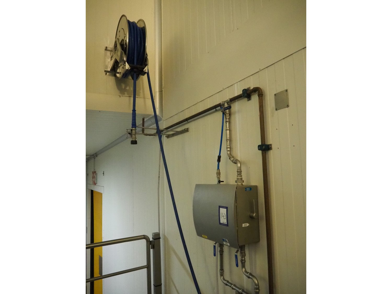 S/s hose reel with hose and pistol, dimensions: 430 mm x 230 mm x 420 mm.