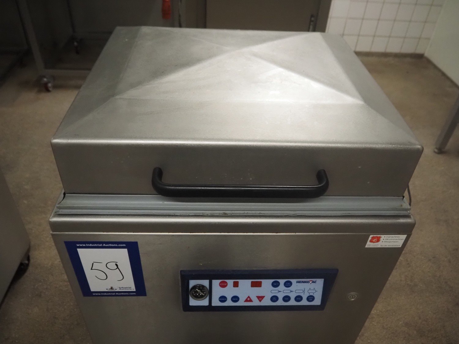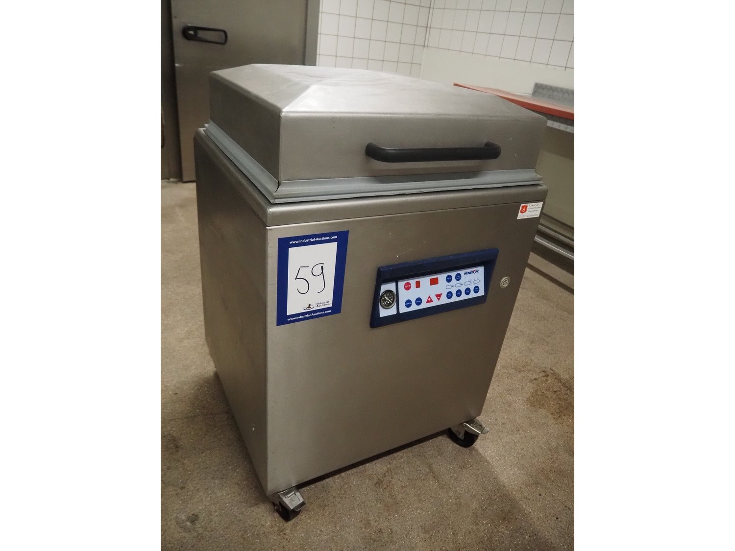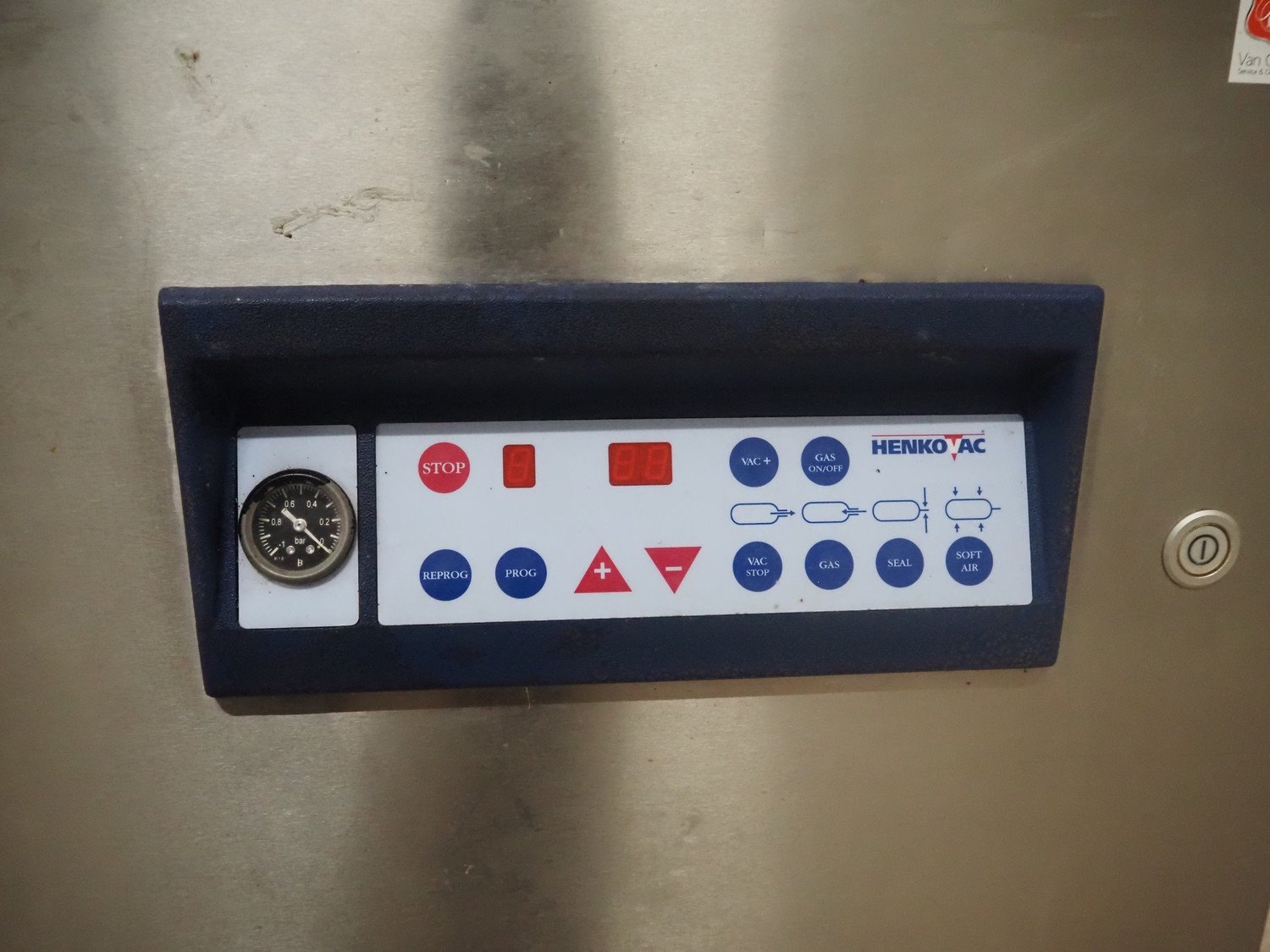 Henkovac mobile vacuum machine, type: E-202, number: 209068963, year of construction: 1998, 400 V, 3 Ph, 50 Hz, 9.4 A, 3.3 kW, seal length: (2x) 560 mm, dimensions chamber: 510 mm x 530 mm, Busch vacuum pump, total dimensions: 740 mm x 700 mm x 1100 mm. Kavel locatie: Hoofdweg 1623, 2157 PB Abbenes, Nederland
