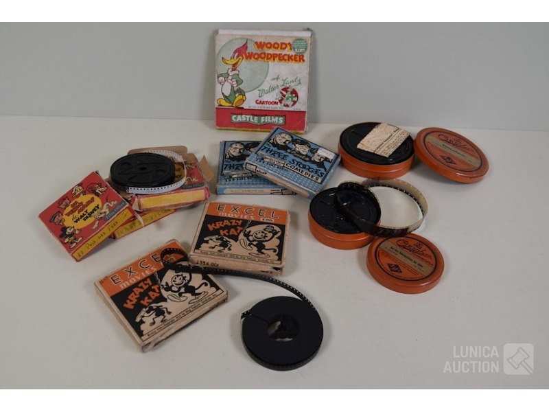 Ca. 10 stuks. Diverse titels.8mm films O.a. Diverse titels Walt Disney Film Office; Excel Movies Krazy Kat; Excel movies "the three stooges comedies"; Castle films "woody woodpecker", 453; enz. 2x Agfa Ozaphan 16 mm film, "U14022/B ,kletterpflanzen" en "S 14017/B Aus den Geheimnissen der natur" in metalen blik.