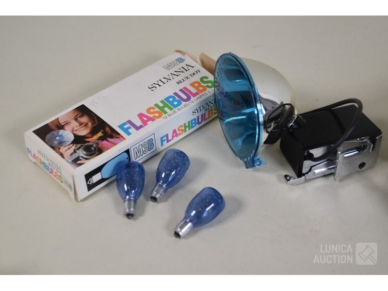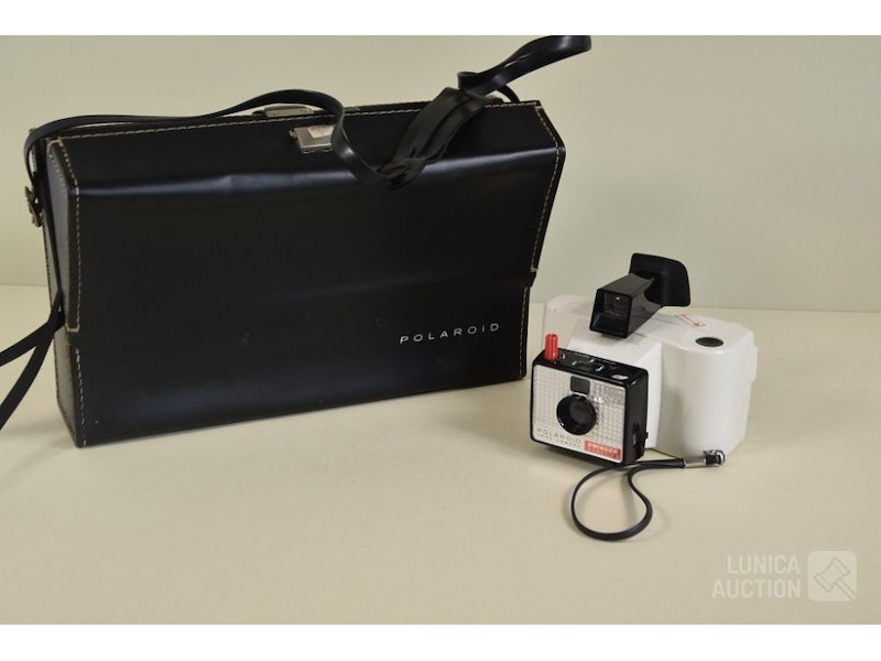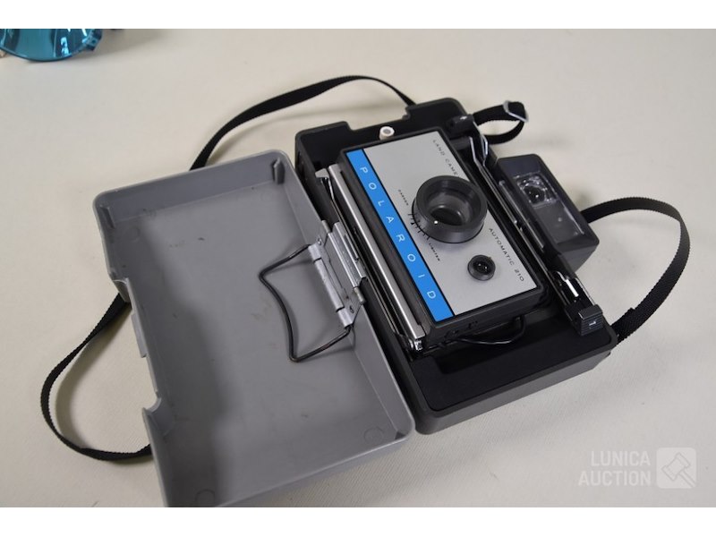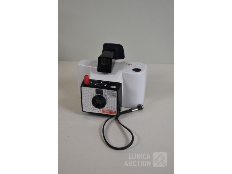 2 stuksPolaroid land camera Swinger model 20; Polaroid Land camera automatic 2010, in koffer met flitslamp model 268 en enkele Sylvania m3b Blue dot reservelampjes.