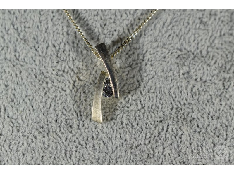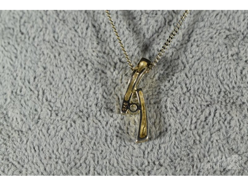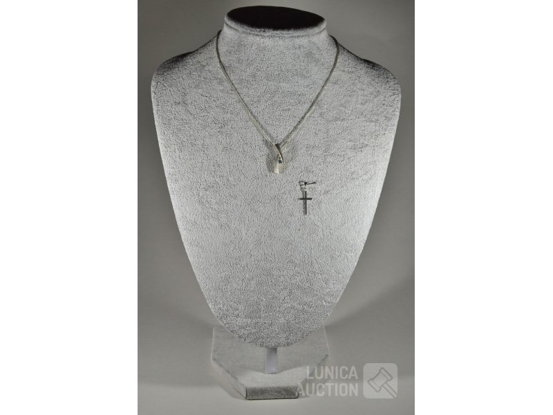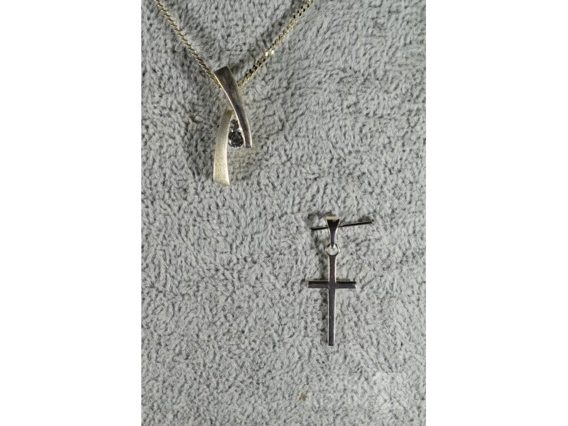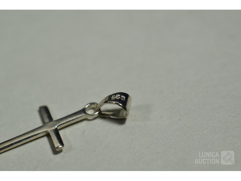 Halsketting met 2 hangers gemerkt 925Hanger in de vorm van kruis, afmeting 11x22 mm.; Hanger met inzet van briljantjes, afmeting 8x24 mm. Halsketting, lengte 36 cm. Totaal gewicht ca. 4,9 gram.